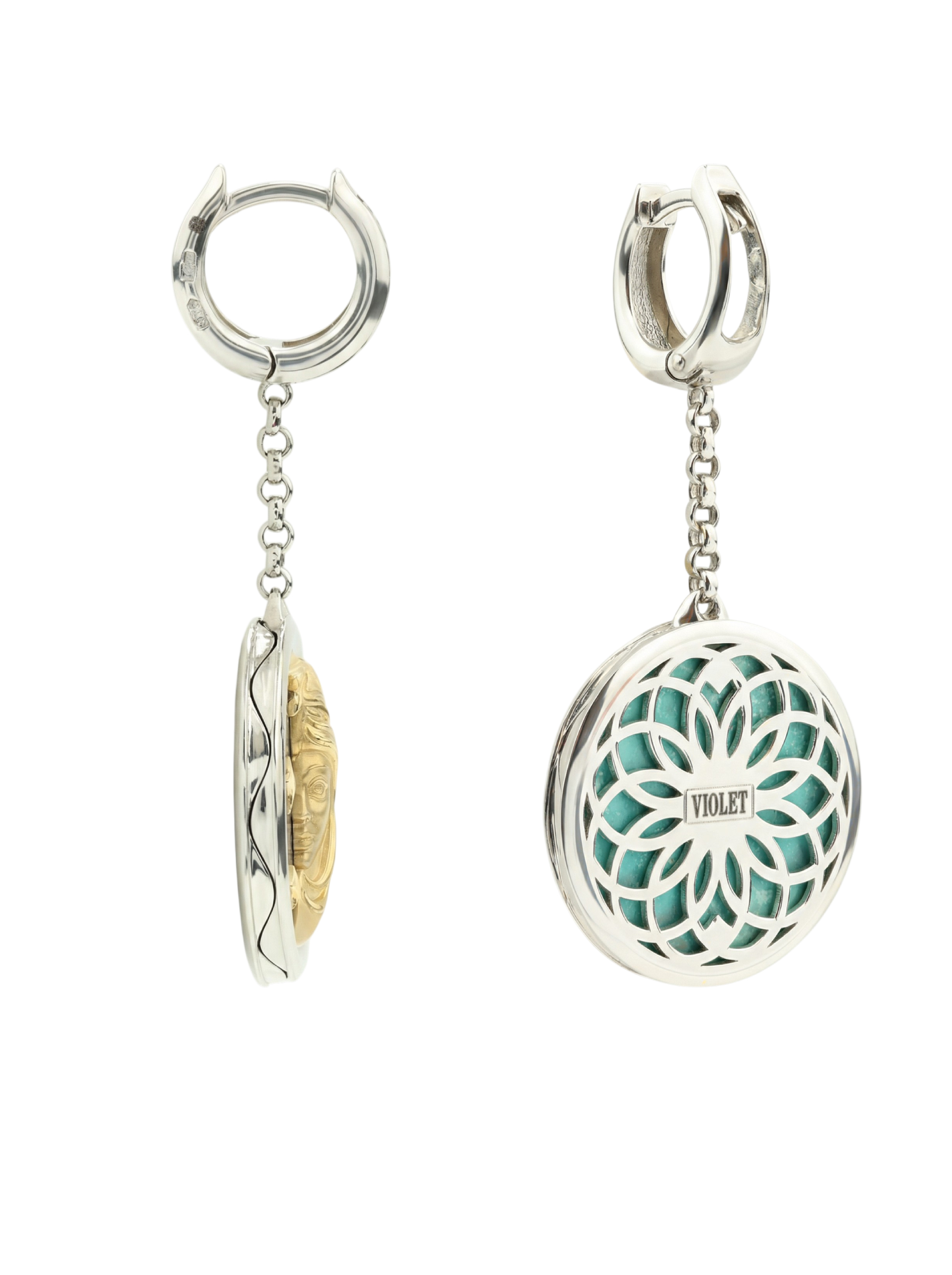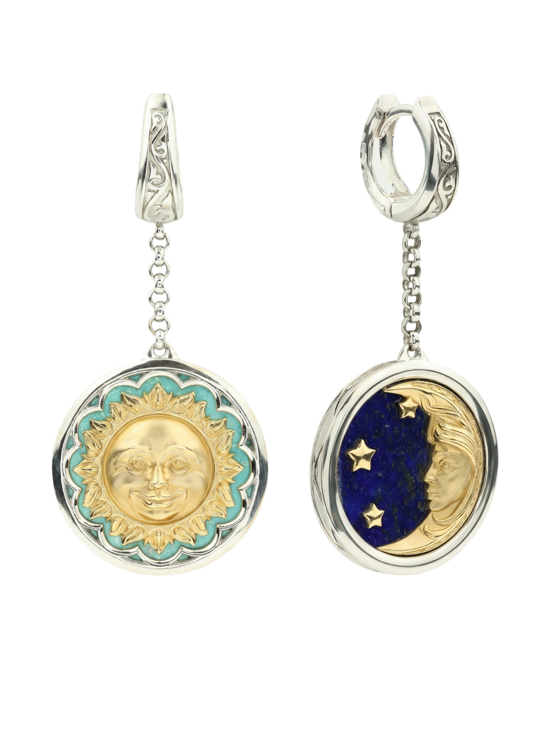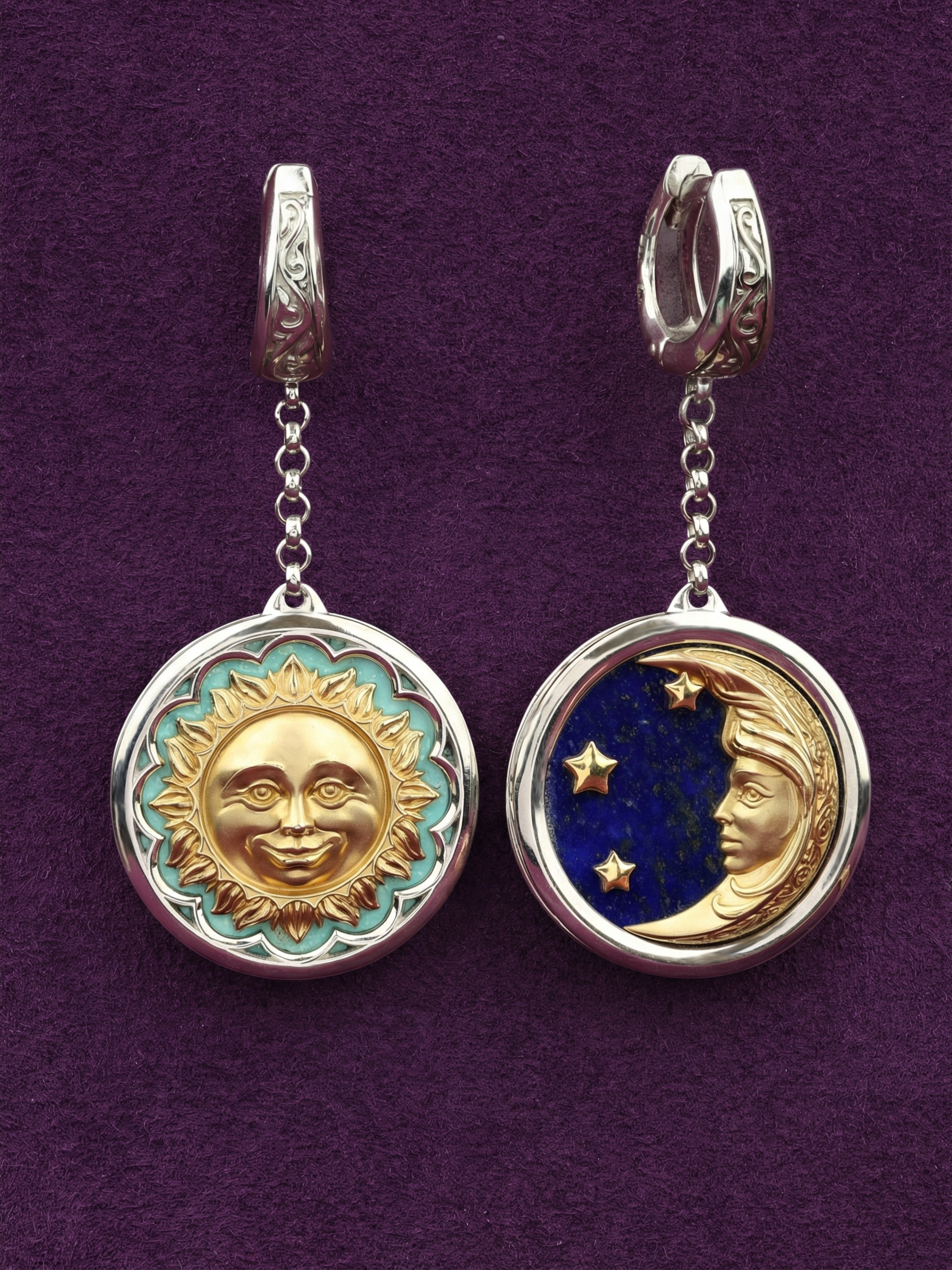Центральная композиция изделия представляет собой символичный дизайн солнце и луна. В одной серьге яркое солнце обрамлено бирюзой, чей бирюзовый оттенок подчеркивает тепло и сияние золотого рельефа. Вторая серьга воплощает ночную эстетику: здесь глубокий синий лазурит становится фоном для изящного полумесяца и звезд. Каждая вставка имеет круглую форму, что придает украшению гармоничный и завершенный вид. Всего в изделии использовано 2 вставки, акцентирующие внимание на мастерстве исполнения.