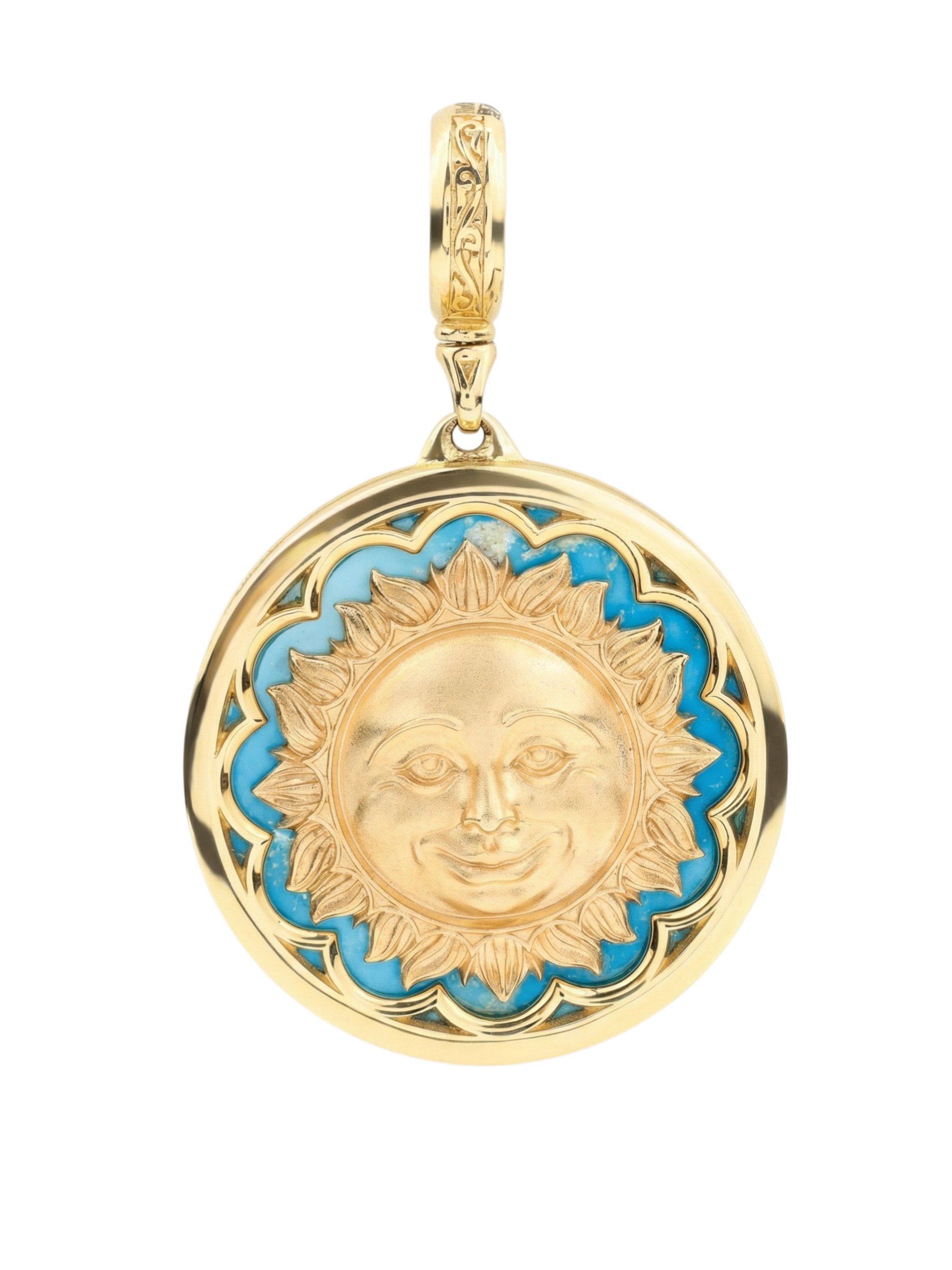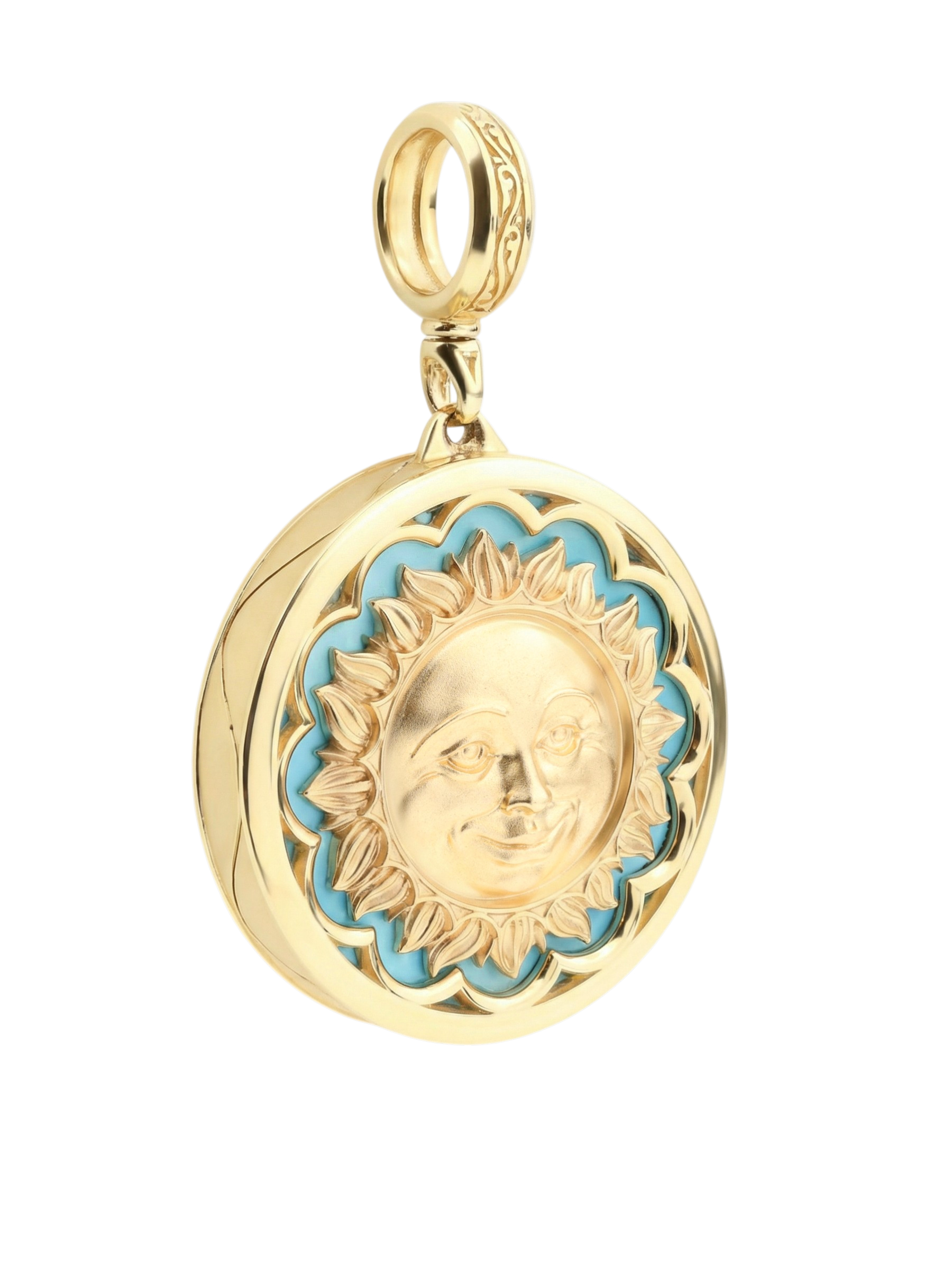 В качестве вставок в этой подвеске использованы натуральные камни глубоких оттенков — насыщенный синий лазурит и яркая бирюза. Всего изделие содержит 2 вставки круглой формы, которые контрастируют с благородным блеском металла, добавляя акцент таинственности и глубины. Лимонный оттенок золота придает украшению особую статусность и теплое сияние, подчеркивая высокое качество исполнения каждой детали.