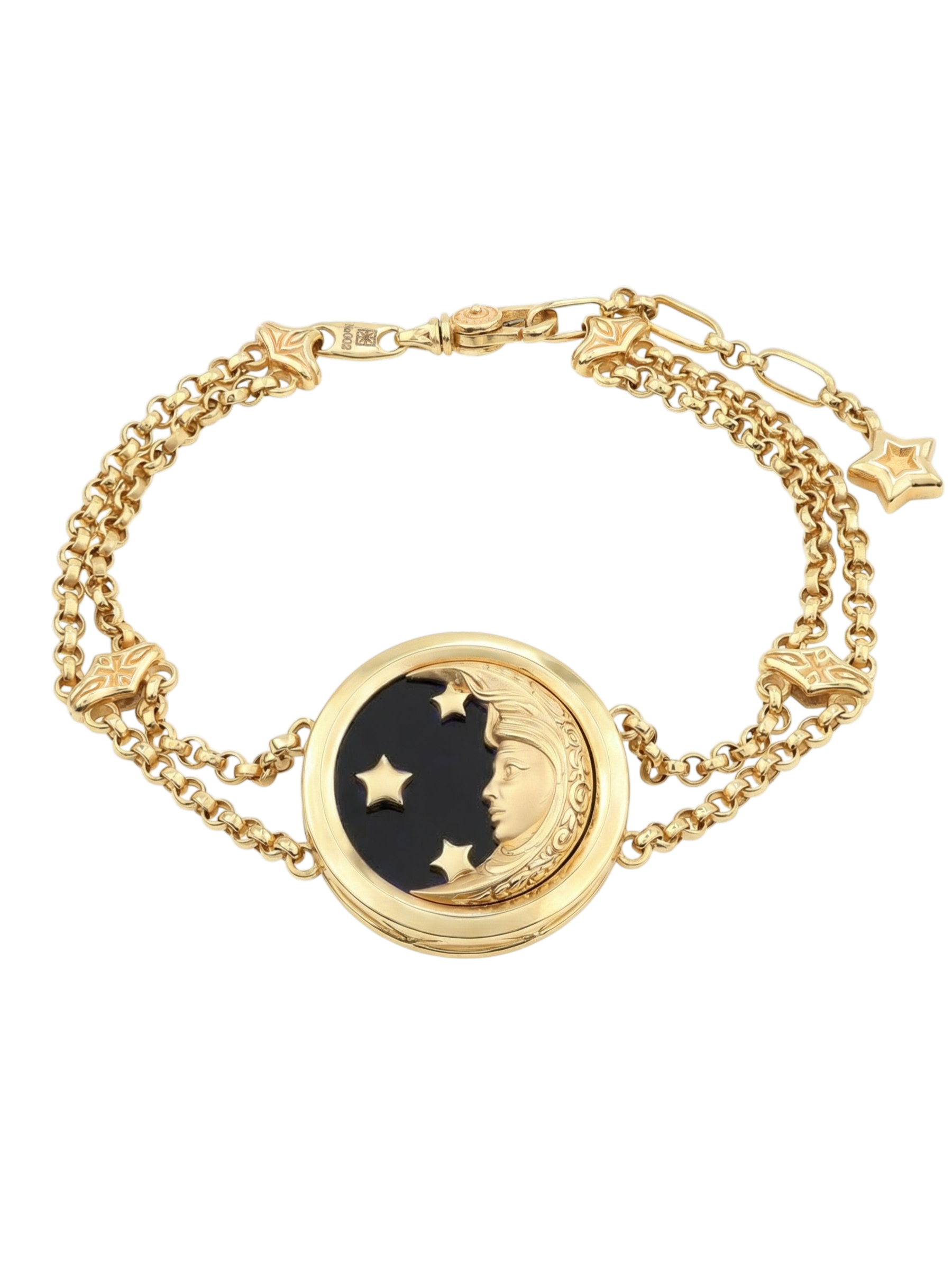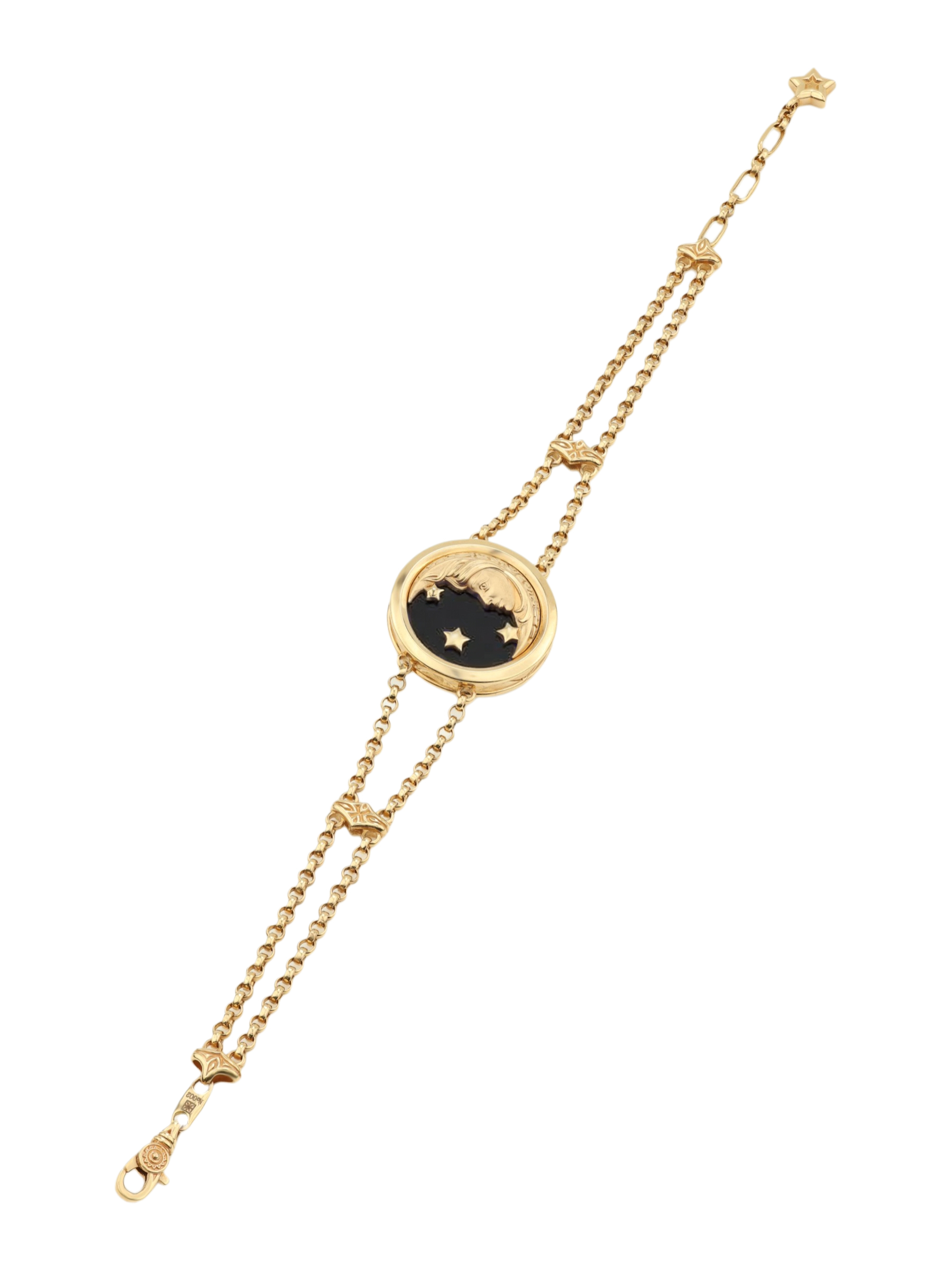 Круглая вставка из черного оникса служит идеальным фоном для золотых деталей, а перламутр добавляет изделию мягкости и деликатного сияния. Гармоничное сочетание черного и светлого цветов вставок создает эффект игры света, что делает браслет по-настоящему притягательным. Это универсальное украшение, которое подходит как для женщин, так и для мужчин, предпочитающих стильные аксессуары с глубоким смыслом.