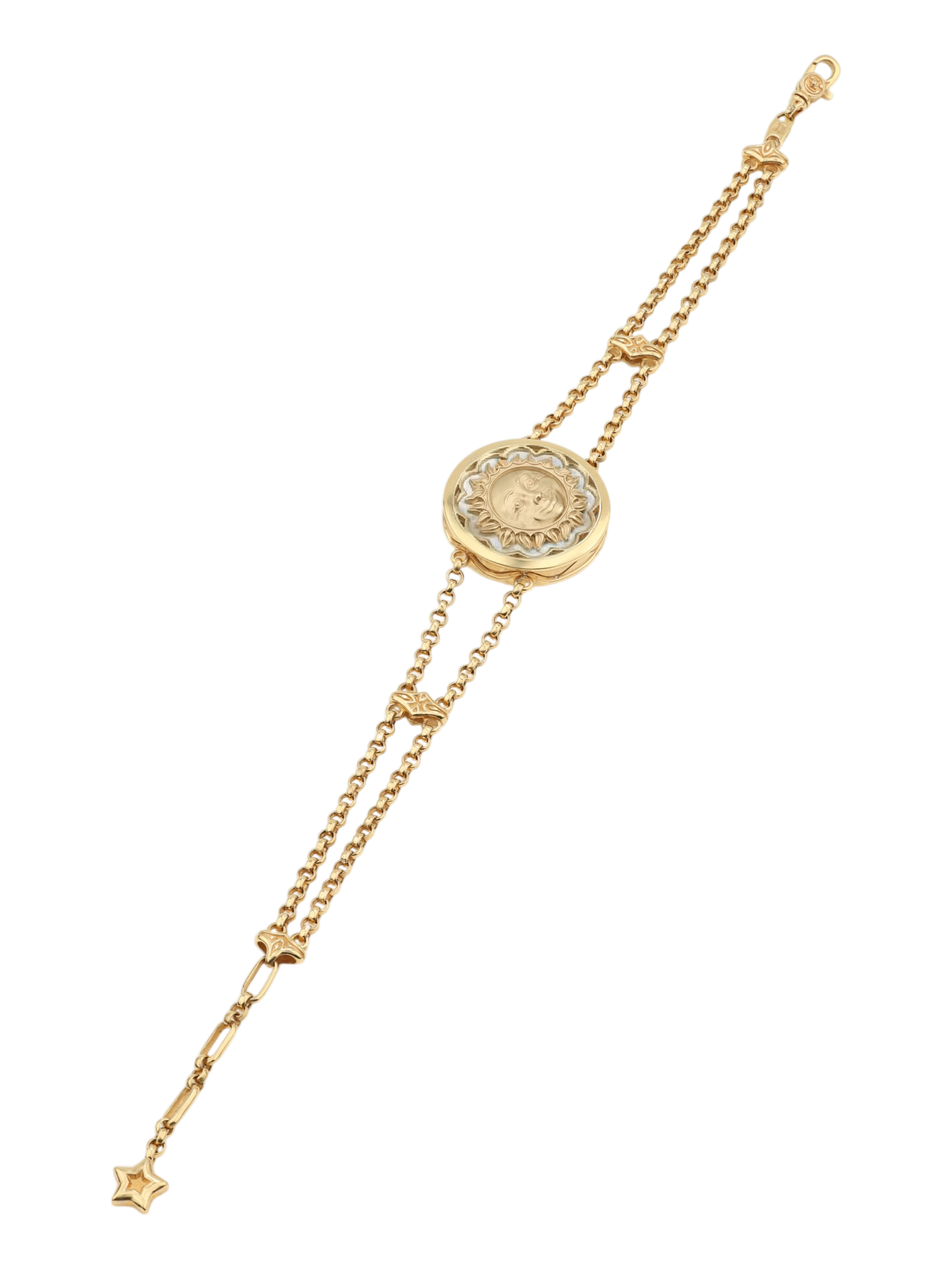 Элегантный и символичный браслет из коллекции De luxe Premium — День и ночь станет изысканным акцентом в любом образе. Ювелирное изделие выполнено из лимонного золота 585 пробы, которое благородно сияет и подчеркивает статус владельца. Центральный элемент украшения привлекает внимание своим сложным дизайном в тематике солнце/луна, объединяя в себе контрастные оттенки и материалы.