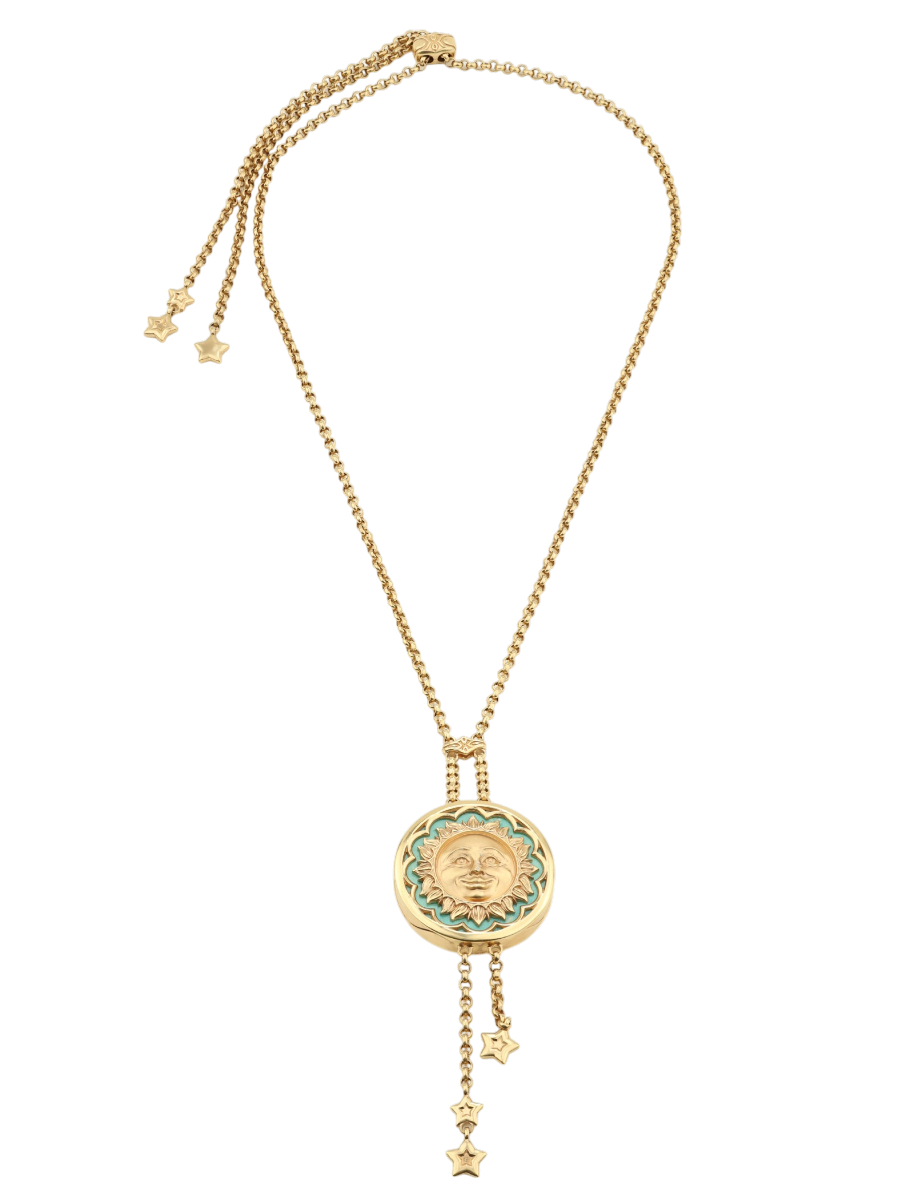 Элегантное колье из лимонного золота 585 пробы станет центральным акцентом вашего образа, воплощая в себе гармонию небесных светил. Это изысканное украшение из коллекции De luxe Premium — День и ночь выполнено в выразительном дизайне солнце и луна, который подчеркивает глубокую символику вечного движения времени. Центральная часть изделия представляет собой сочетание благородного лимонного золота с насыщенными вставками из бирюзы и лазурита, создающими завораживающий контраст бирюзового и синего цветов.