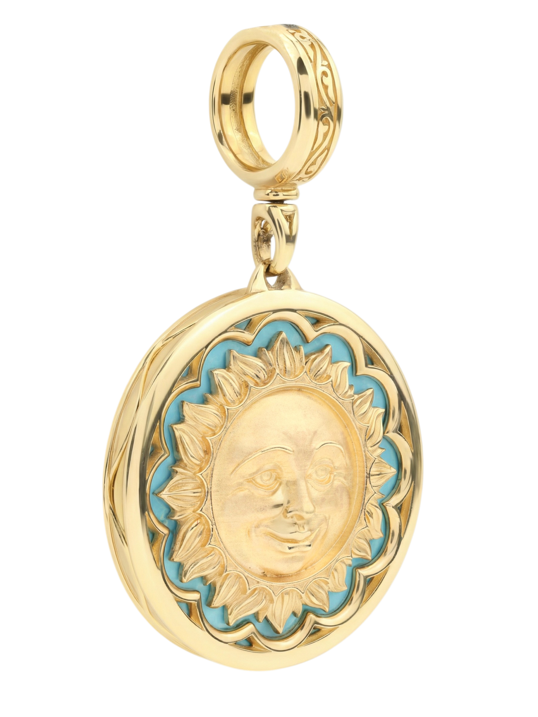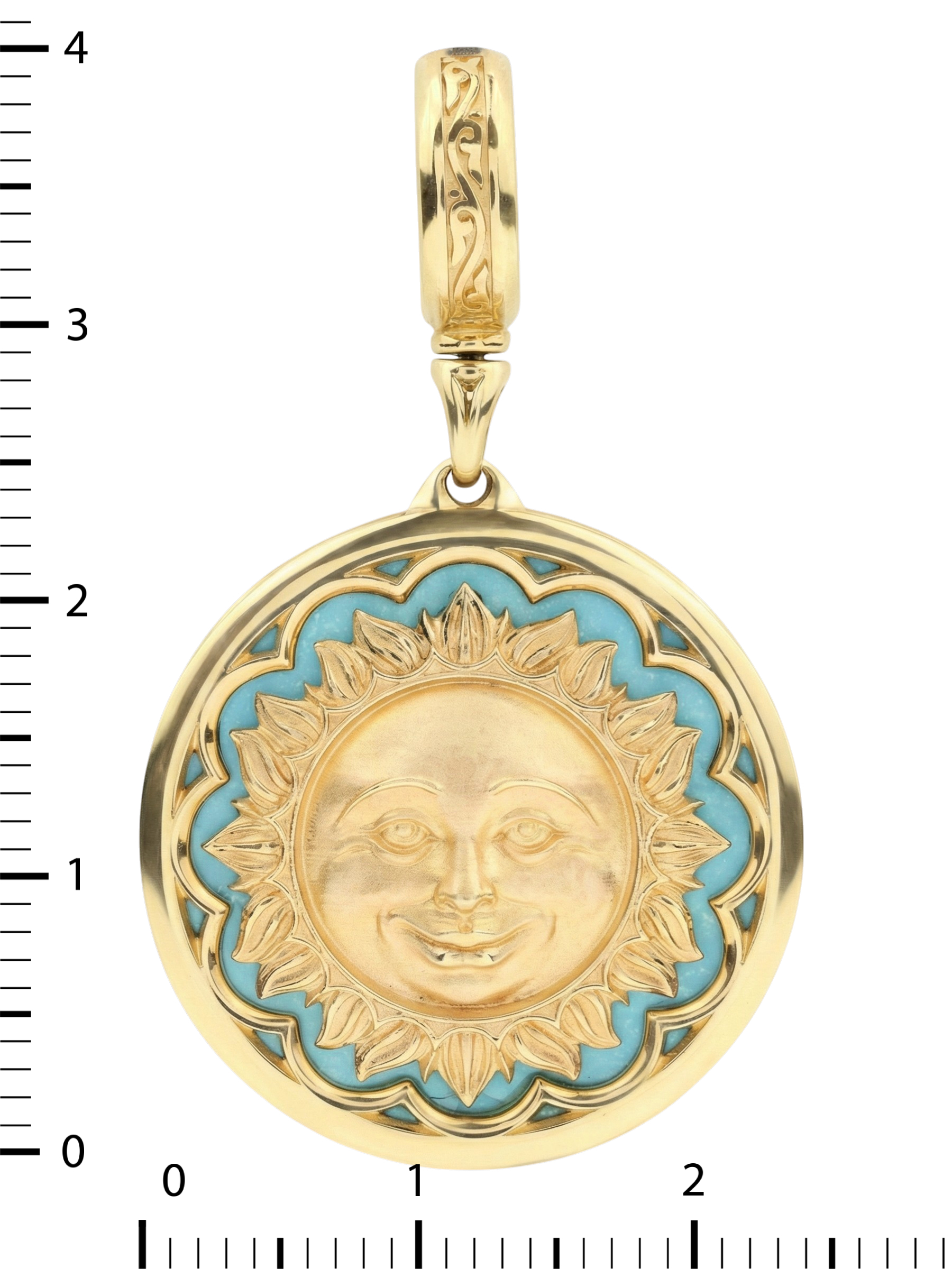Изысканная подвеска из лимонного золота 585 пробы из коллекции De luxe Premium — День и ночь станет акцентным украшением вашего образа. Дизайн изделия объединяет в себе символику солнца и луны, создавая глубокий и притягательный визуальный образ. Центральным элементом украшения выступает одна вставка из бирюзы круглой формы, чей нежный бирюзовый цвет гармонично контрастирует с теплым оттенком лимонного золота. Такое сочетание материалов придает ювелирному изделию особую выразительность и благородство.