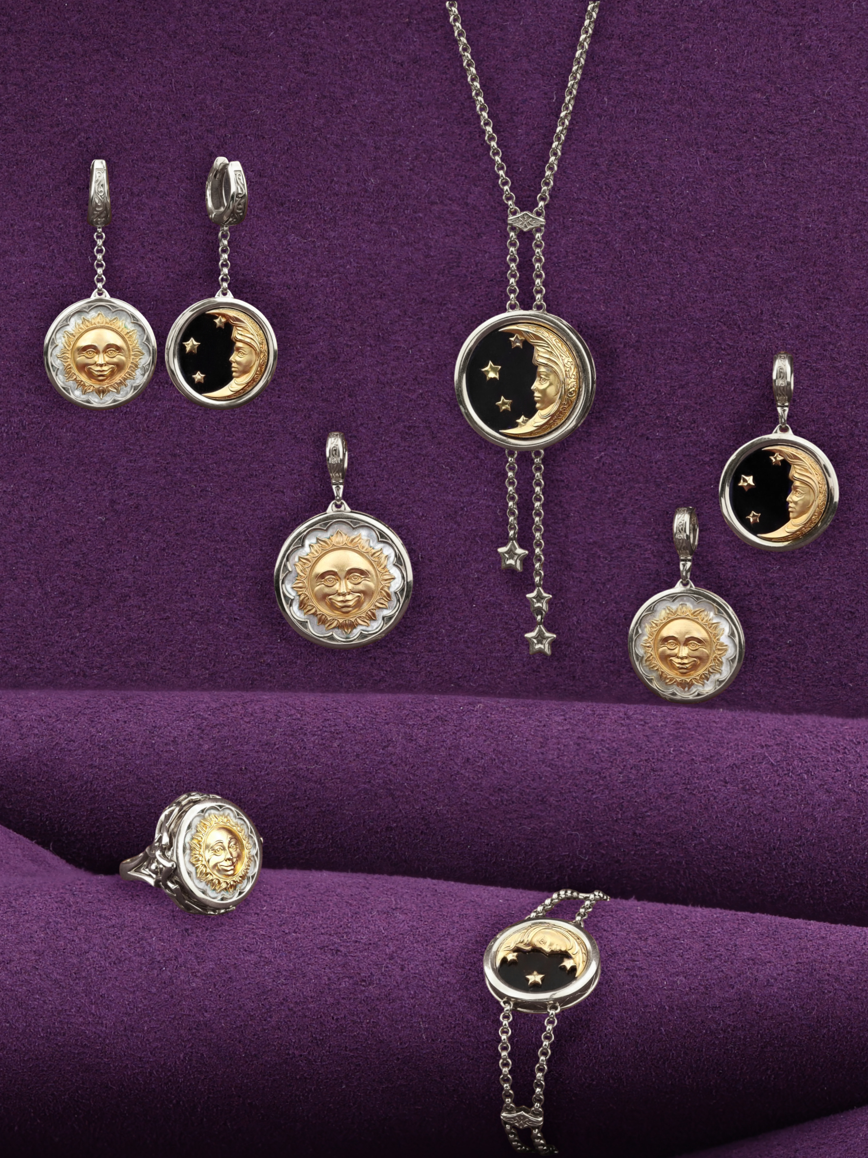 Подвеска из белого золота с ониксом — это воплощение таинственности и изысканного ювелирного искусства. Изделие из коллекции De luxe Premium — День и ночь приковывает взгляд глубоким контрастом материалов и оригинальным художественным решением. Центральным элементом композиции является вставка из оникса черного цвета, которая служит выразительным фоном для декоративного дизайна в виде солнца и луны. Металлические детали, выполненные из белого золота 585 пробы, гармонично обрамляют вставку круглой формы, создавая элегантный силуэт.