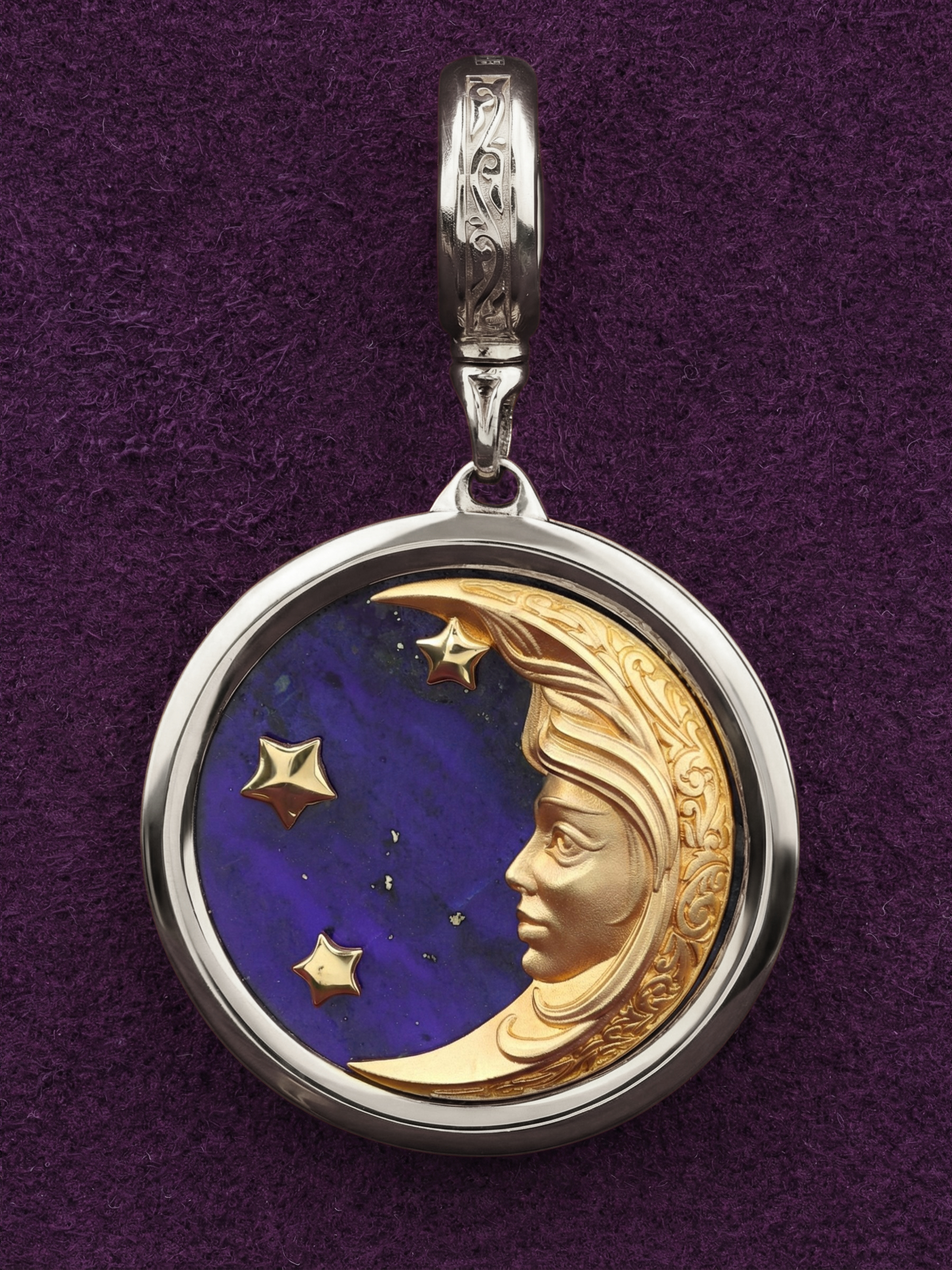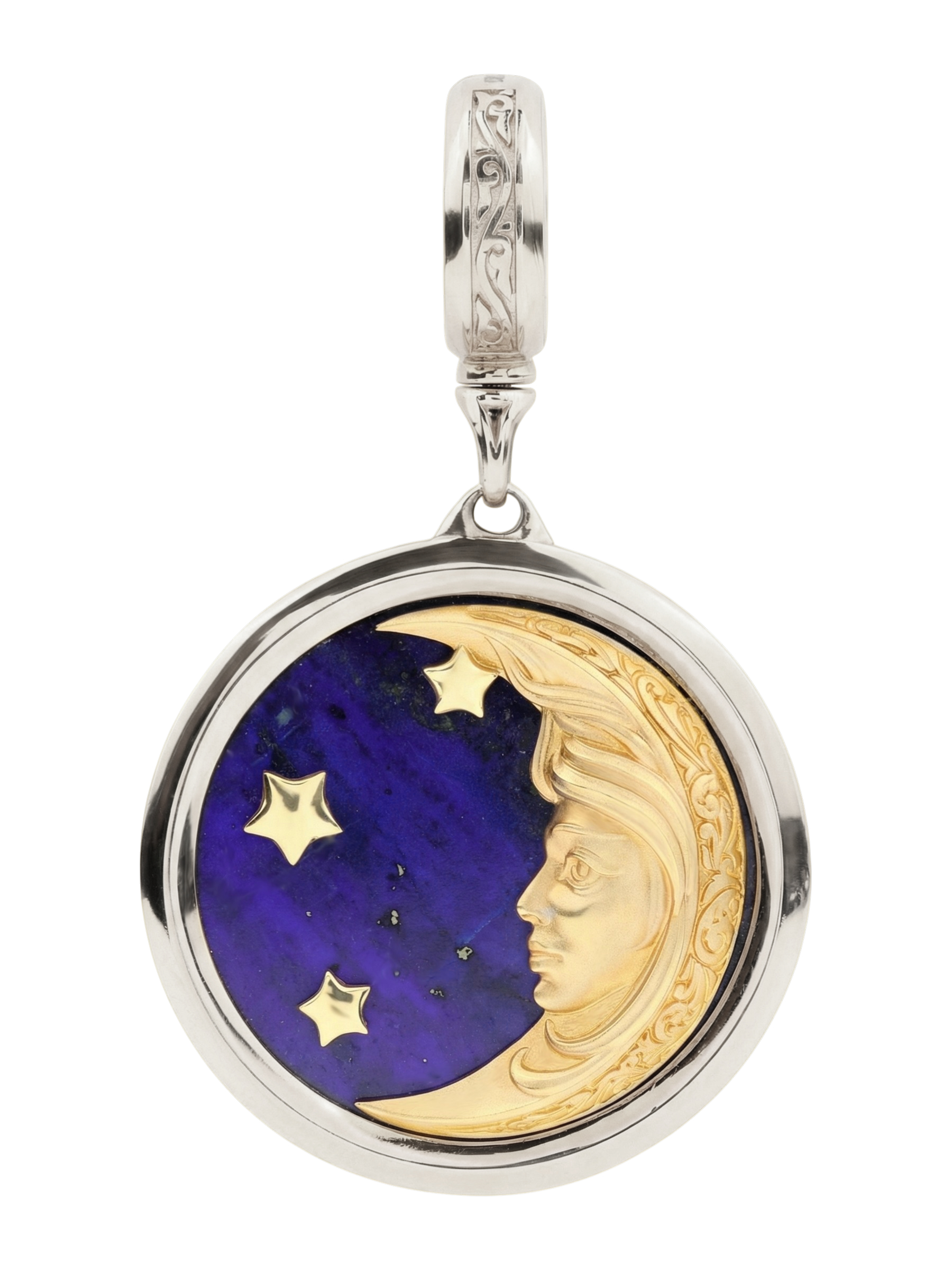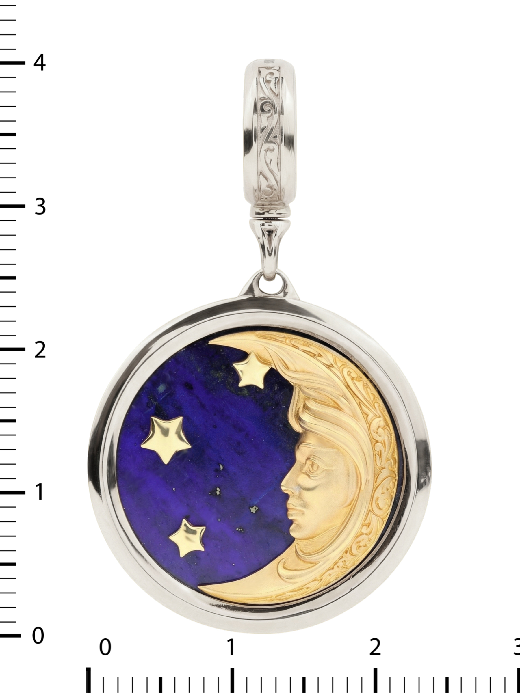 Подвеска из белого золота 585 пробы — это изысканное ювелирное украшение, которое станет воплощением элегантности и мистической красоты в вашем образе. Дизайн изделия вдохновлен небесной тематикой и выполнен в форме символичного дуэта солнца и луны, где детально проработанный профиль луны подчеркивает художественную глубину украшения. Глубокий синий цвет натурального лазурита, имеющего круглую форму, создает эффект ночного неба, на фоне которого сияют золотые звезды.