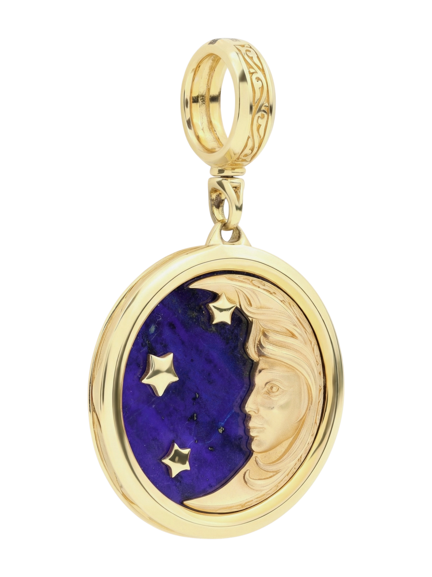 Откройте для себя магию небесных светил в авторской подвеске, вошедшей в коллекцию De luxe Premium — День и ночь. Это изысканное украшение выполнено из лимонного золота 585 пробы и станет воплощением утонченного стиля и глубокого символизма. Центральным элементом композиции является завораживающий дизайн Солнце/луна, где рельефное изображение небесного лика гармонично сочетается с глубоким синим цветом вставки — натуральным лазуритом.