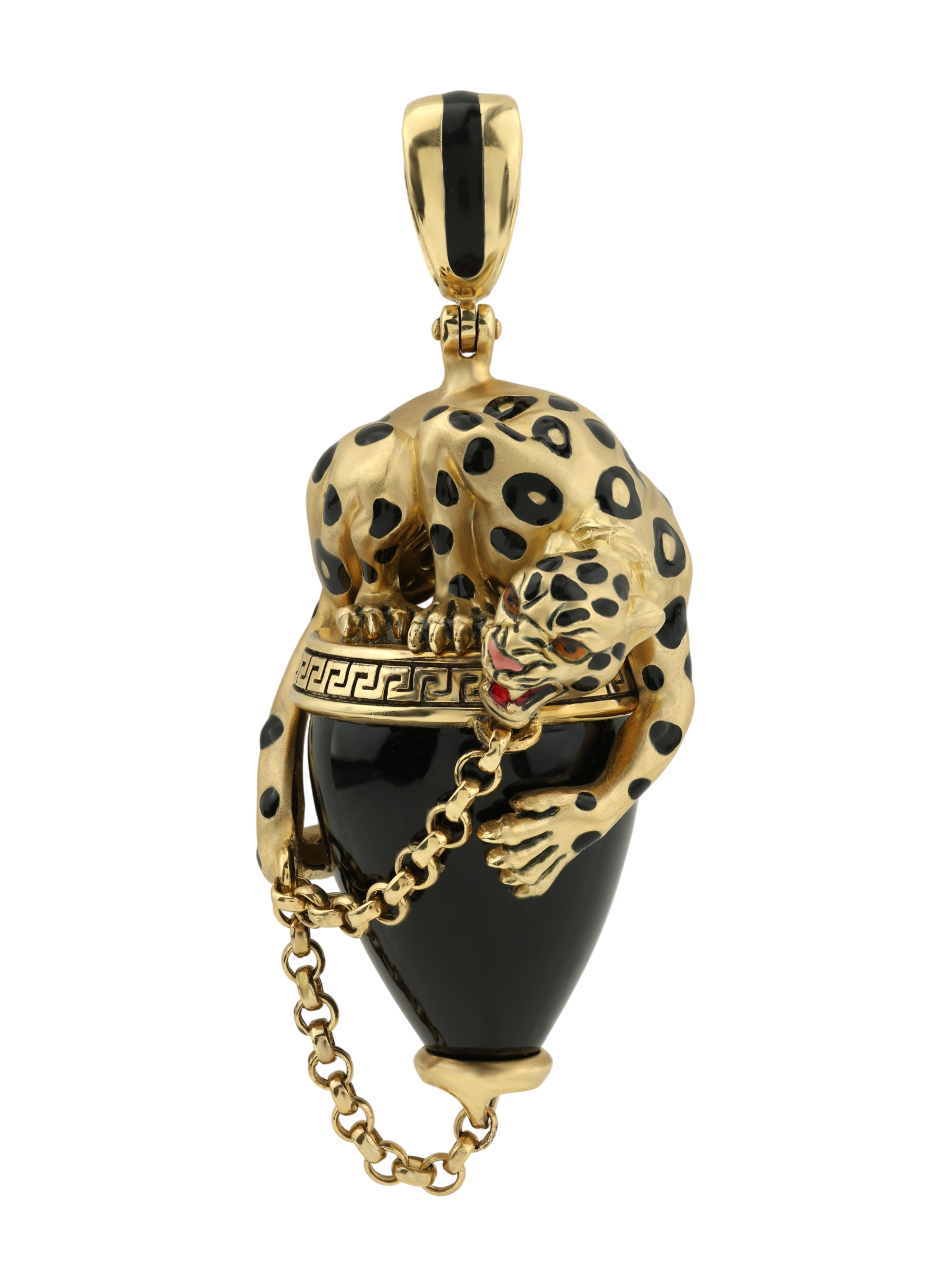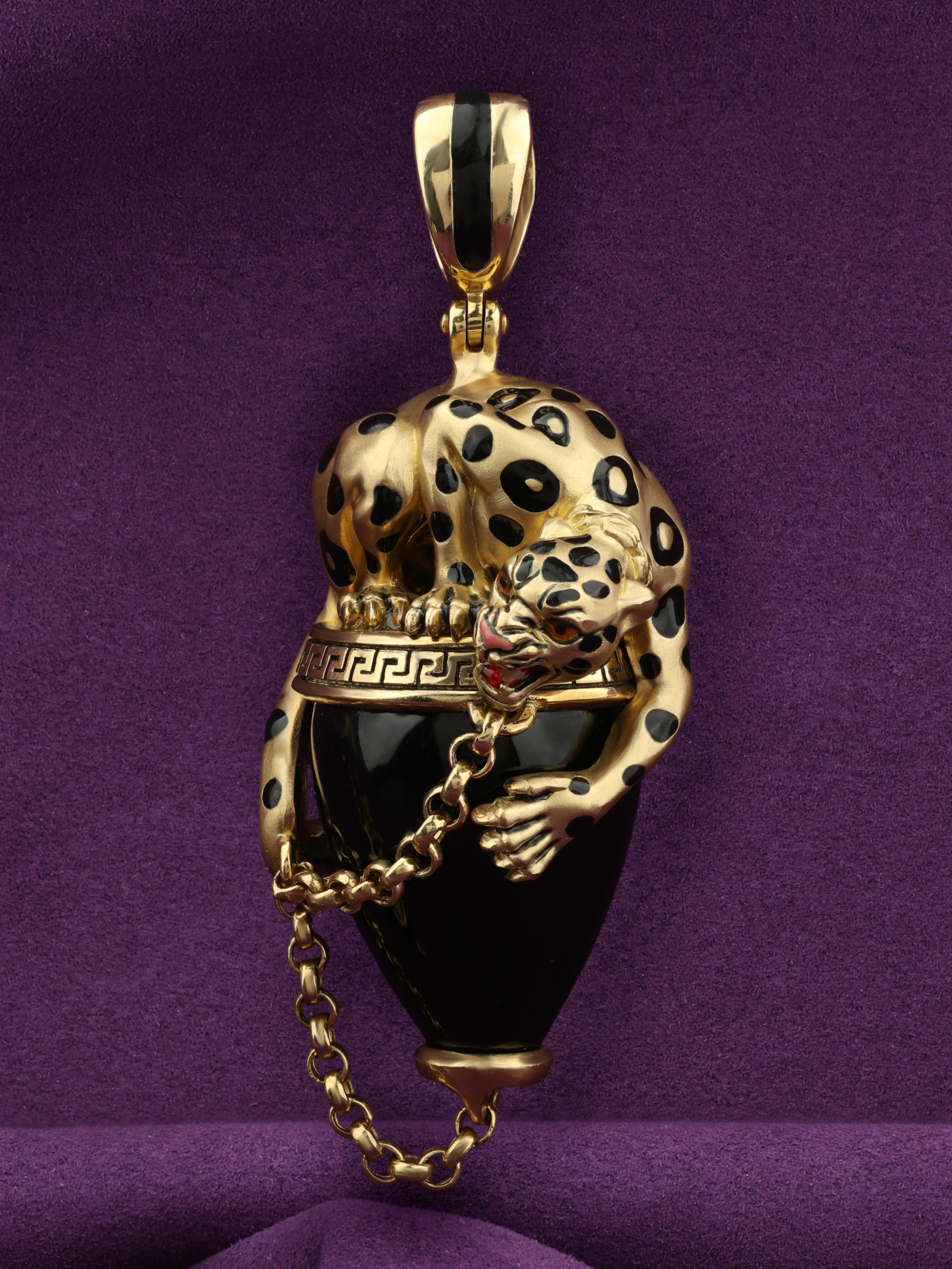 Особую художественную ценность изделию придает детальная проработка: пятнистый окрас хищника искусно передан с помощью ювелирной эмали, подчеркивающей природную красоту зверя. Сочетание лимонного золота с черными вставками и эмалевым декором делает эту подвеску акцентным аксессуаром, который добавит образу харизмы и статусности. Это украшение подойдет как для женщин, так и для мужчин, предпочитающих необычные и запоминающиеся ювелирные изделия.