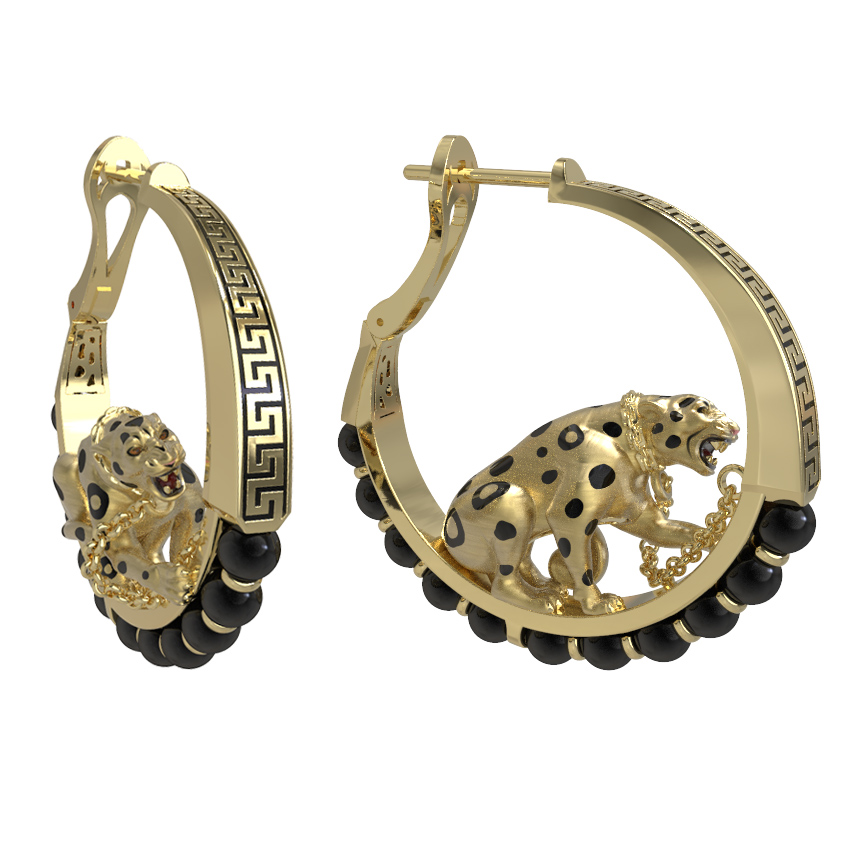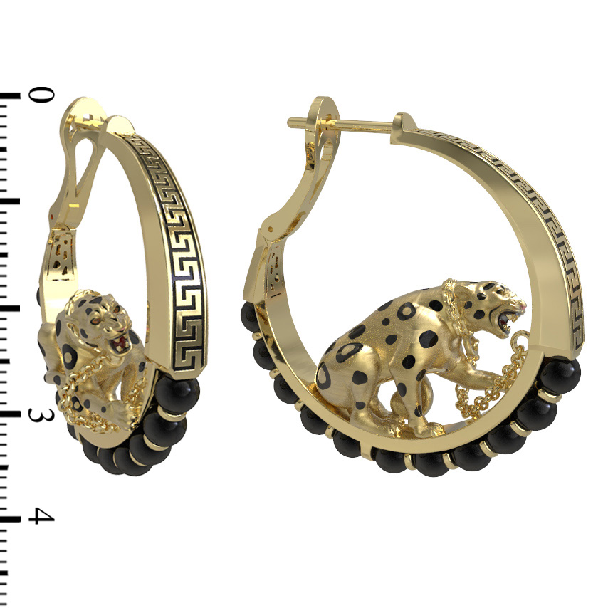 Композицию дополняют 22 вставки из оникса черного цвета, имеющие форму бусин, которые изящно обрамляют основу серьги. Сочетание благородного лимонного золота и насыщенного оникса придает изделию величественный вид. Эти серьги — универсальный выбор, ведь они подходят как для женщин, так и для мужчин, предпочитающих смелые и статусных аксессуары в своем гардеробе.