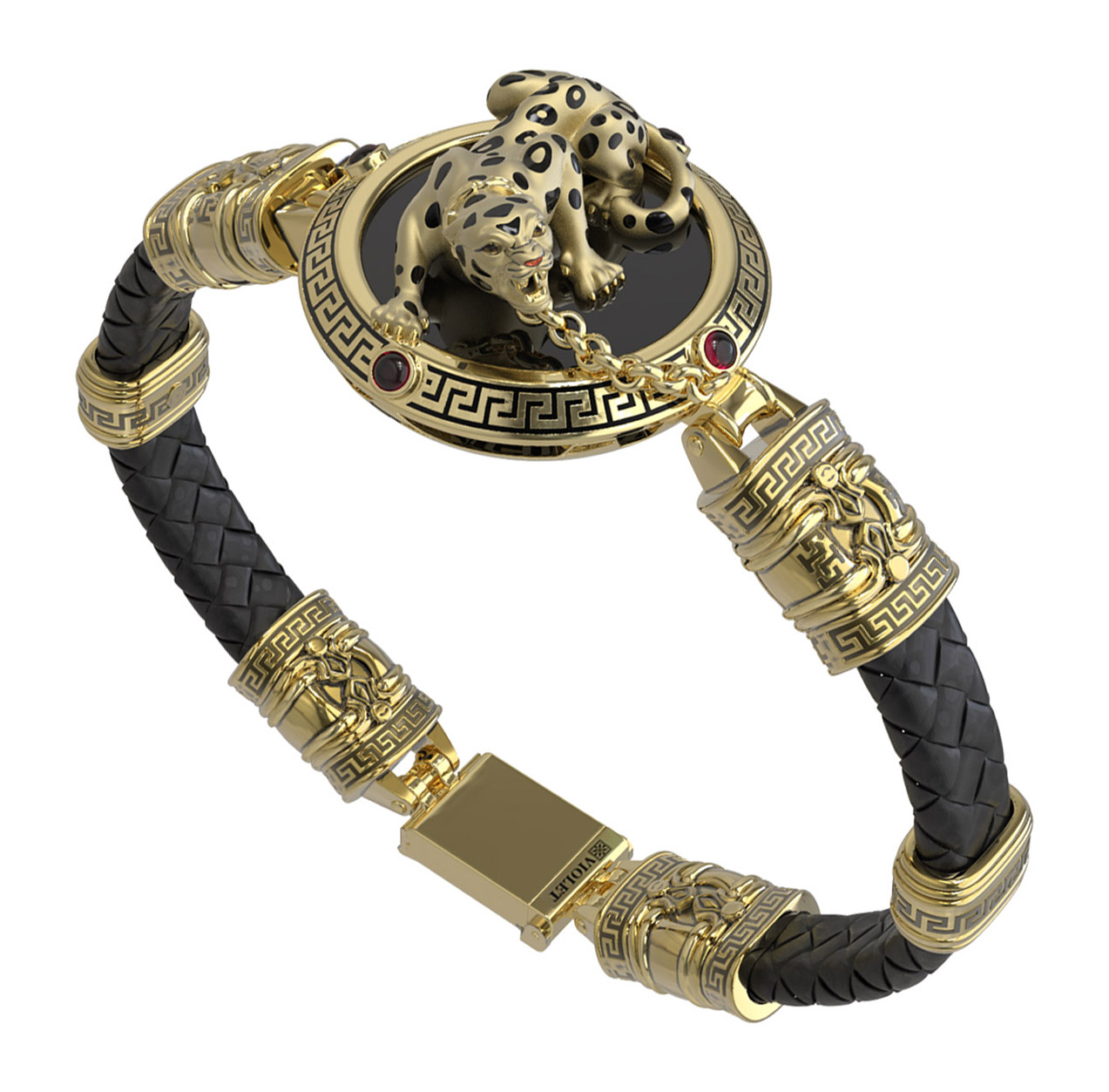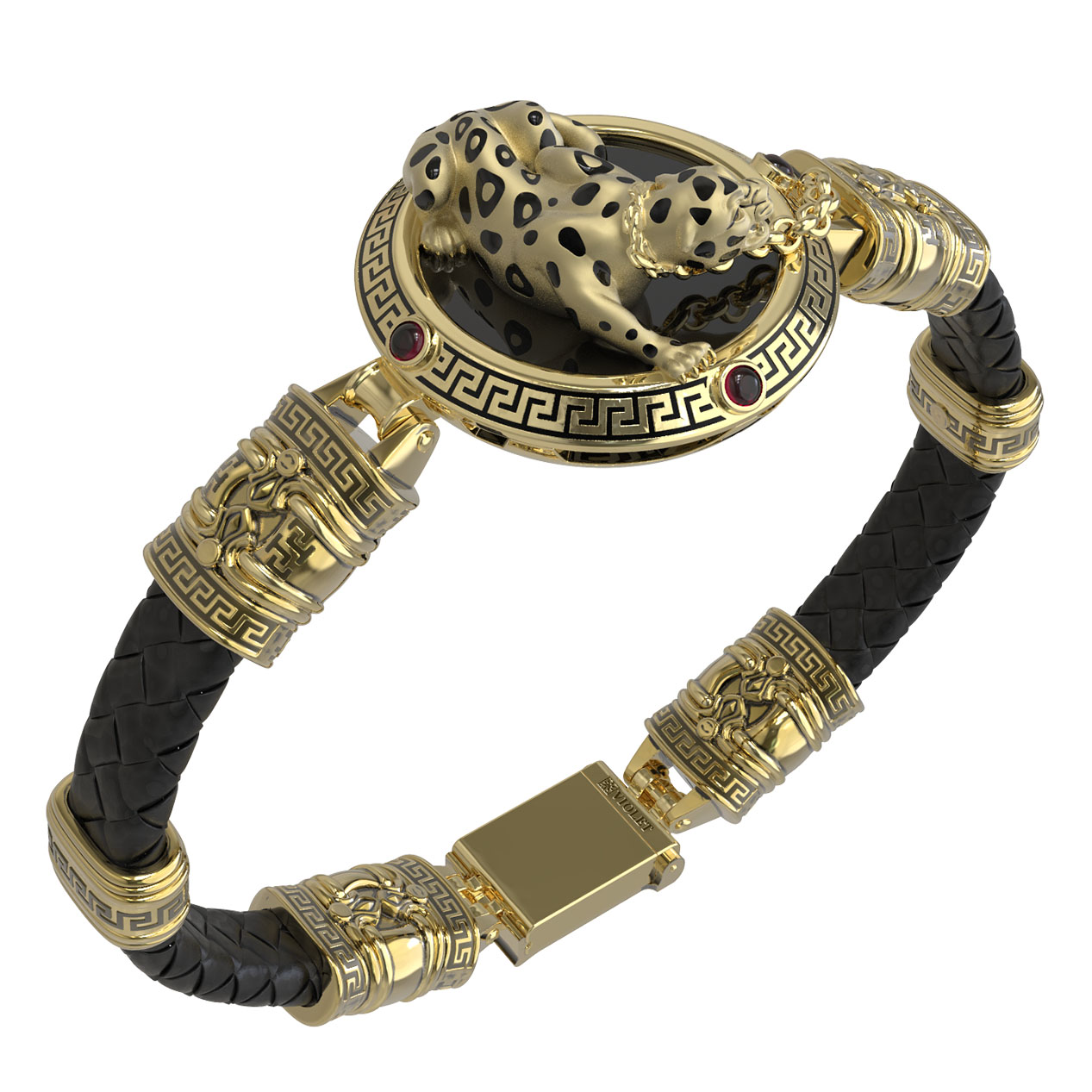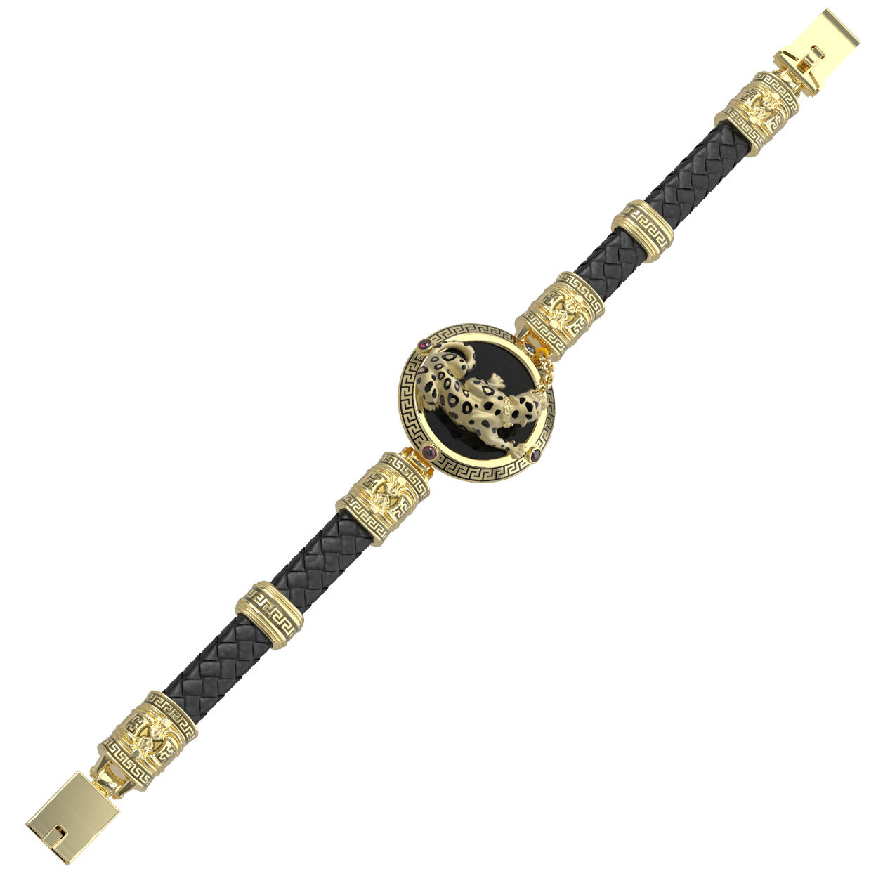 Роскошный браслет из лимонного золота 585 пробы — это истинное произведение ювелирного искусства, созданное для ценителей эксклюзивных аксессуаров. Модель из коллекции De luxe Premium — Леопарды воплощает смелый дизайн, центральным элементом которого стала фигура леопарда. Этот хищник, выполненный с невероятной детализацией, покоится на круглой площадке из глубокого черного оникса, подчеркнутого контрастной эмалью. Вся композиция дополнена вставками из ярко-красного рубина, создающего эффектный акцент на фоне драгоценного металла.