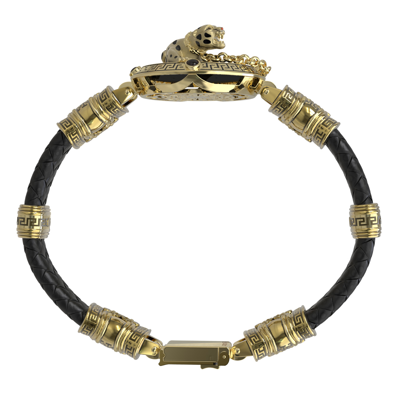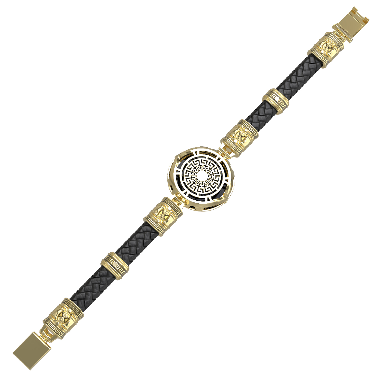 Основой изделия служит износостойкий и стильный шнурок, который гармонично сочетается с лимонным оттенком золота и декоративными элементами. Всего в оформлении использовано 35 вставок, среди которых гармонично переплетаются формы круга и овала. Такой браслет станет выразительным дополнением образа как для женщин, так и для мужчин, предпочитающих подчеркивать свою индивидуальность статусными украшениями. Это изделие также идеально подойдет для создания полноценного комплекта.