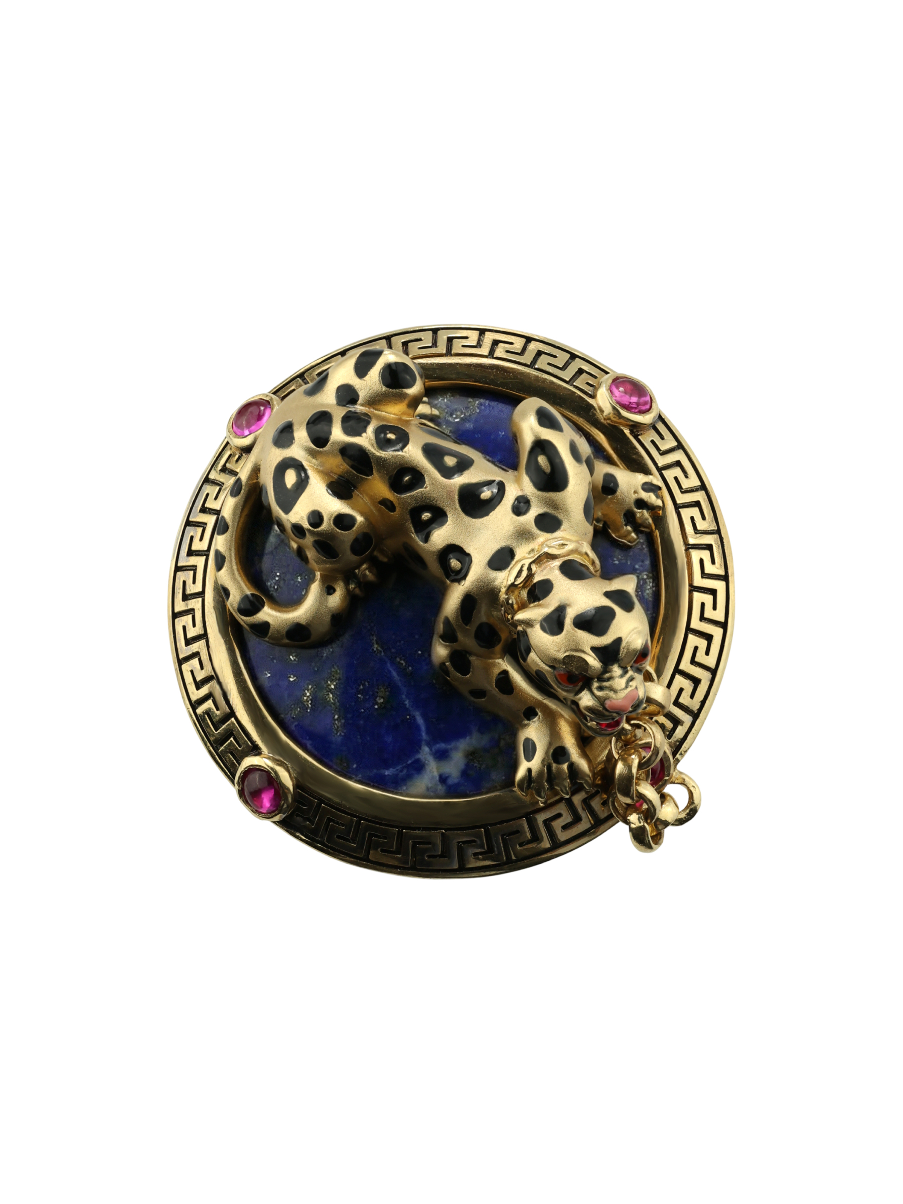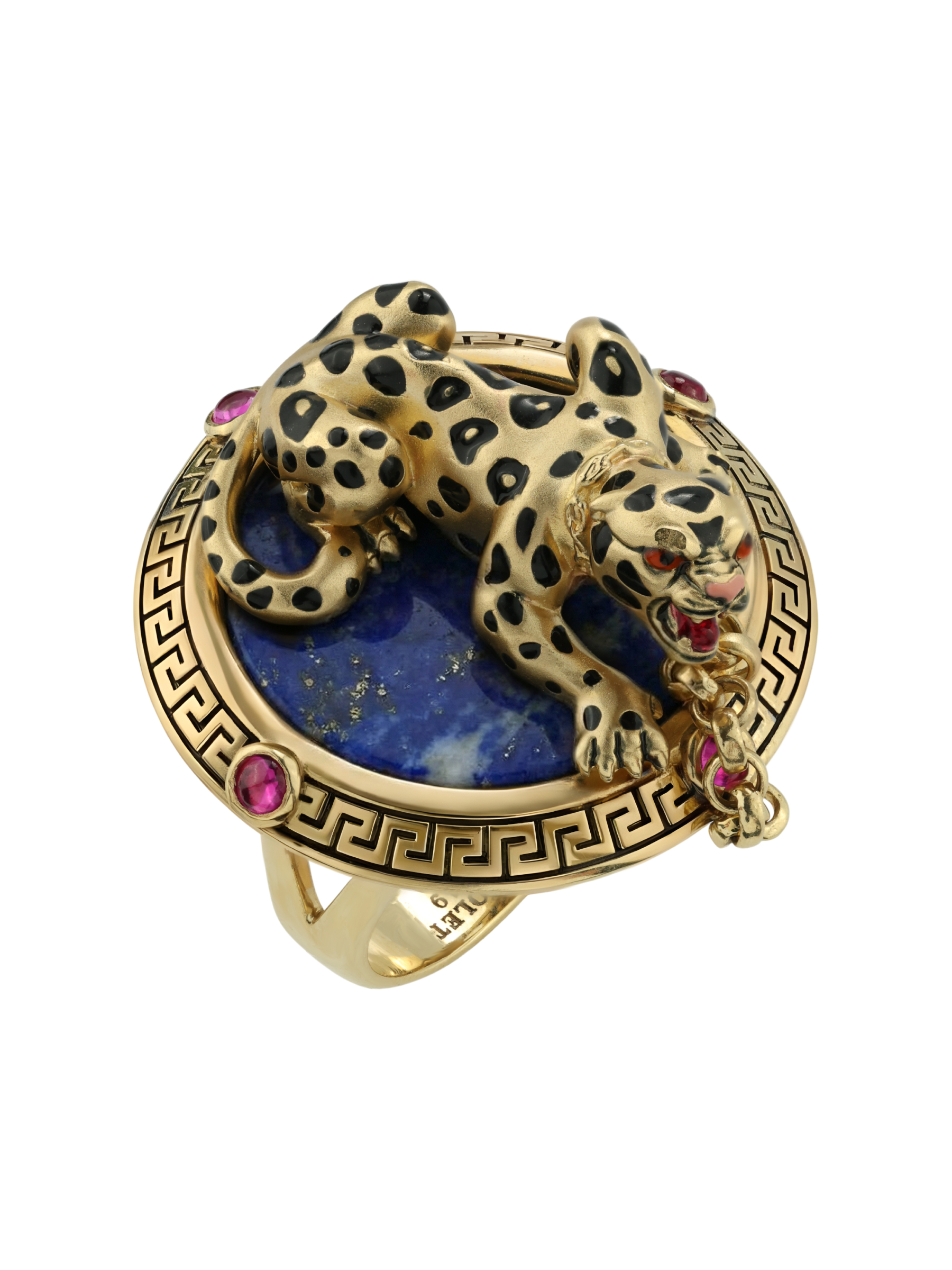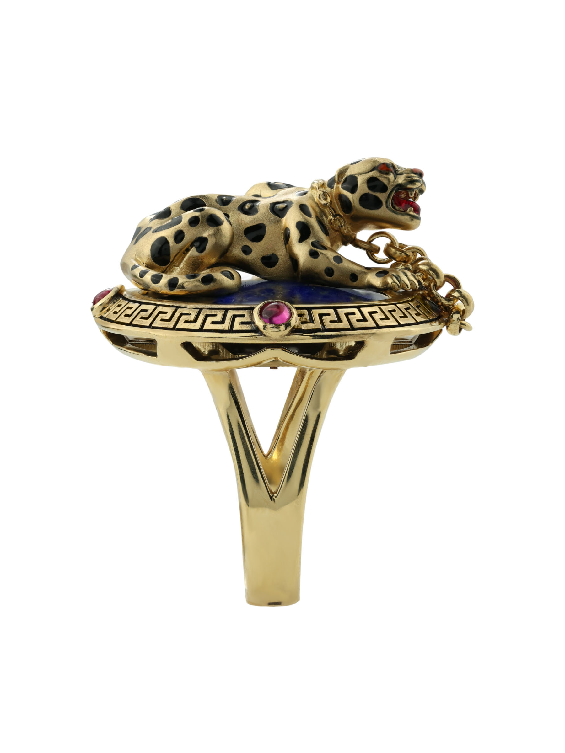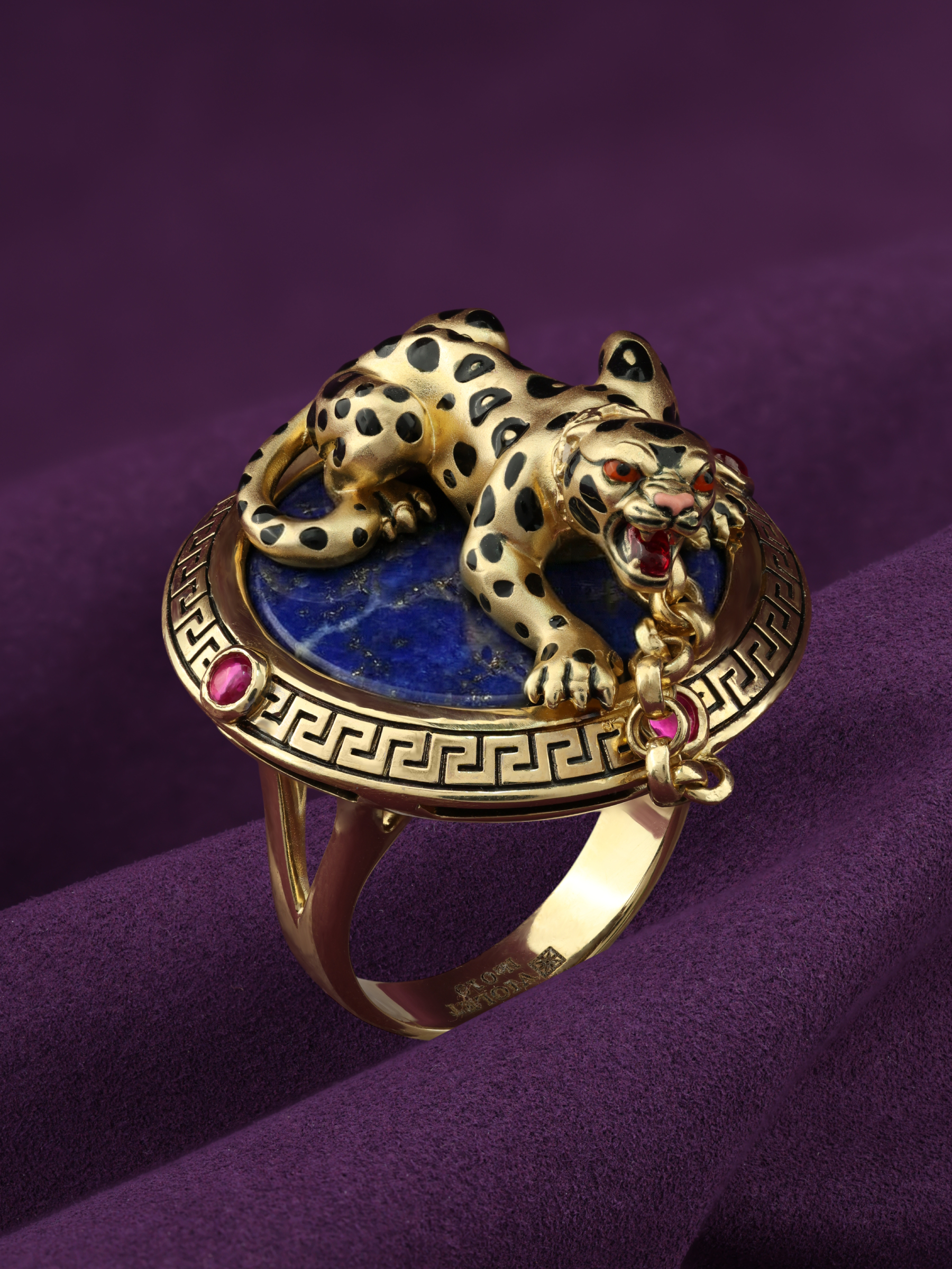 Композиция построена на эффектном контрасте материалов и цветов. Фигура леопарда расположена на глубоком синем лазурите круглой формы, создавая ощущение ночного сафари. Яркие акценты в виде 5 вставок красного рубина круглой формы добавляют изделию динамики и драматизма. Широкая основа кольца украшена классическим греческим орнаментом, который гармонично дополняет массивную и статусную конструкцию.
