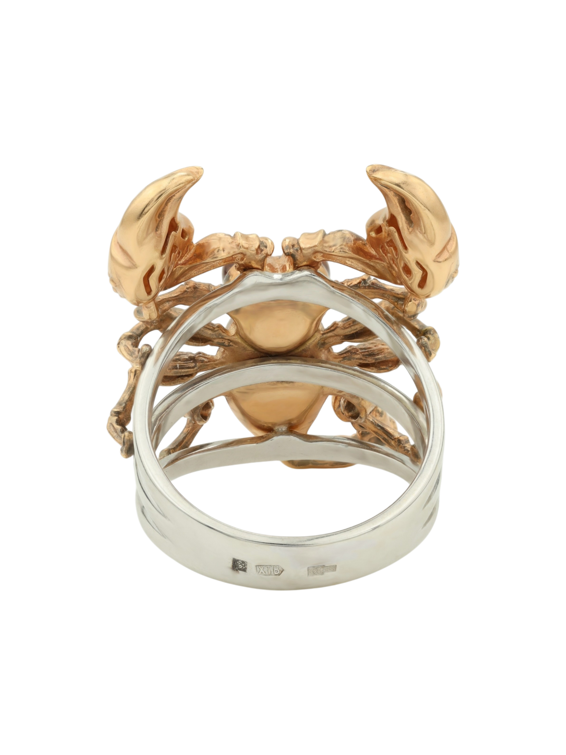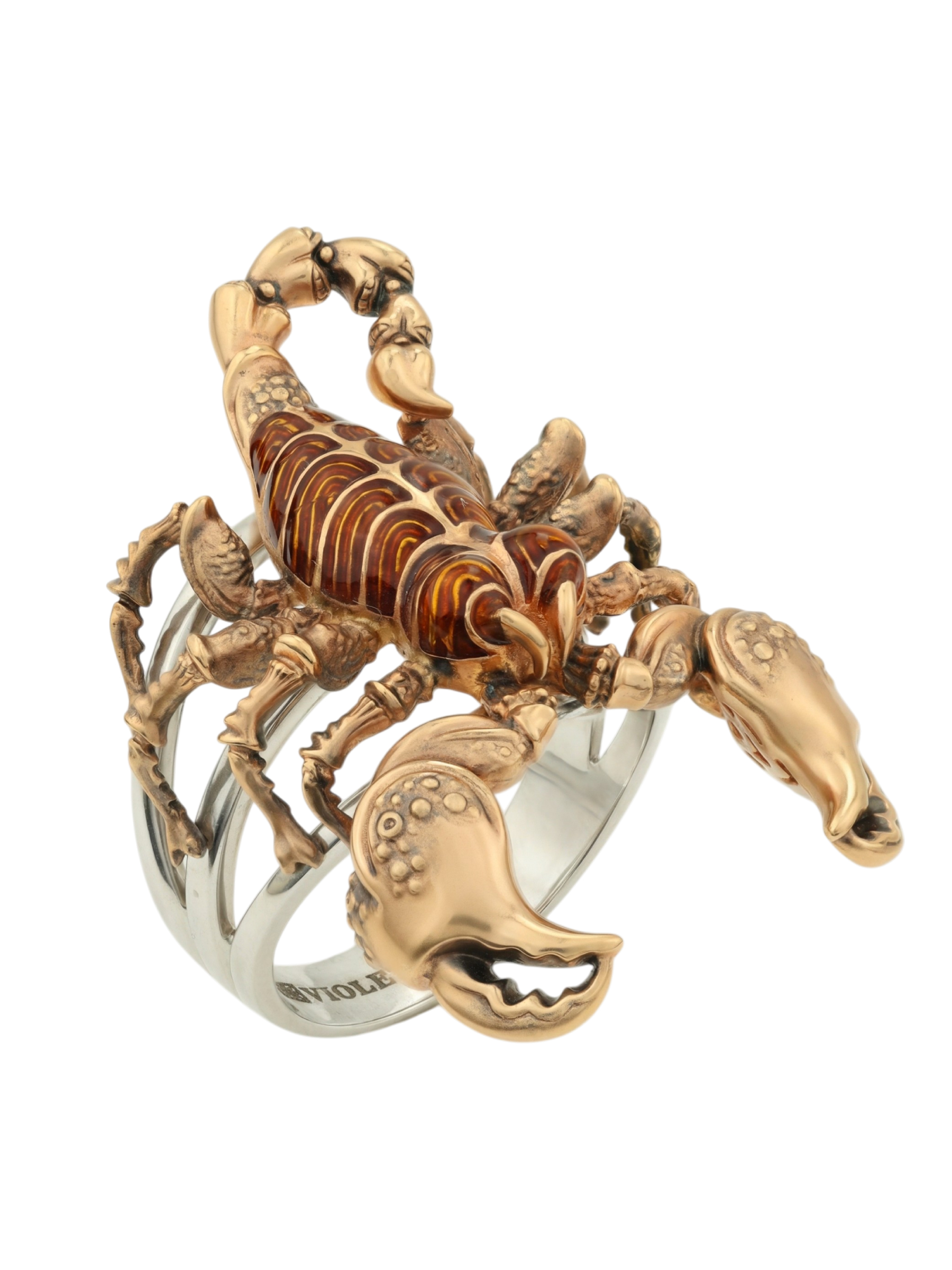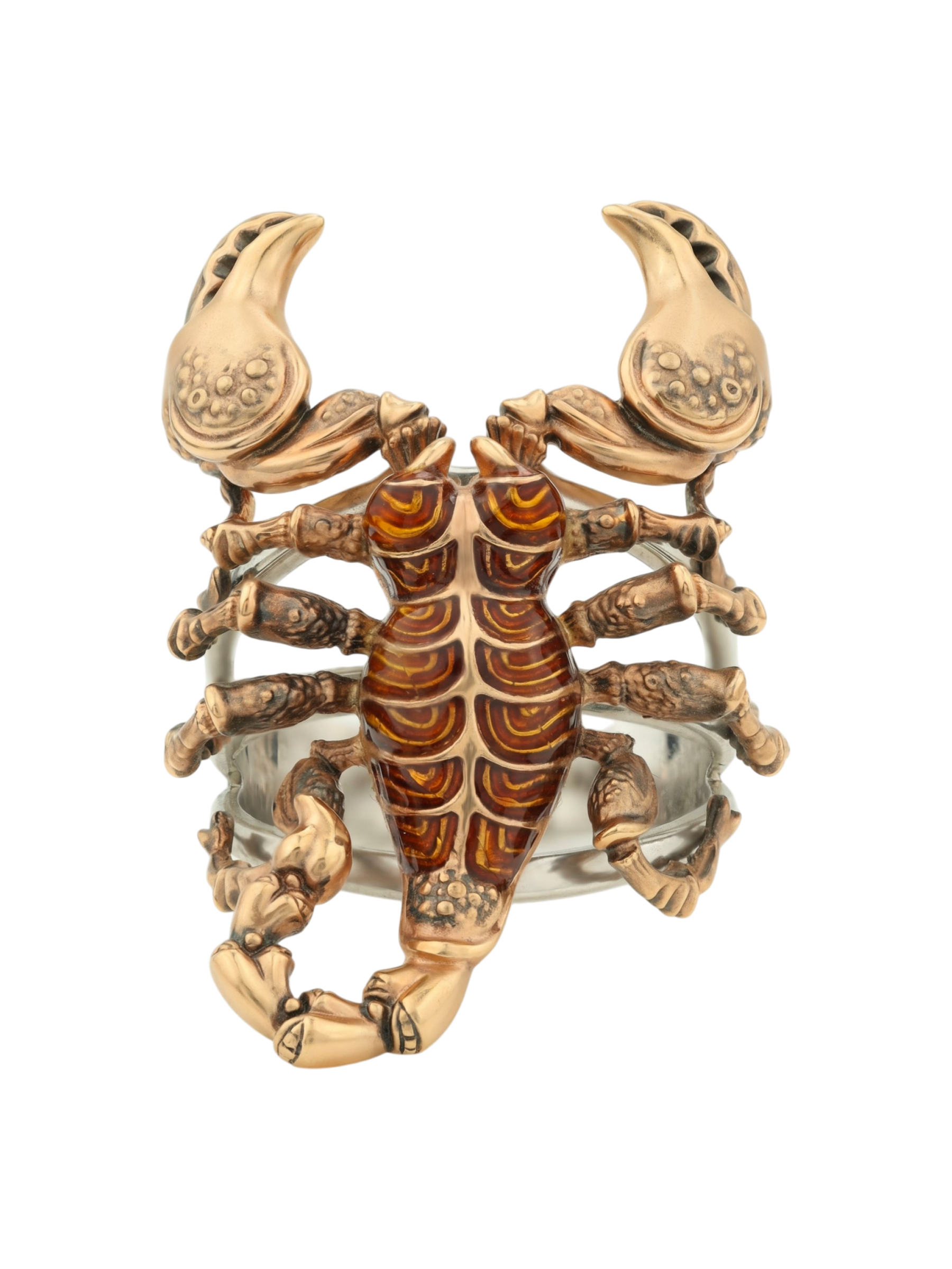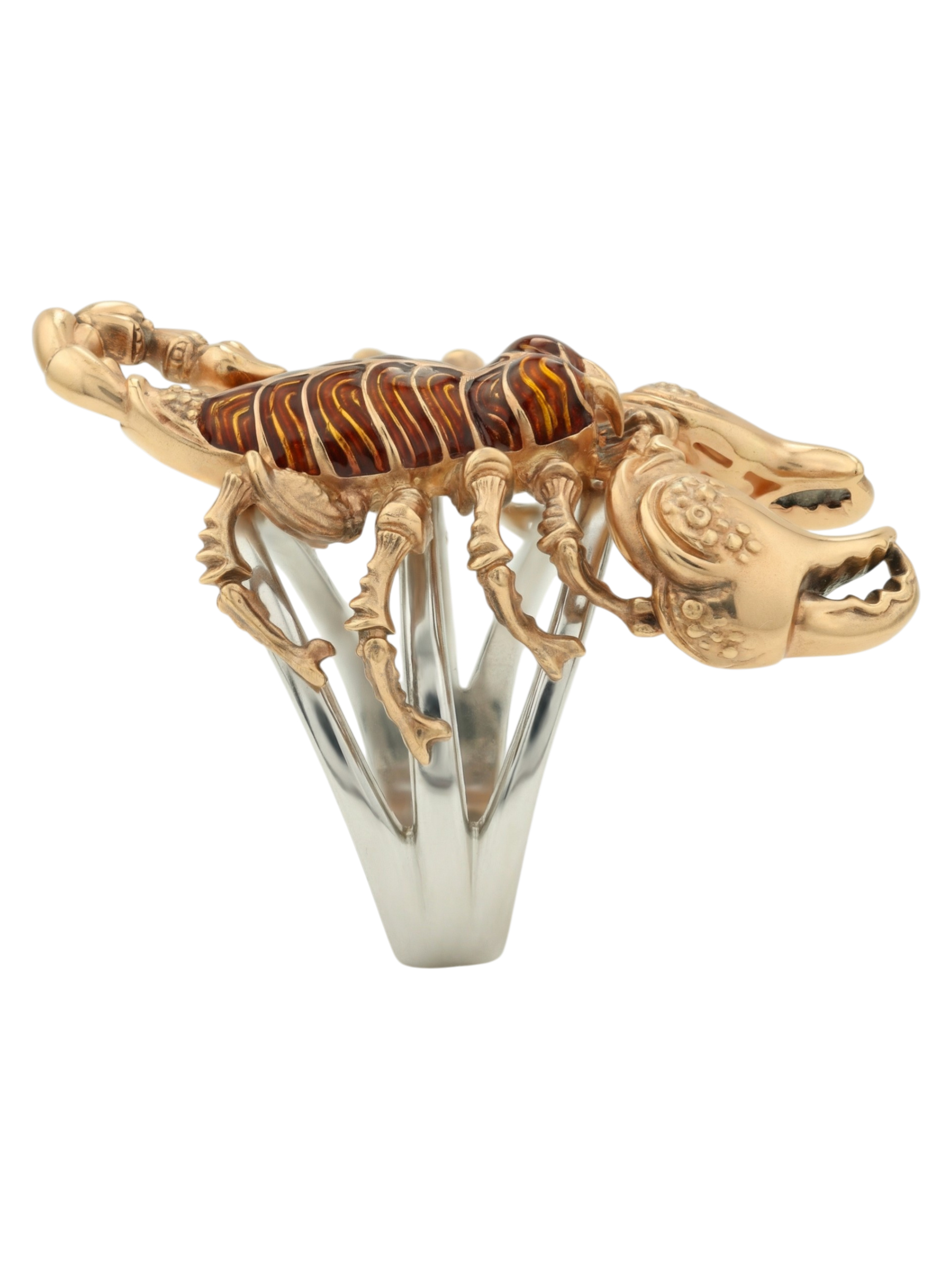 Мастерами ювелирного дела была использована техника покрытия коричневой эмалью, подчеркивающая рельефные элементы изделия и создающая глубину цвета. Красное золото гармонично дополняет теплые оттенки вставки, формируя статусный и узнаваемый образ. Дизайн в виде скорпиона символизирует силу, уверенность и независимость, делая это кольцо не просто украшением, а настоящим отражением индивидуальности владельца.