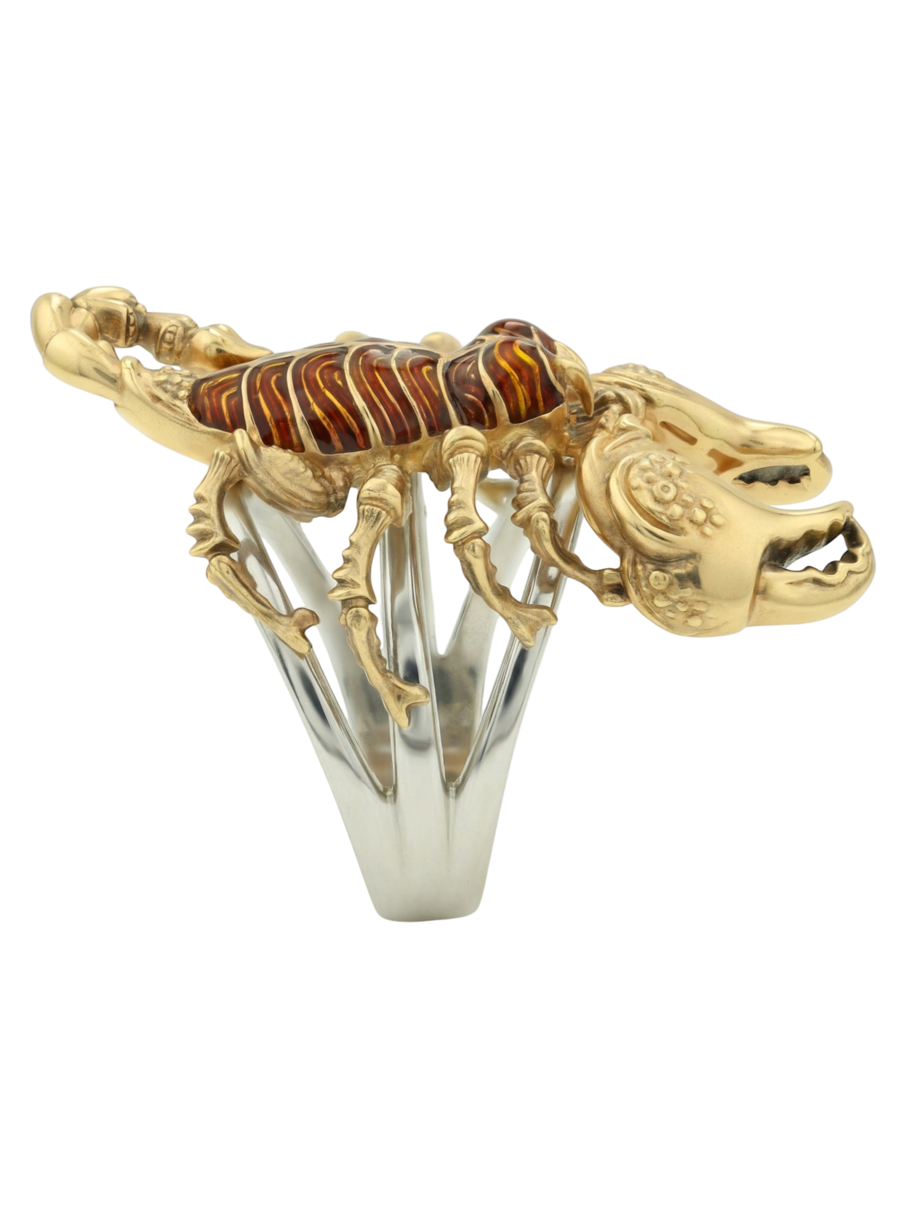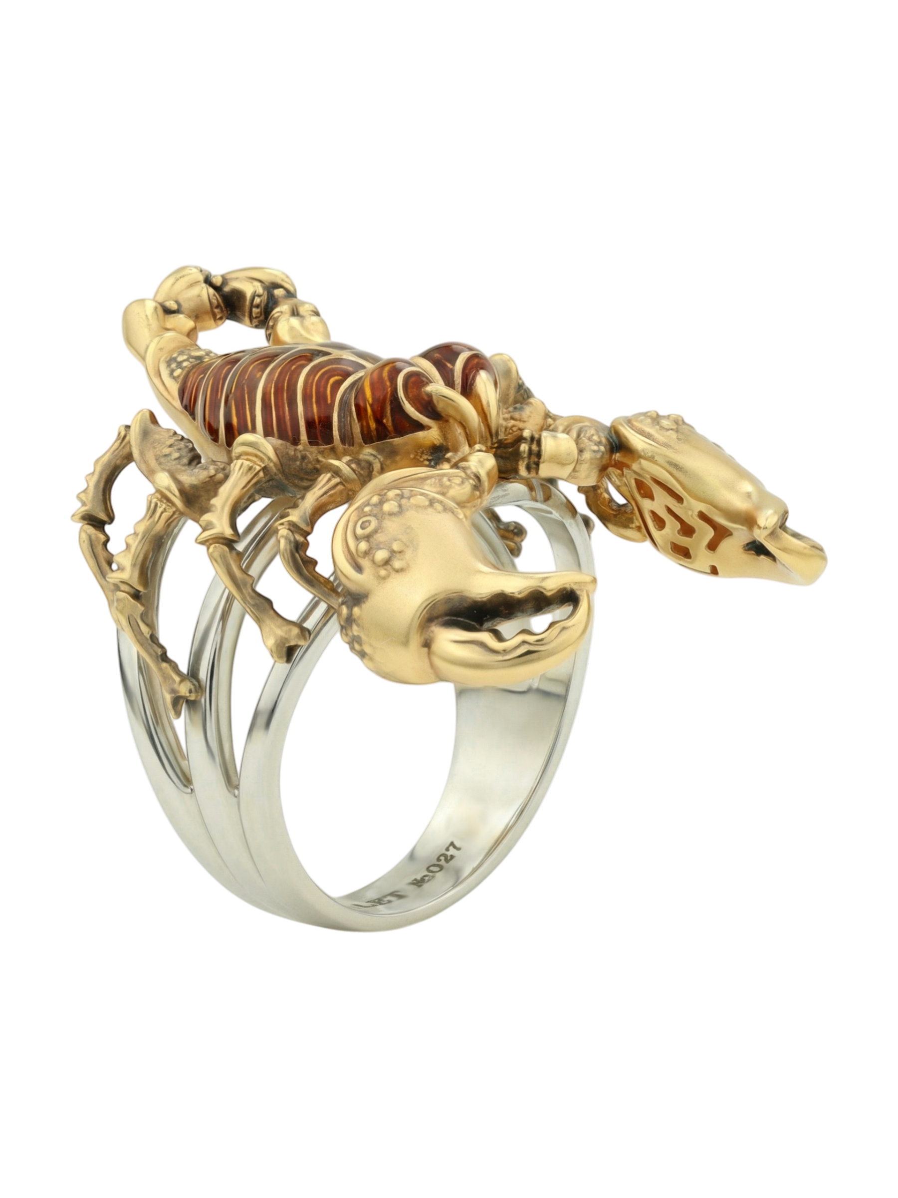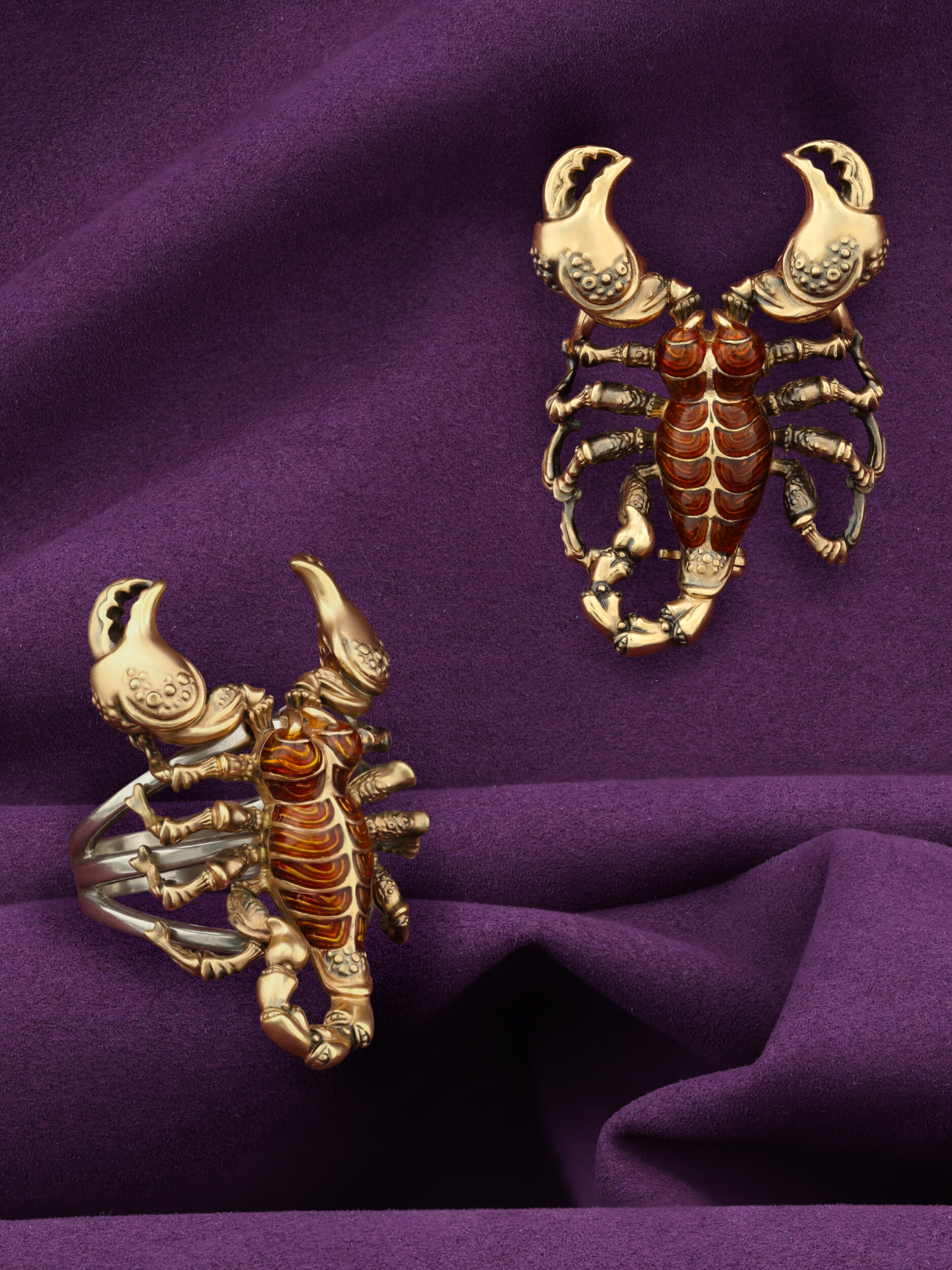 Центральным элементом декора выступает ювелирная эмаль коричневого цвета, которая красиво контрастирует с благородным лимонным оттенком золота. Использование эмали добавляет глубину и фактурность, превращая ювелирное изделие в настоящий арт-объект. Это украшение из коллекции De luxe Premium — Скорпион создано для тех, кто предпочитает смелые и запоминающиеся аксессуары.