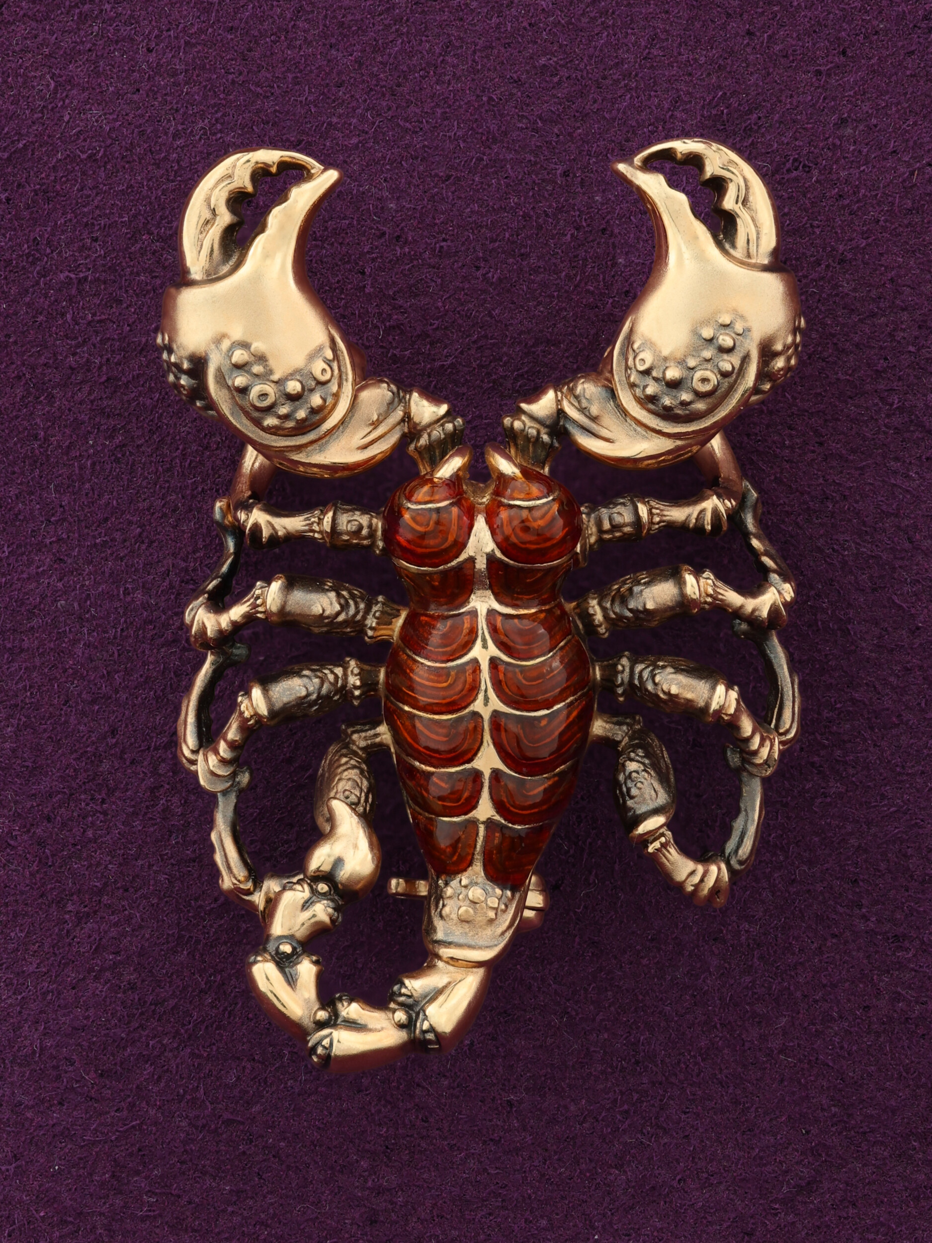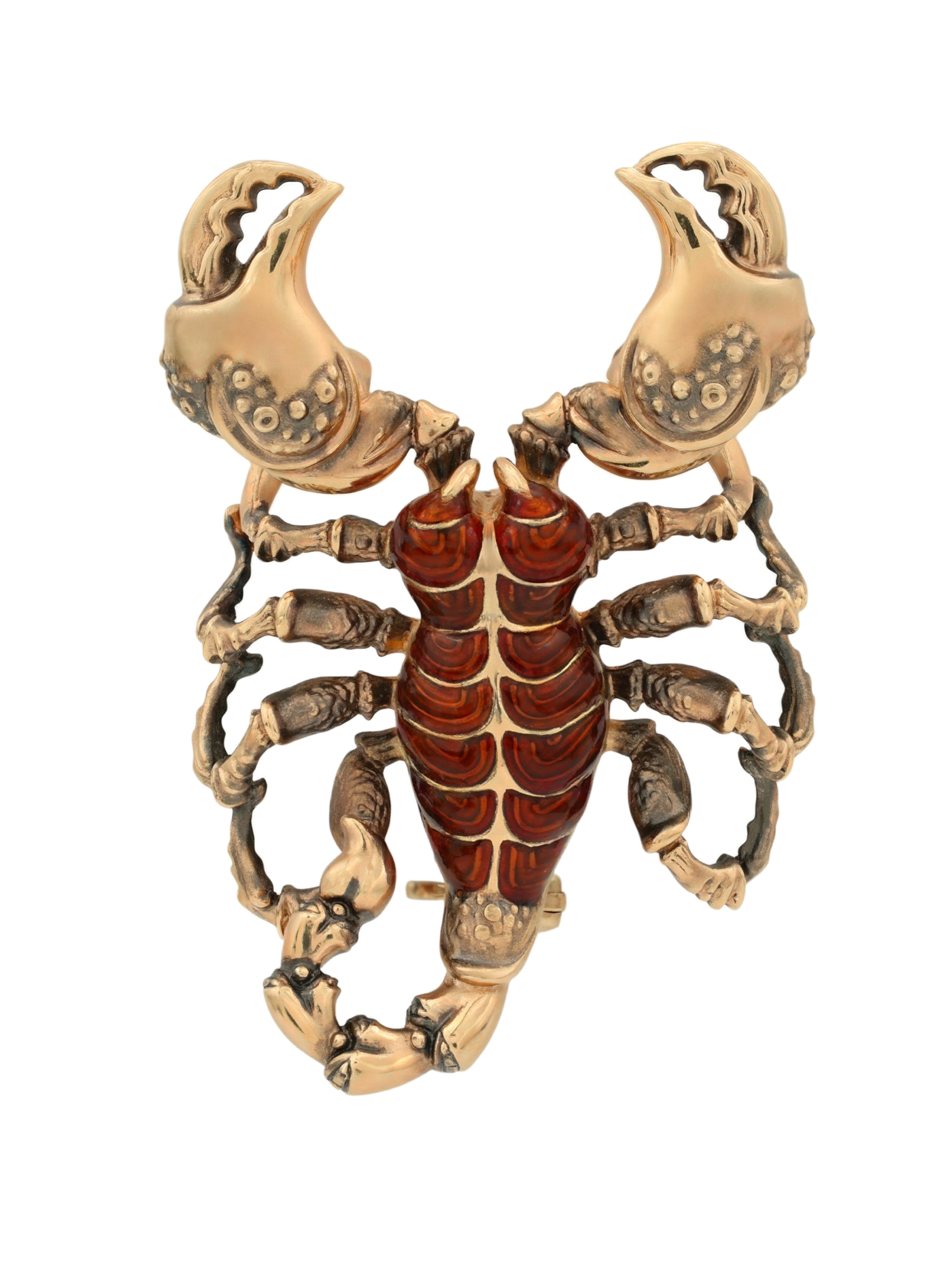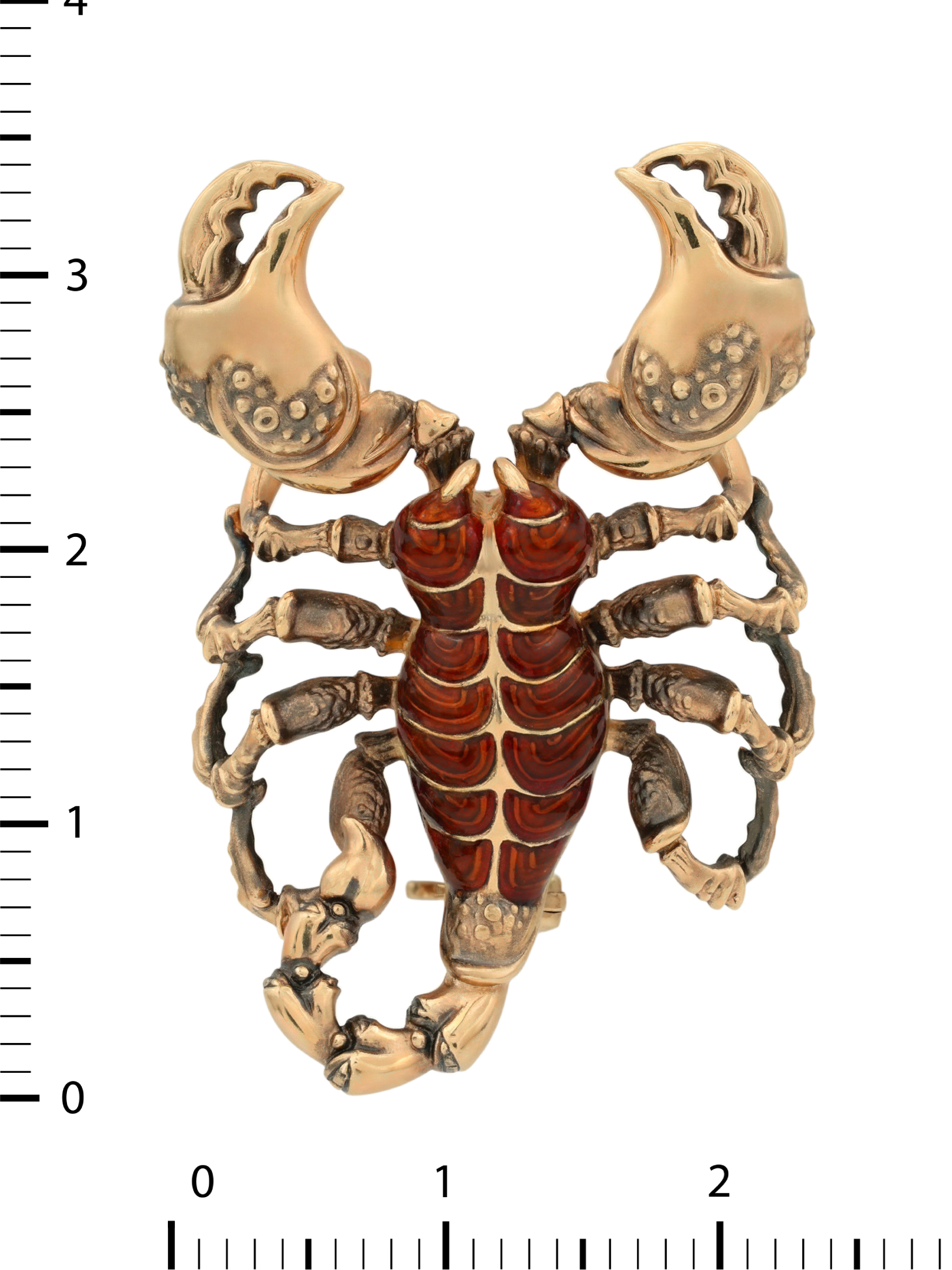 Элегантная брошь в виде скорпиона станет смелым акцентом в вашем образе, подчеркивая безупречный вкус и индивидуальность. Украшение выполнено из качественного красного золота 585 пробы, что обеспечивает долговечность и благородный блеск. Особую выразительность дизайну придает искусная вставка из коричневой эмали, которая деликатно покрывает корпус изделия, создавая глубокий и насыщенный визуальный эффект.