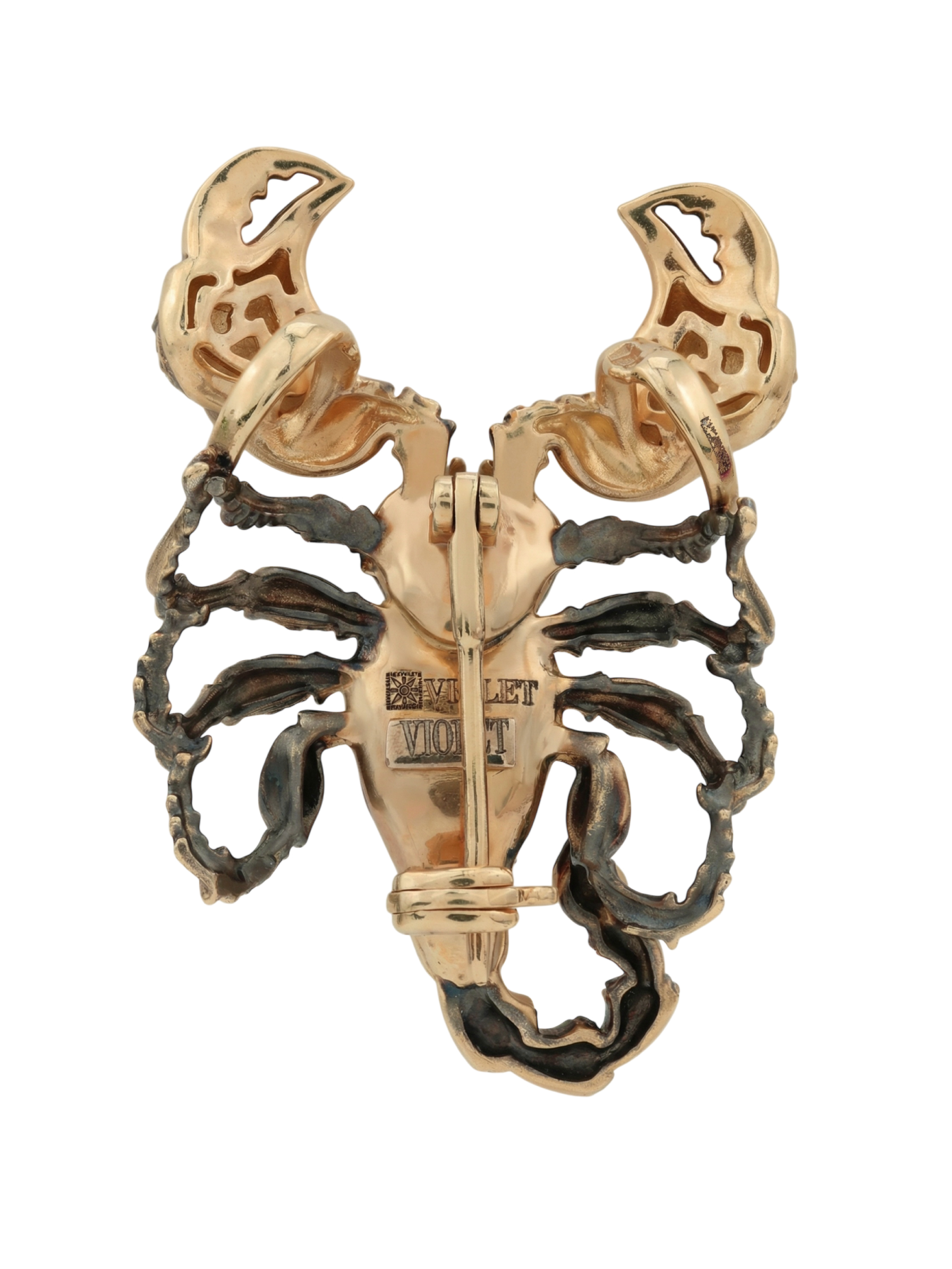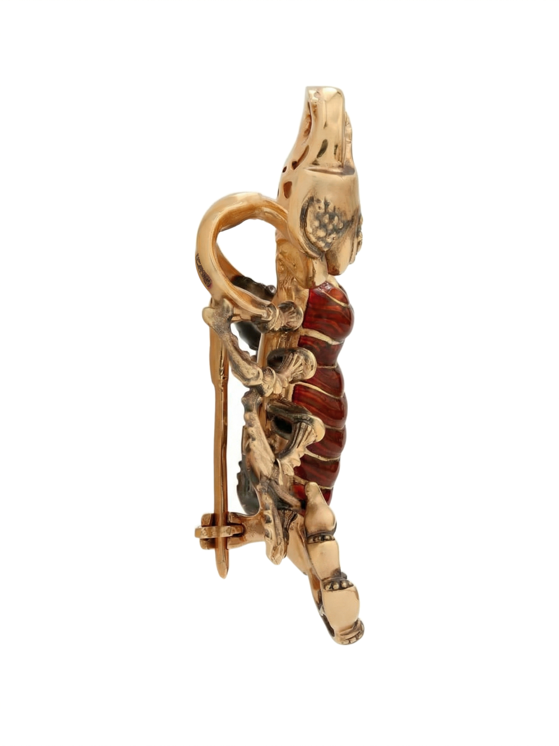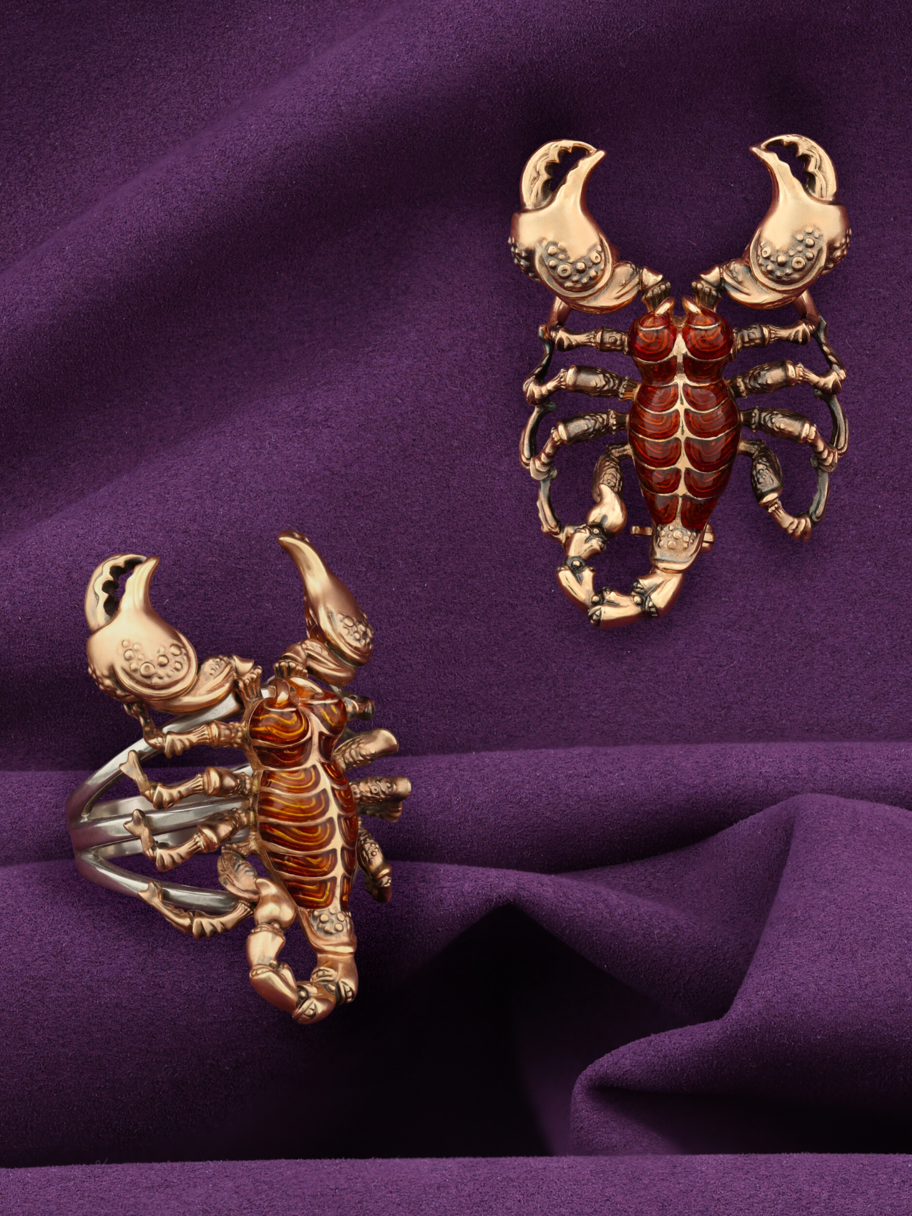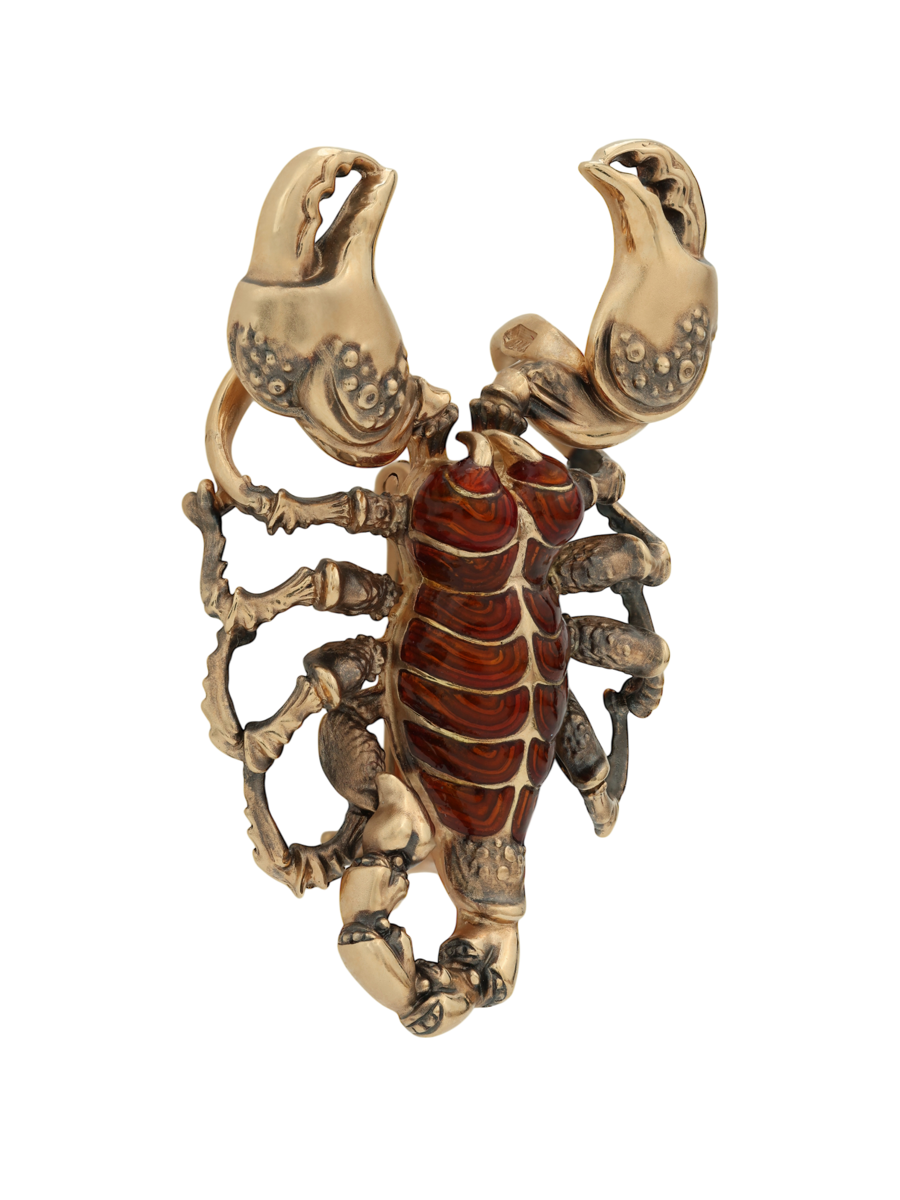 Элегантная брошь в виде скорпиона станет смелым акцентом в вашем образе, подчеркивая безупречный вкус и индивидуальность. Украшение выполнено из качественного красного золота 585 пробы, что обеспечивает долговечность и благородный блеск. Особую выразительность дизайну придает искусная вставка из коричневой эмали, которая деликатно покрывает корпус изделия, создавая глубокий и насыщенный визуальный эффект.