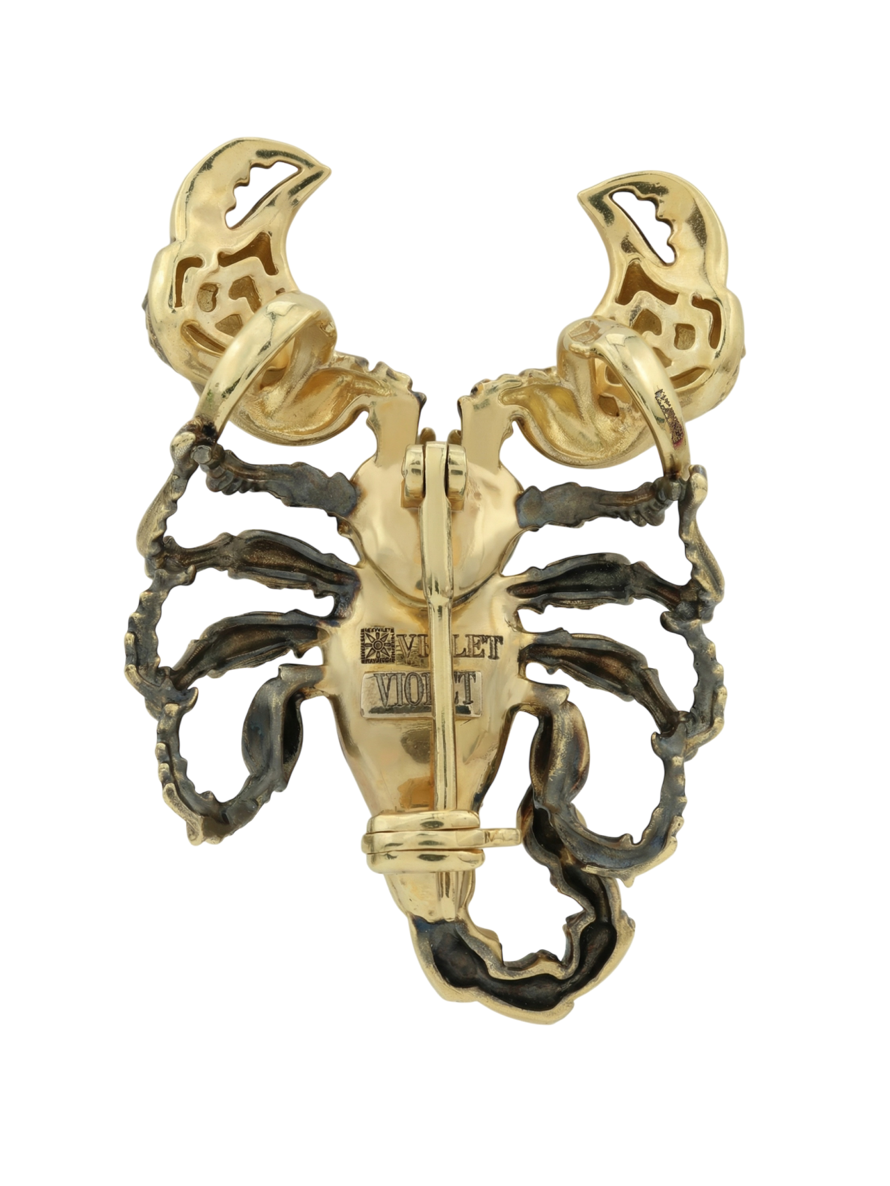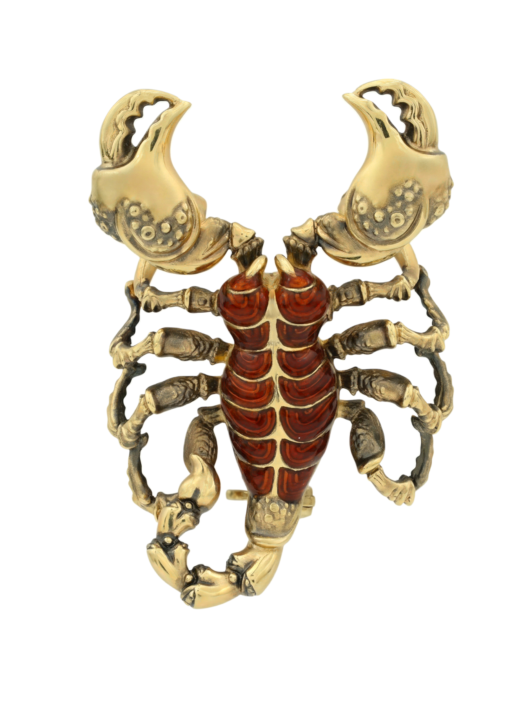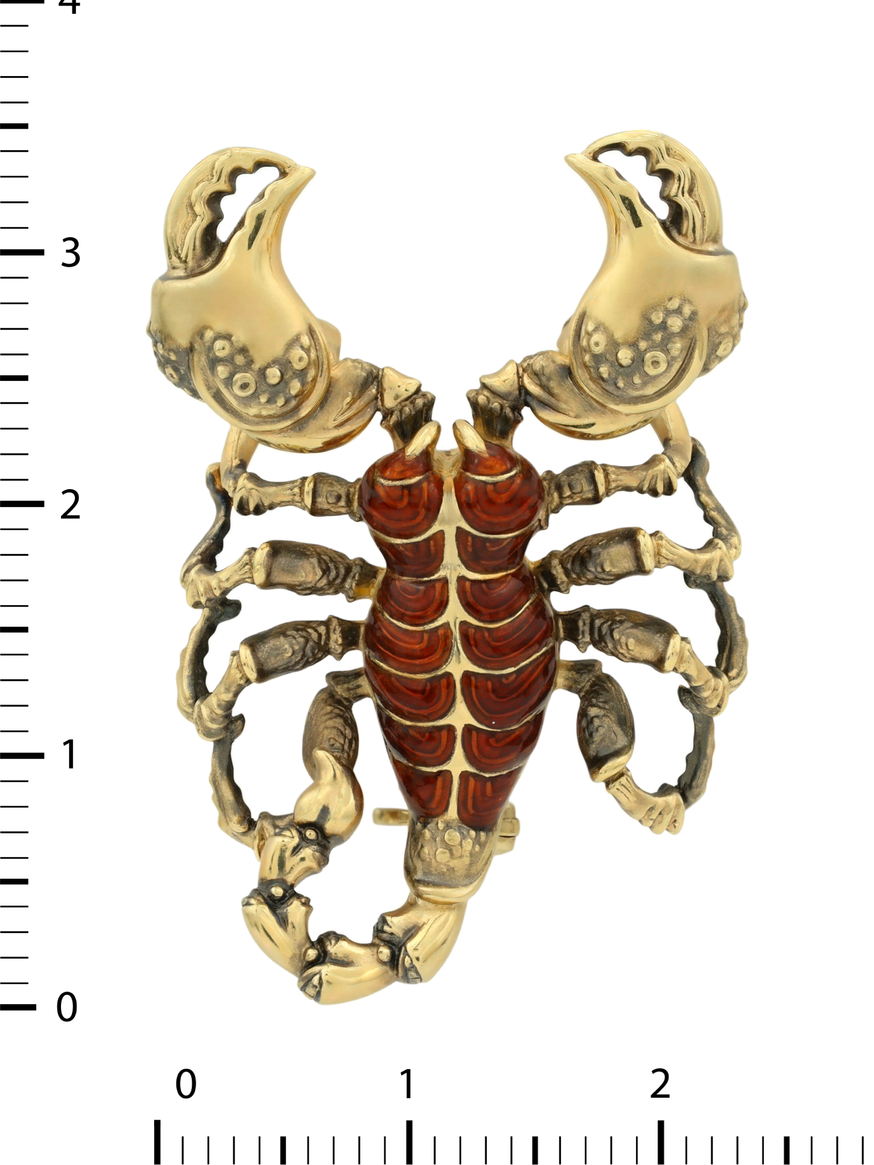 Главный акцент изделия — яркая коричневая эмаль, которой покрыта спинка скорпиона. Теплый оттенок эмали гармонично сочетается с лимонным цветом золота, создавая выразительный контраст и глубину. Это украшение станет идеальным завершением образа для тех, кто ценит необычные ювелирные решения. Брошь универсальна и подойдет как женщинам, так и мужчинам, стремящимся подчеркнуть свою индивидуальность.