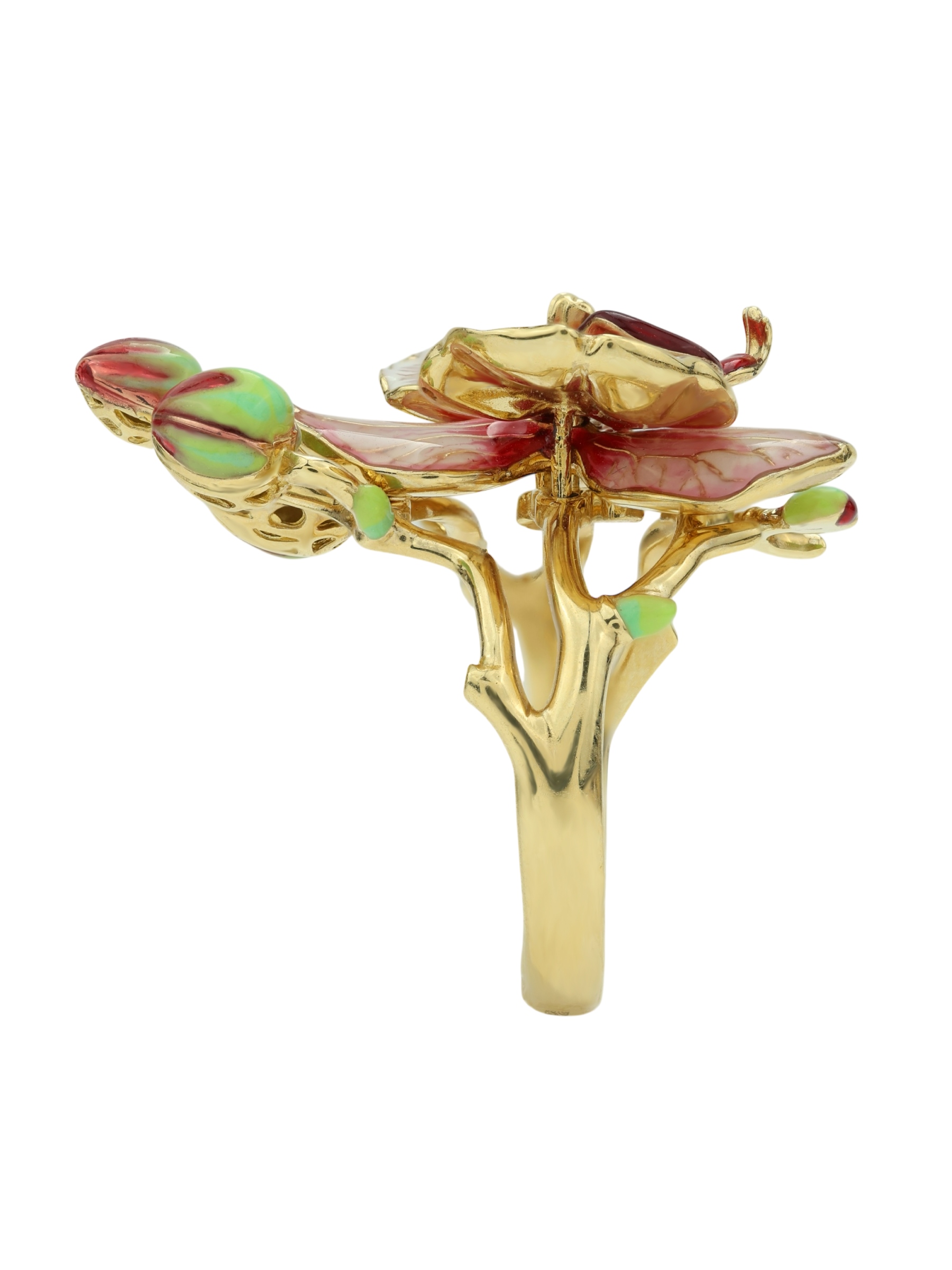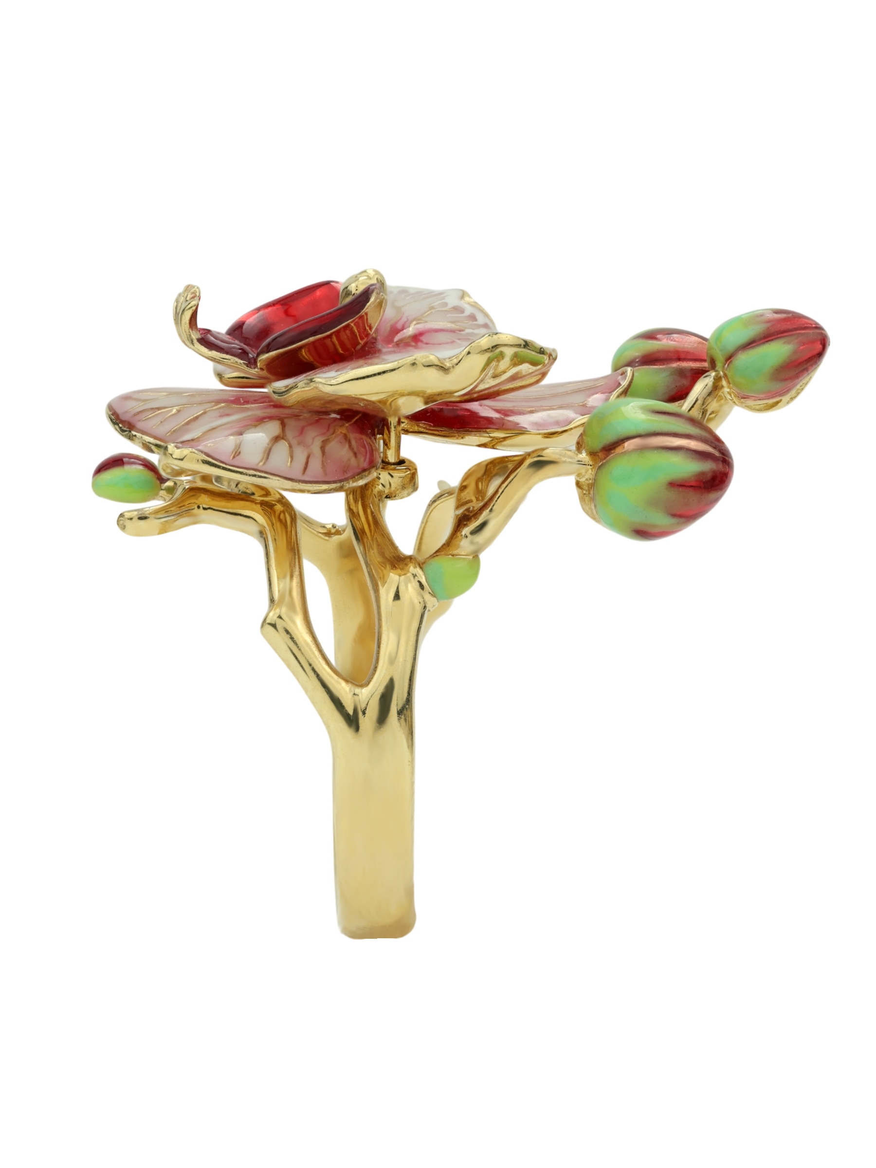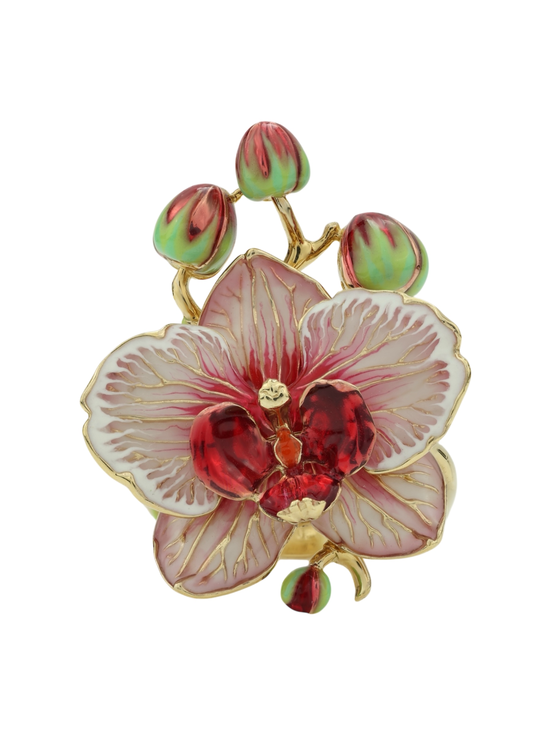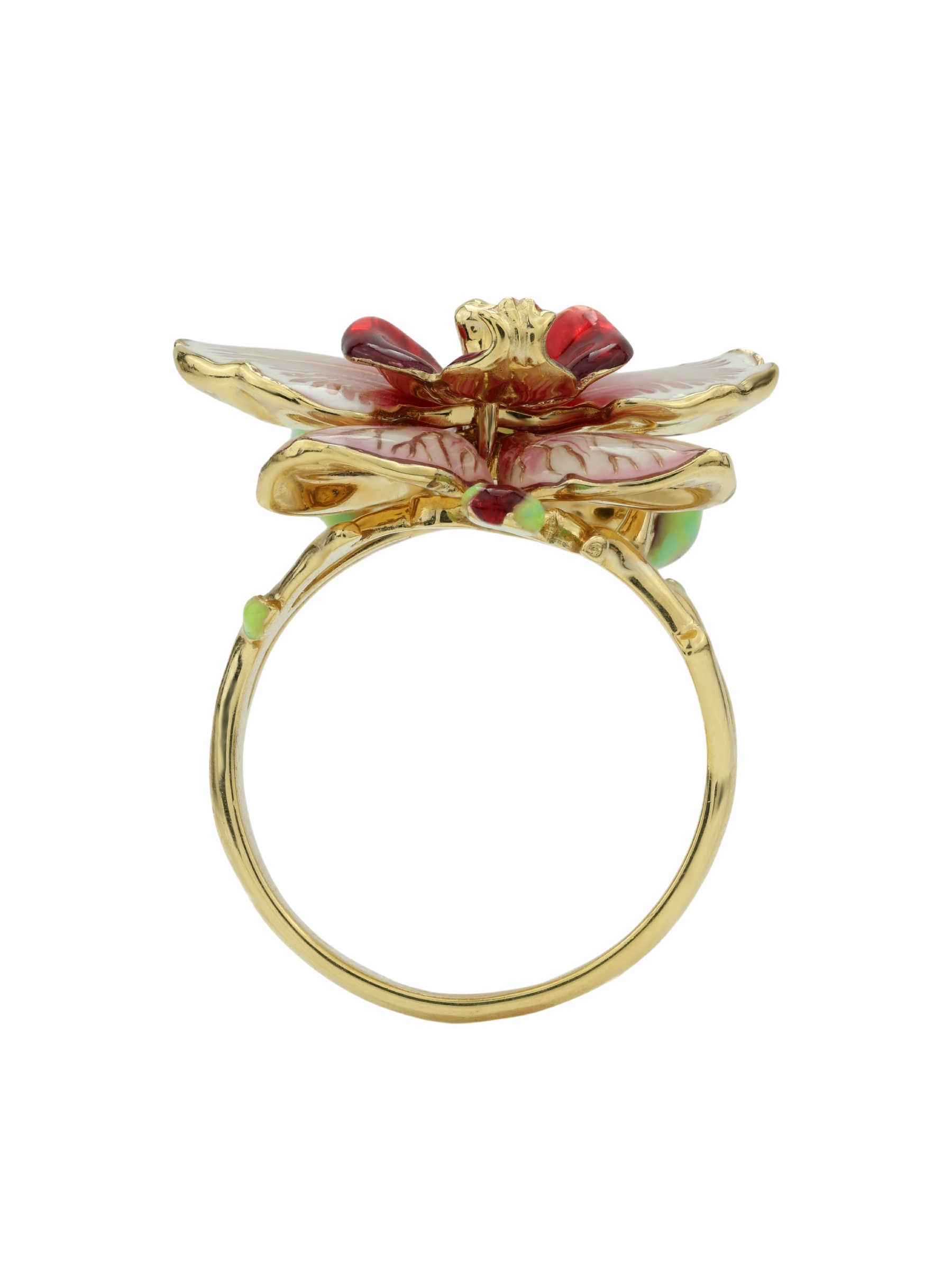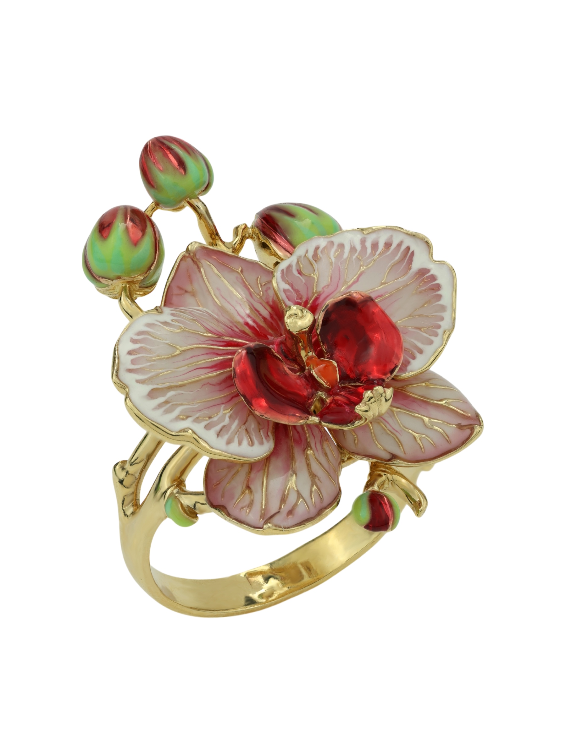 Кольцо из лимонного золота 585 пробы из коллекции De luxe Premium — Орхидеи воплощает собой истинное мастерство ювелирного искусства. Нежный и выразительный дизайн в форме экзотического цветка орхидеи сразу привлекает внимание своей детализацией и живостью линий. Золотая основа лимонного цвета гармонично сочетается с искусным покрытием разноцветной эмалью, создавая эффект натурального цветения, который выглядит невероятно эффектно и статусно.