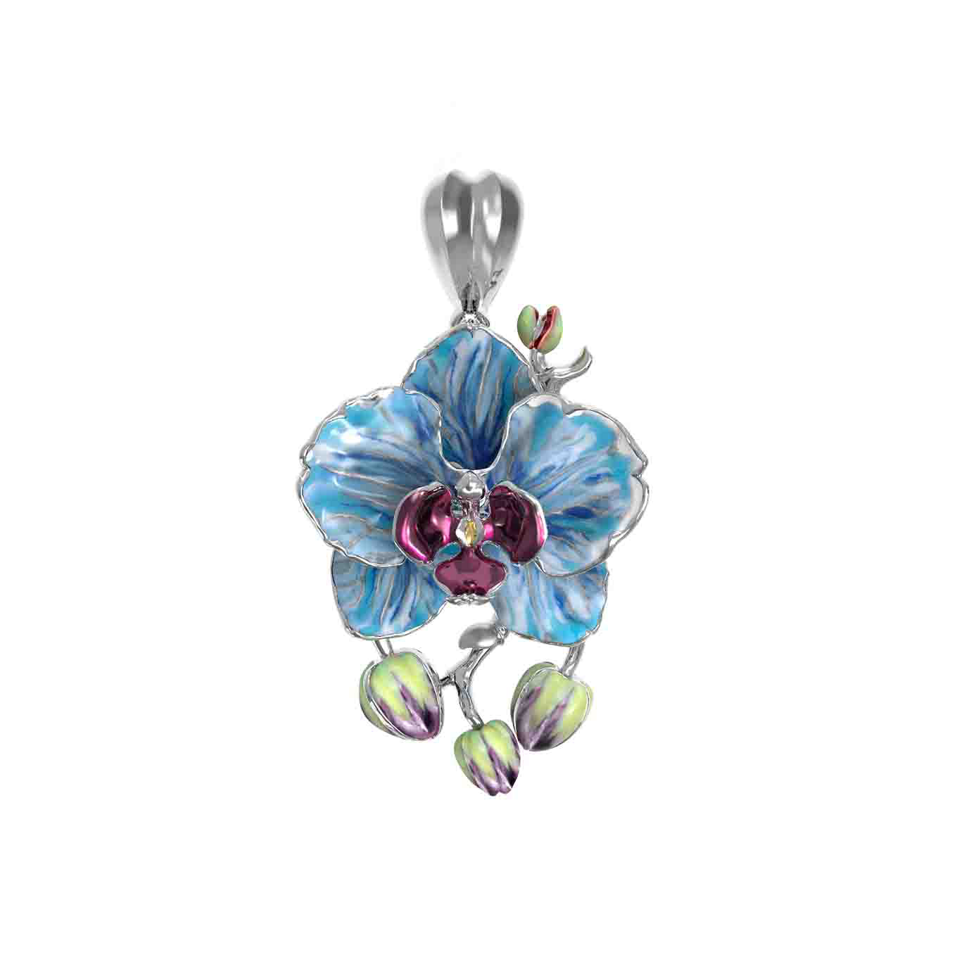 Главным акцентом украшения является разноцветная эмаль, нанесенная с ювелирной точностью. Плавные переходы оттенков на лепестках и бутонах орхидеи создают завораживающий визуальный эффект, оживляя ювелирное изделие. Такая подвеска станет утонченным дополнением к повседневному или вечернему гардеробу, подчеркивая индивидуальность и чувство стиля.