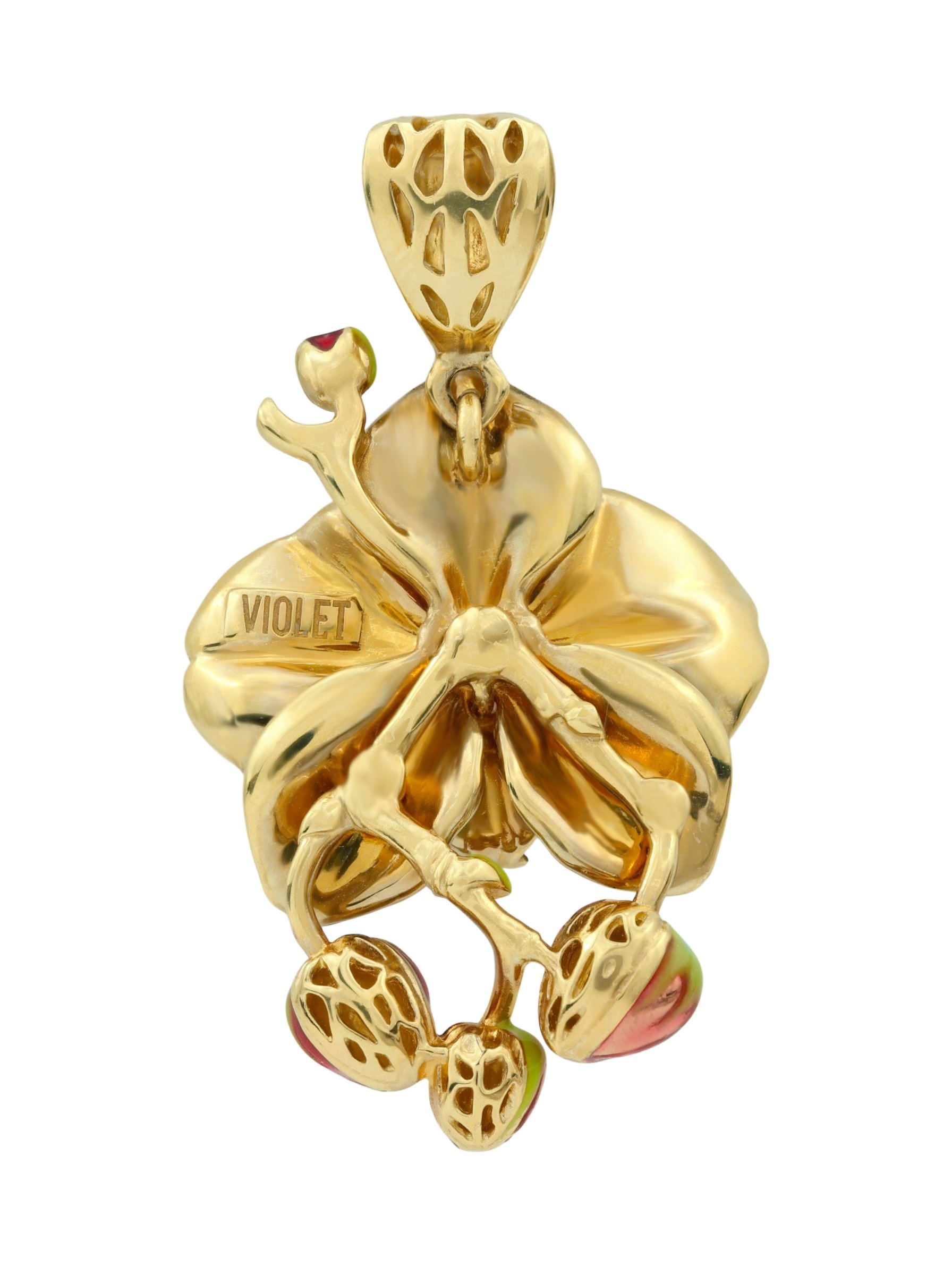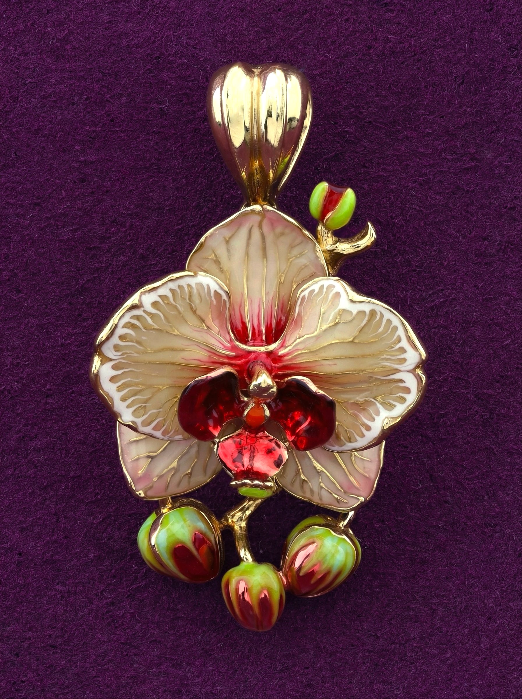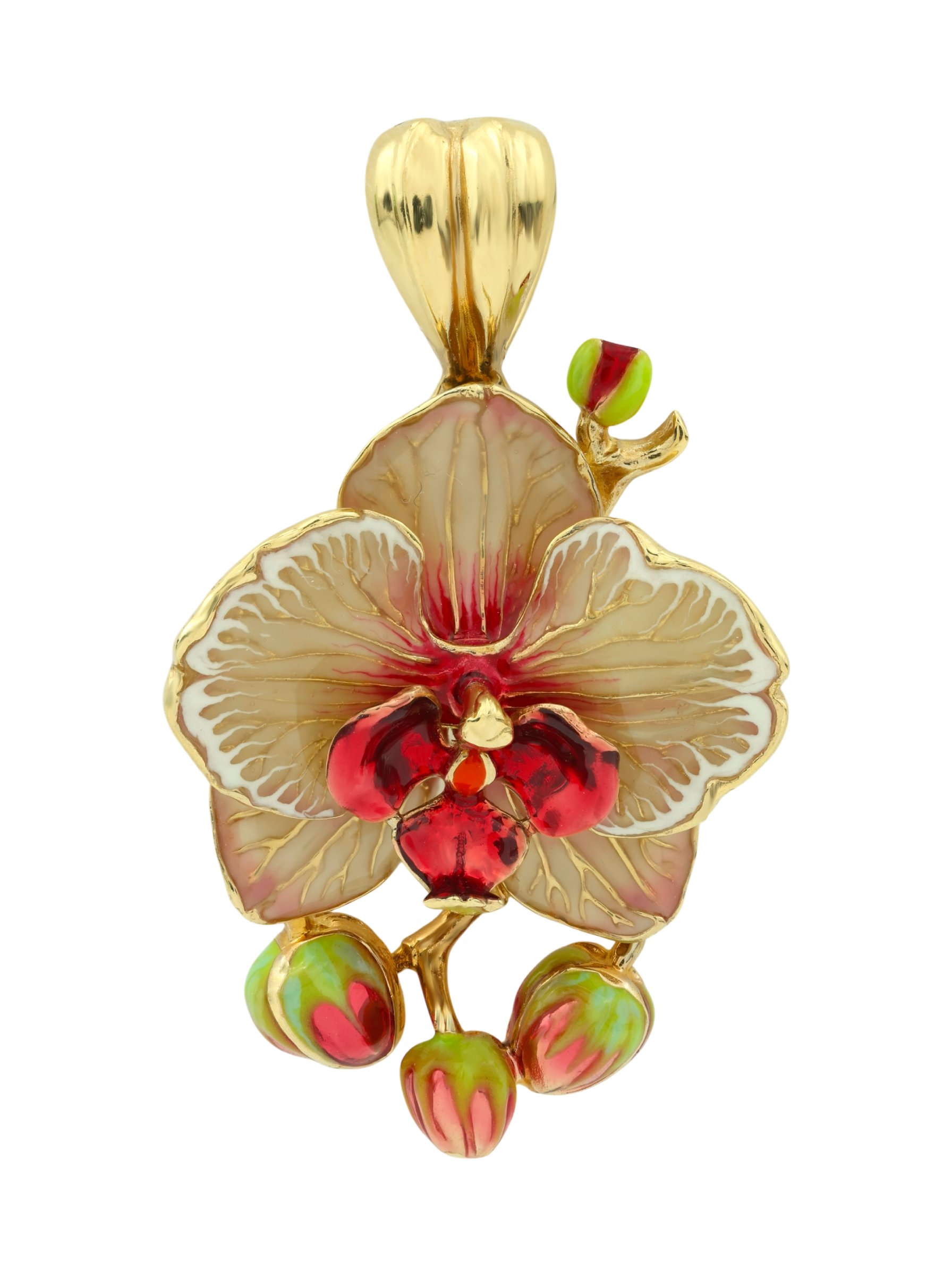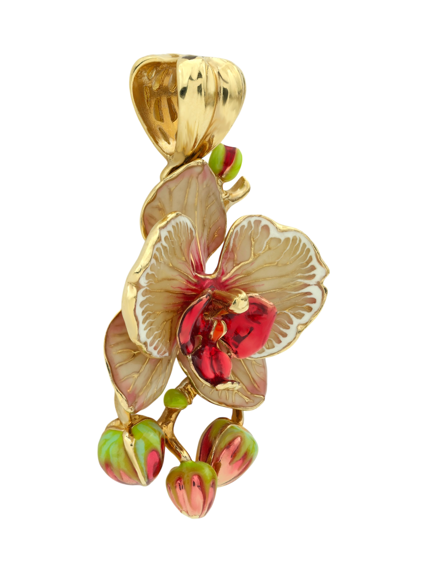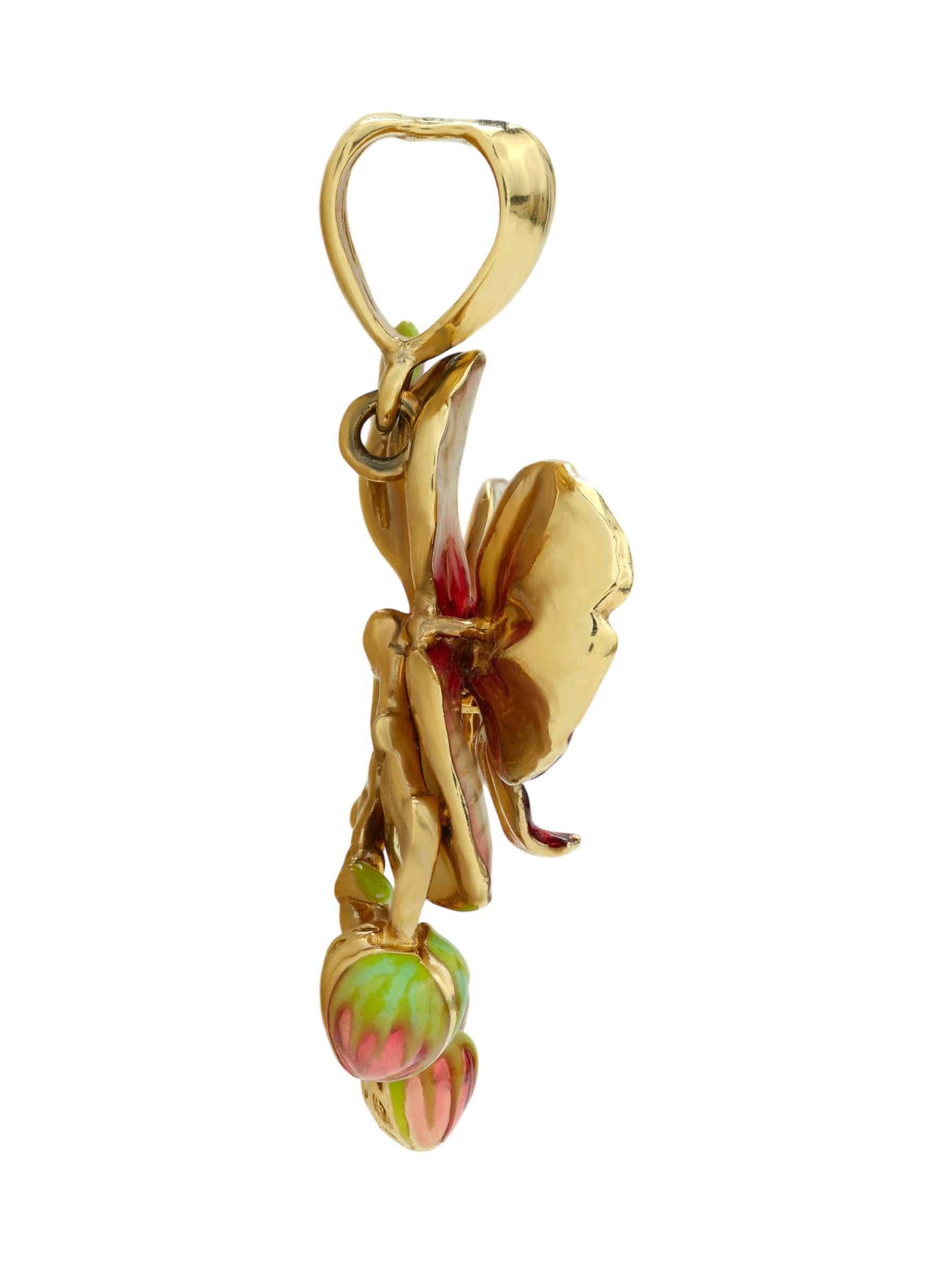 Подвеска из лимонного золота с эмалью — изящный аксессуар, вдохновленный красотой природы. Украшение выполнено в виде роскошного цветка орхидеи, где тонкая проработка деталей сочетается с благородным блеском металла. Дизайн в стиле цветов подчеркивает утонченность линий и делает это ювелирное изделие настоящим произведением искусства.