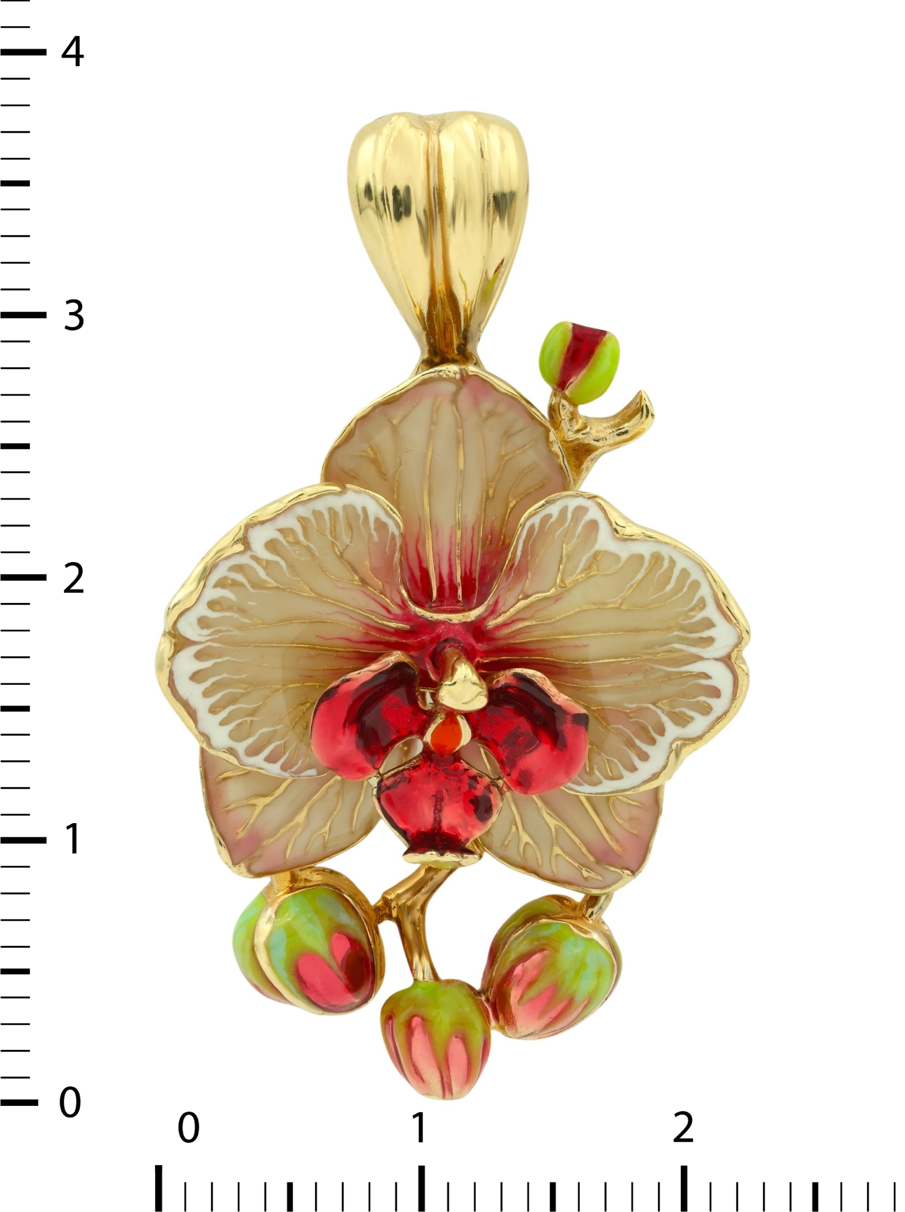 Для создания подвески мастера использовали лимонное золото 585 пробы, которое придает украшению теплый и солнечный оттенок. Декоративное оформление дополнено яркой разноцветной эмалью, нанесенной вручную для достижения глубины цвета и плавности переходов. Этот элемент коллекции De luxe Premium — Орхидеи станет идеальным завершением образа, добавив в него нотки экзотики и стиля.
