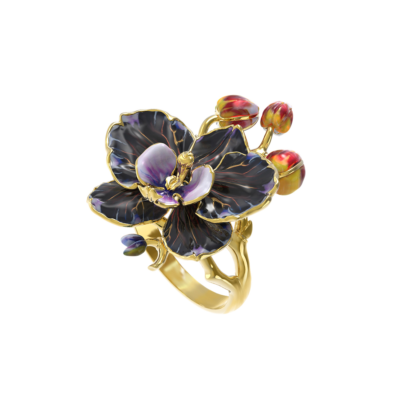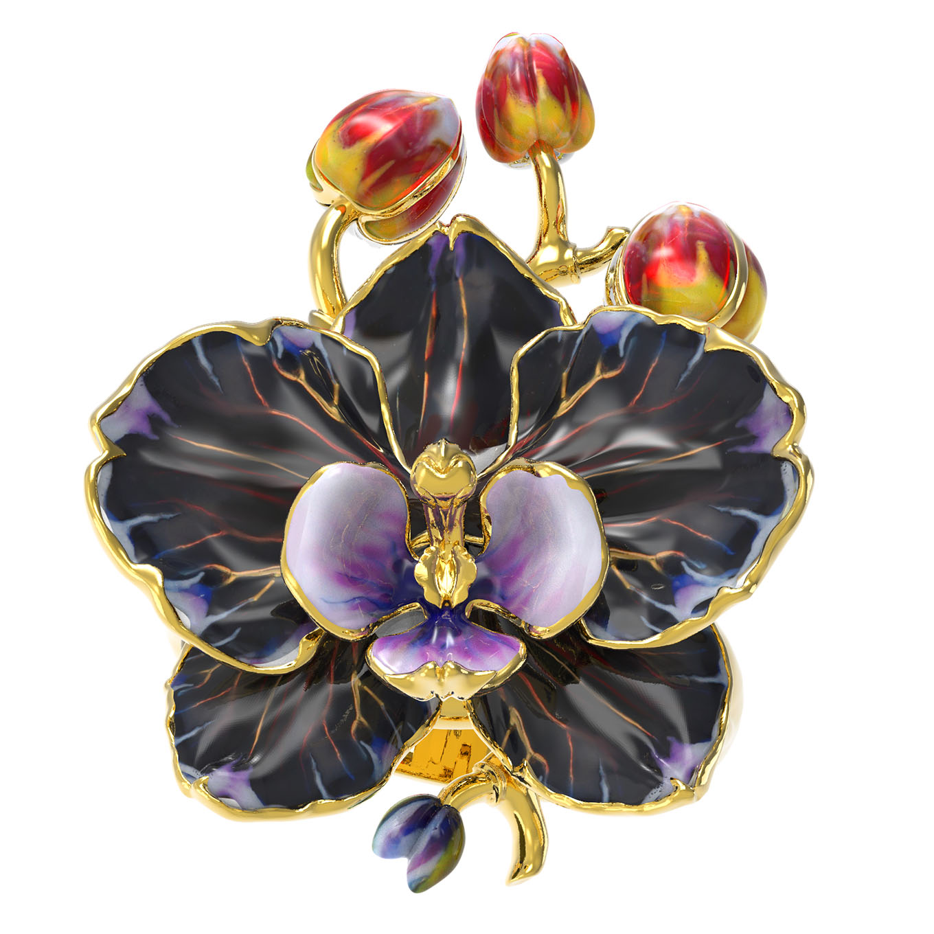 Кольцо из лимонного золота 585 пробы из коллекции De luxe Premium — Орхидеи станет изысканным акцентом вашего образа, привнося в него нотки утонченности и природной красоты. Центральным элементом украшения является искусное ювелирное исполнение живой орхидеи, выполненное в уникальном дизайне, который подчеркивает статусность и внимание к деталям. Благородный блеск лимонного золота гармонично сочетается с выразительной разноцветной эмалью, создавая эффектный и живой контраст, напоминающий о великолепии экзотического цветка.