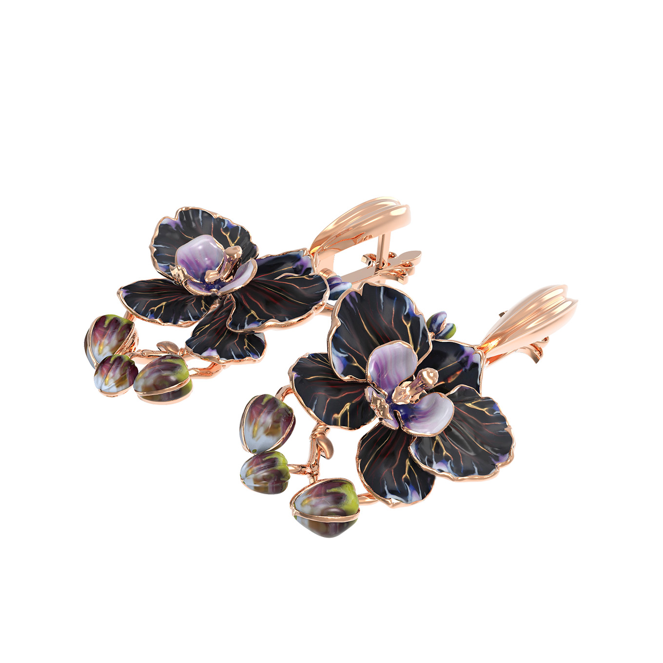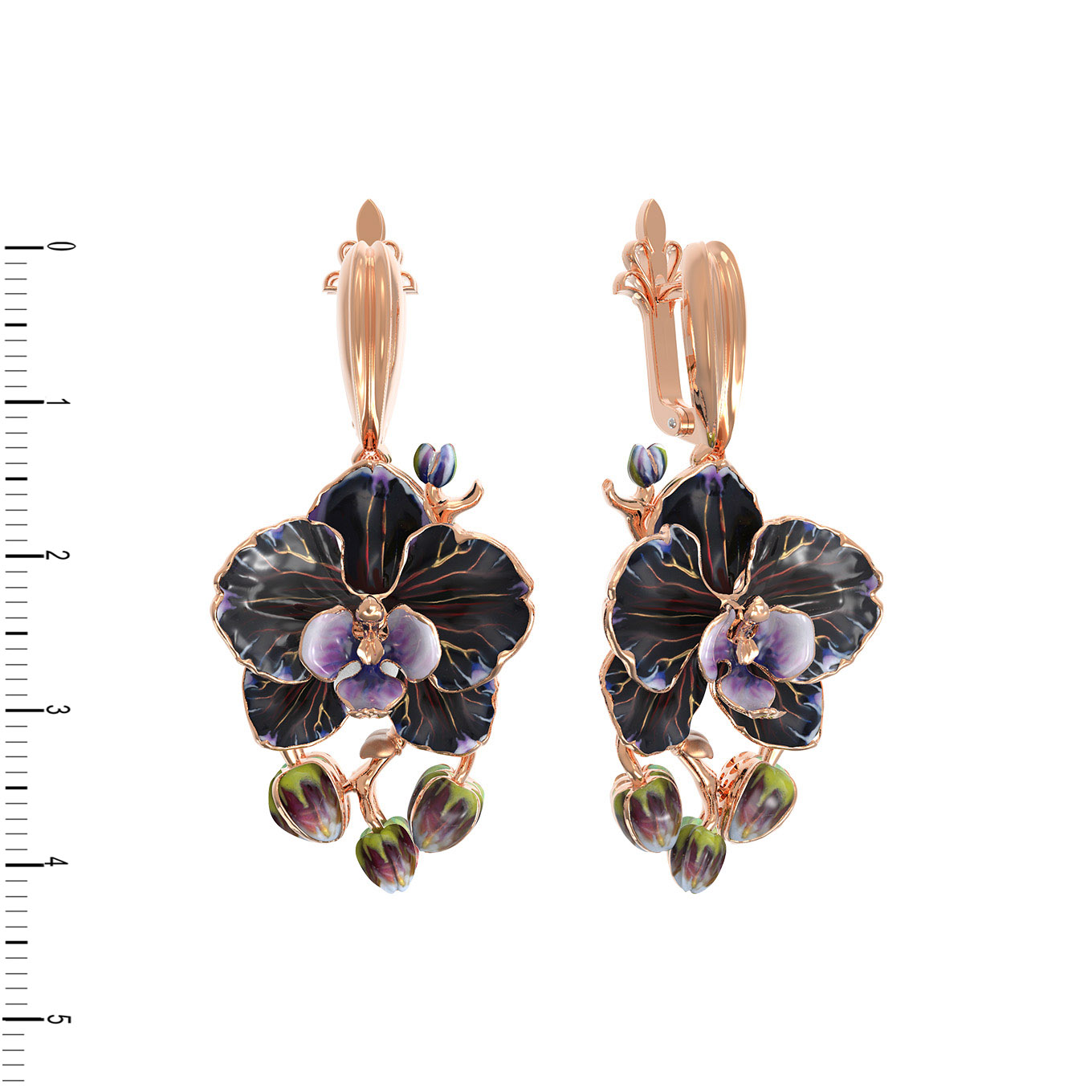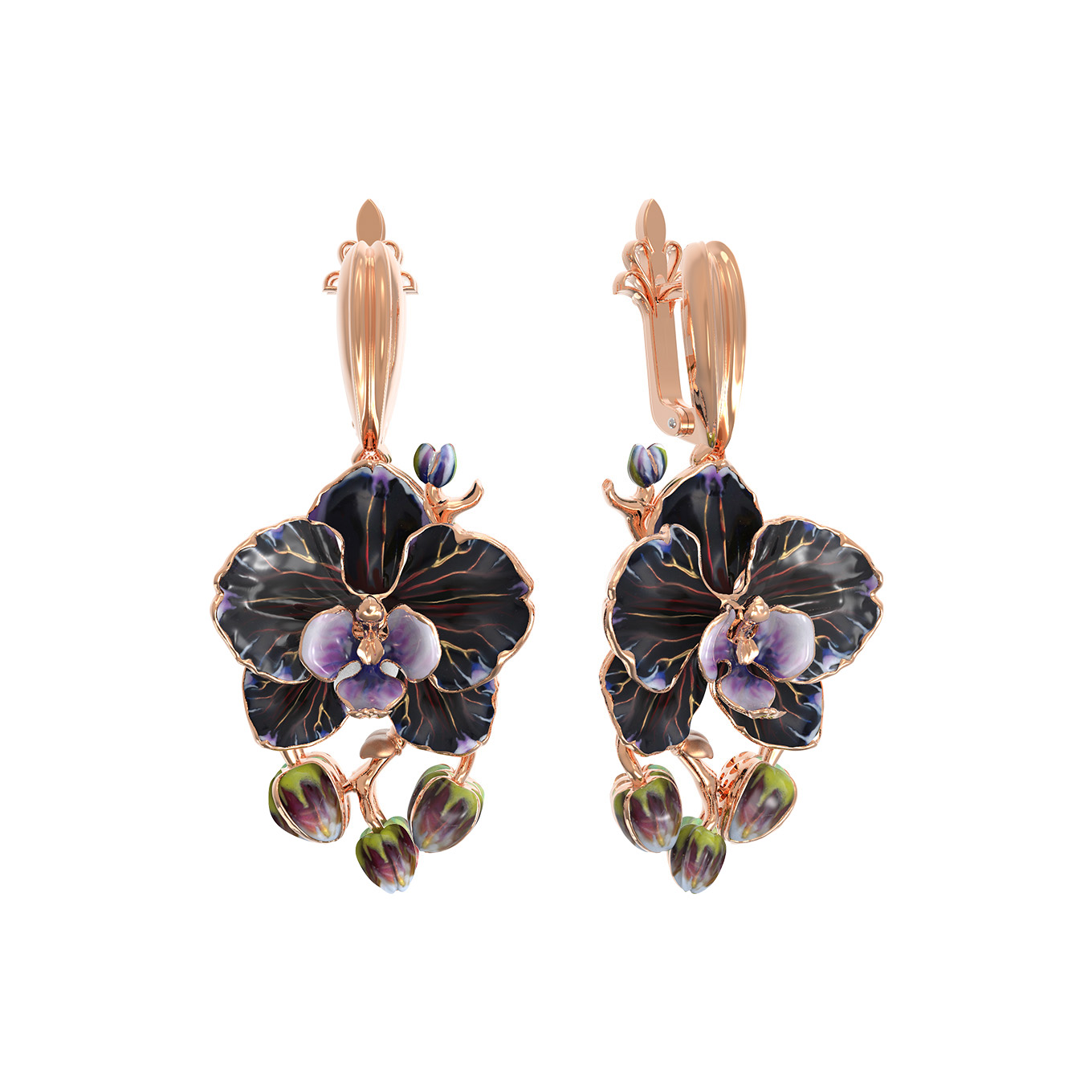 Серьги из красного золота 585 пробы из коллекции De luxe Premium — Орхидеи представляют собой изысканное сочетание ювелирного мастерства и природной грации. Дизайн изделия вдохновлен нежными цветами орхидей, чьи лепестки мастерски переданы с помощью техники эмалирования. Разноцветная эмаль глубоких и насыщенных оттенков подчеркивает тонкую проработку каждого элемента, создавая реалистичный и притягательный образ.