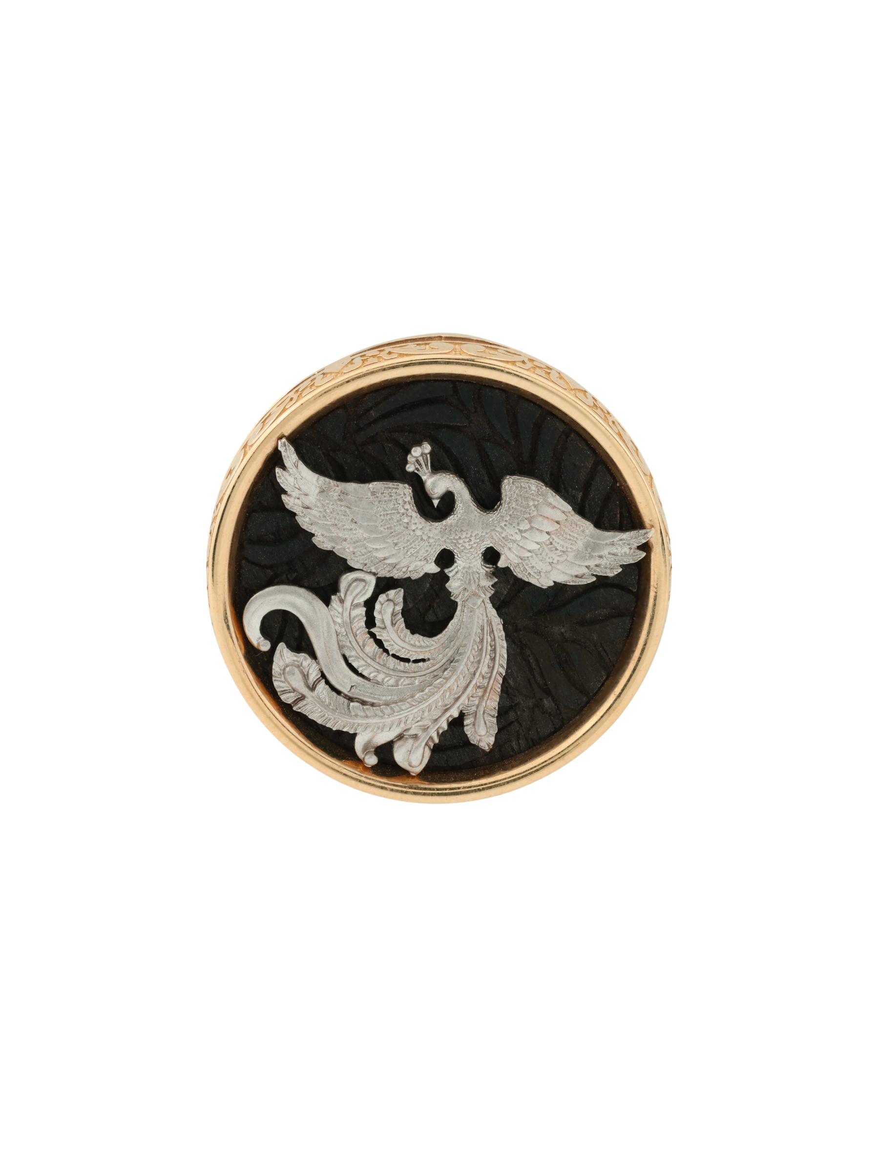 Представляем вашему вниманию изысканное кольцо, созданное для ценителей глубокого символизма и премиальных материалов. Украшение входит в коллекцию De luxe Premium — Птица феникс, вдохновленную магией мифологии. Центральным элементом дизайна является величественный образ птицы Феникс, символизирующий возрождение и вечную красоту. Детально проработанное изображение мифического существа эффектно контрастирует с глубоким черным цветом вставки из эбенового дерева, имеющей форму круга.