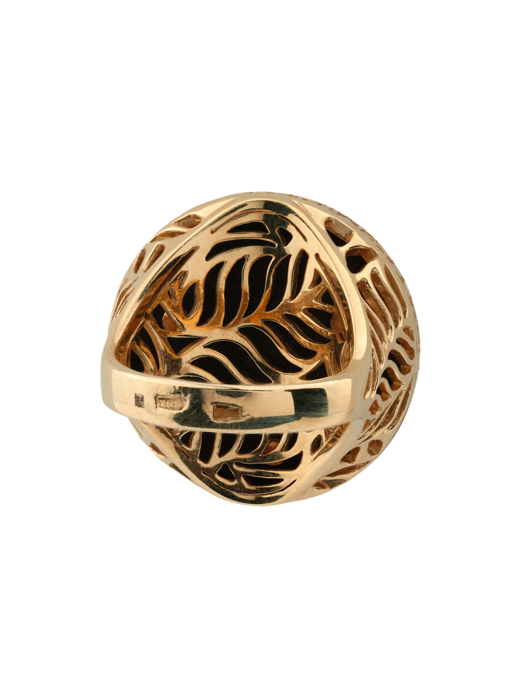Данное кольцо выполнено из красного золота 585 пробы, что обеспечивает изделию благородный теплый оттенок и долговечность. Гармоничное сочетание красного золота и темного эбена создает выразительный образ, который подчеркнет статус и индивидуальность владельца. Уникальный дизайн, выполненный в стилистике мифологии, делает этот аксессуар не просто ювелирным изделием, а значимым талисманом.