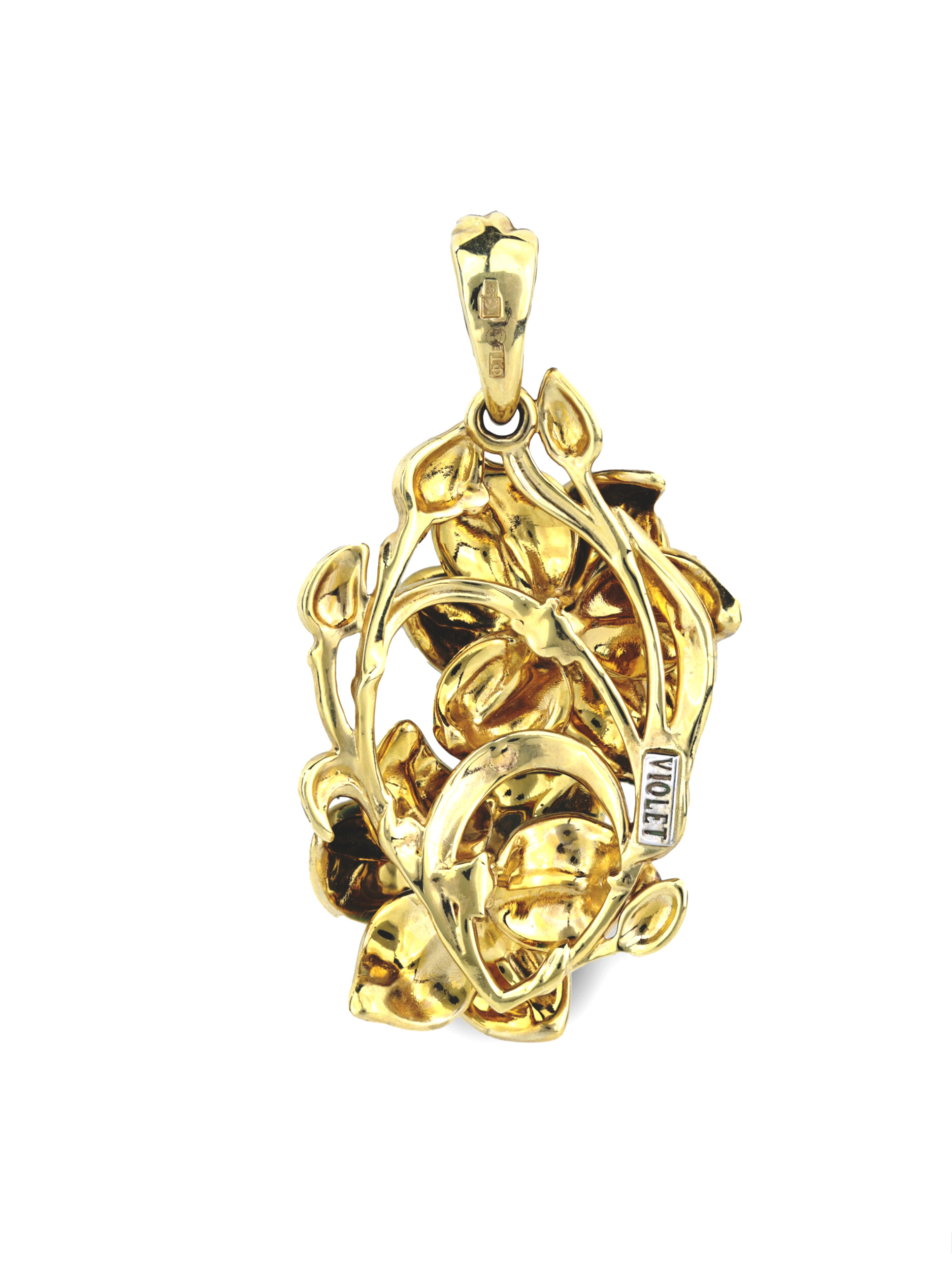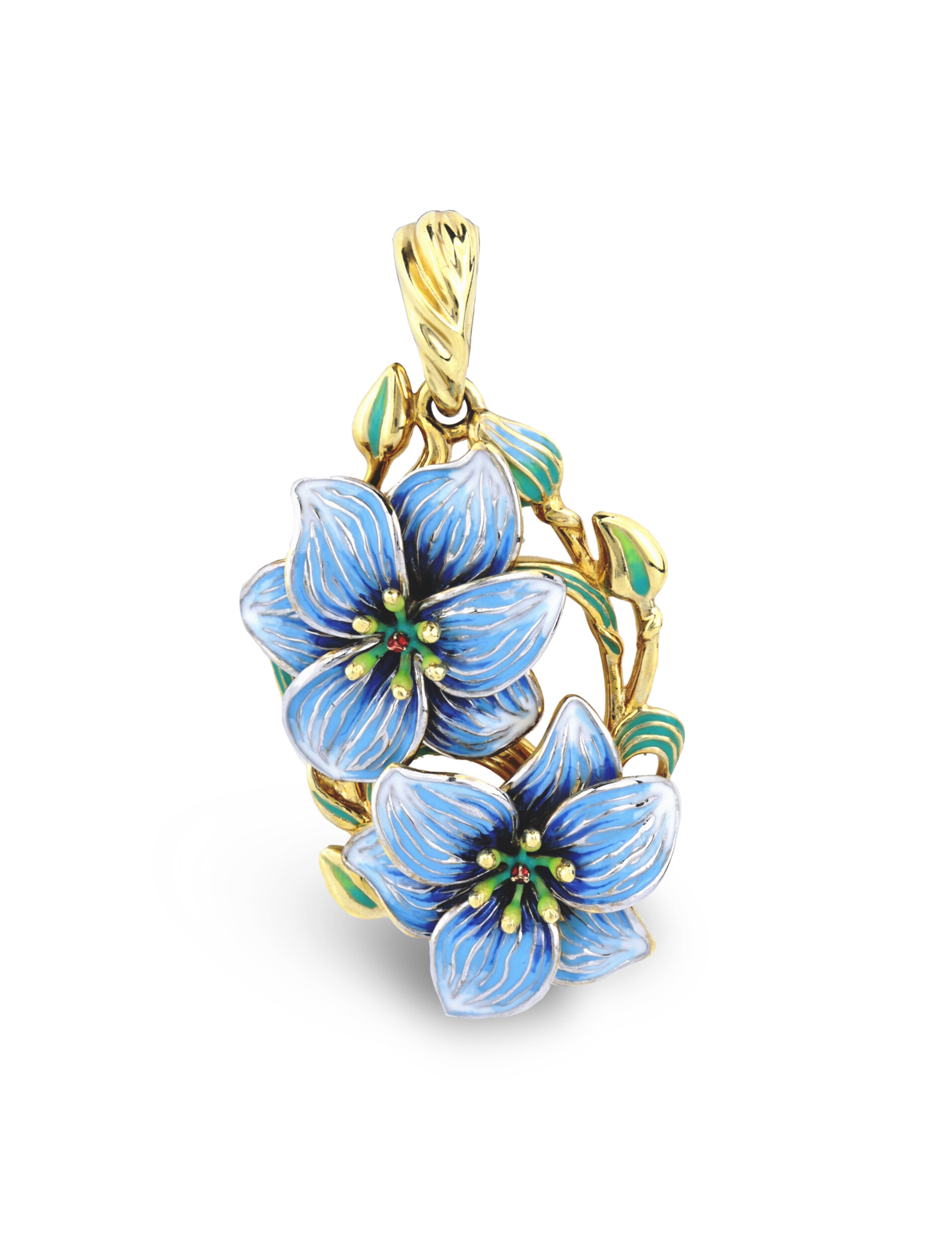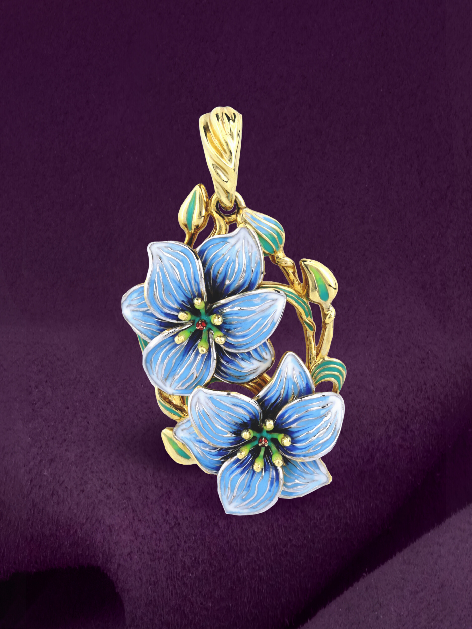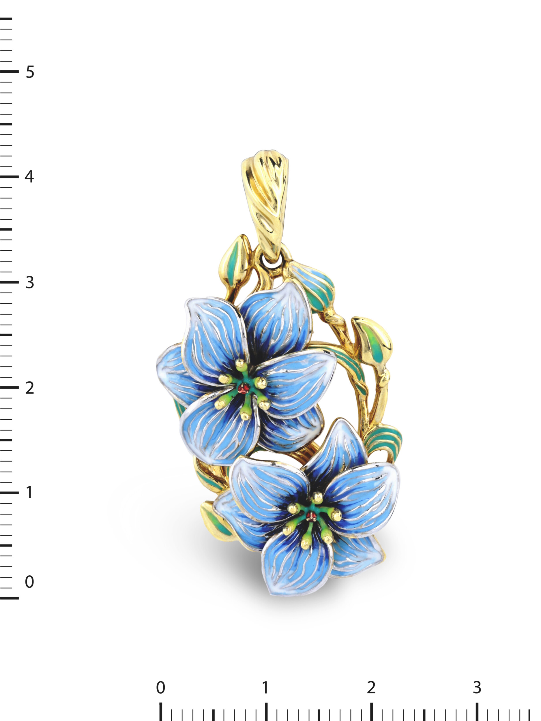 Центральным элементом композиции является искусная эмаль, выполненная в насыщенных, разноцветных тонах. Нежные лепестки, покрытые качественной эмалью, оживают в золотой оправе, создавая динамичный и глубокий визуальный эффект. Использование техники эмалирования позволяет придать украшению яркость и стойкость, делая его идеальным акцентом как для повседневного, так и для вечернего образа.