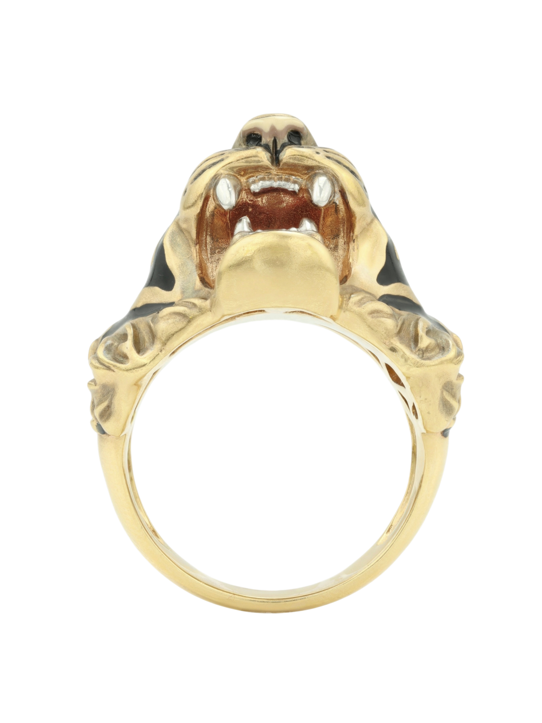 Для создания контрастного образа использована техника нанесения разноцветной эмали, которая эффектно выделяет характерные полосы и детали морды животного на фоне лимонного золота. Это ювелирное изделие гармонично дополнит строгий деловой костюм или станет частью неформального стиля, привлекая внимание окружающих своей харизмой.