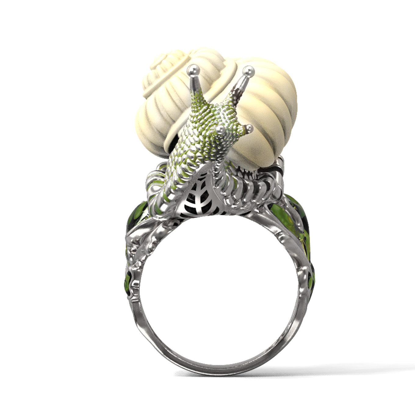 Основа изделия изготовлена из качественного белого золота 585 пробы, что обеспечивает прочность и долговечность украшения. Художественное исполнение подчеркнуто ювелирной эмалью, создающей яркий и детализированный разноцветный узор на поверхности. Искусная работа мастеров позволила передать динамику и живость образа, благодаря чему кольцо выглядит словно миниатюрное произведение искусства.