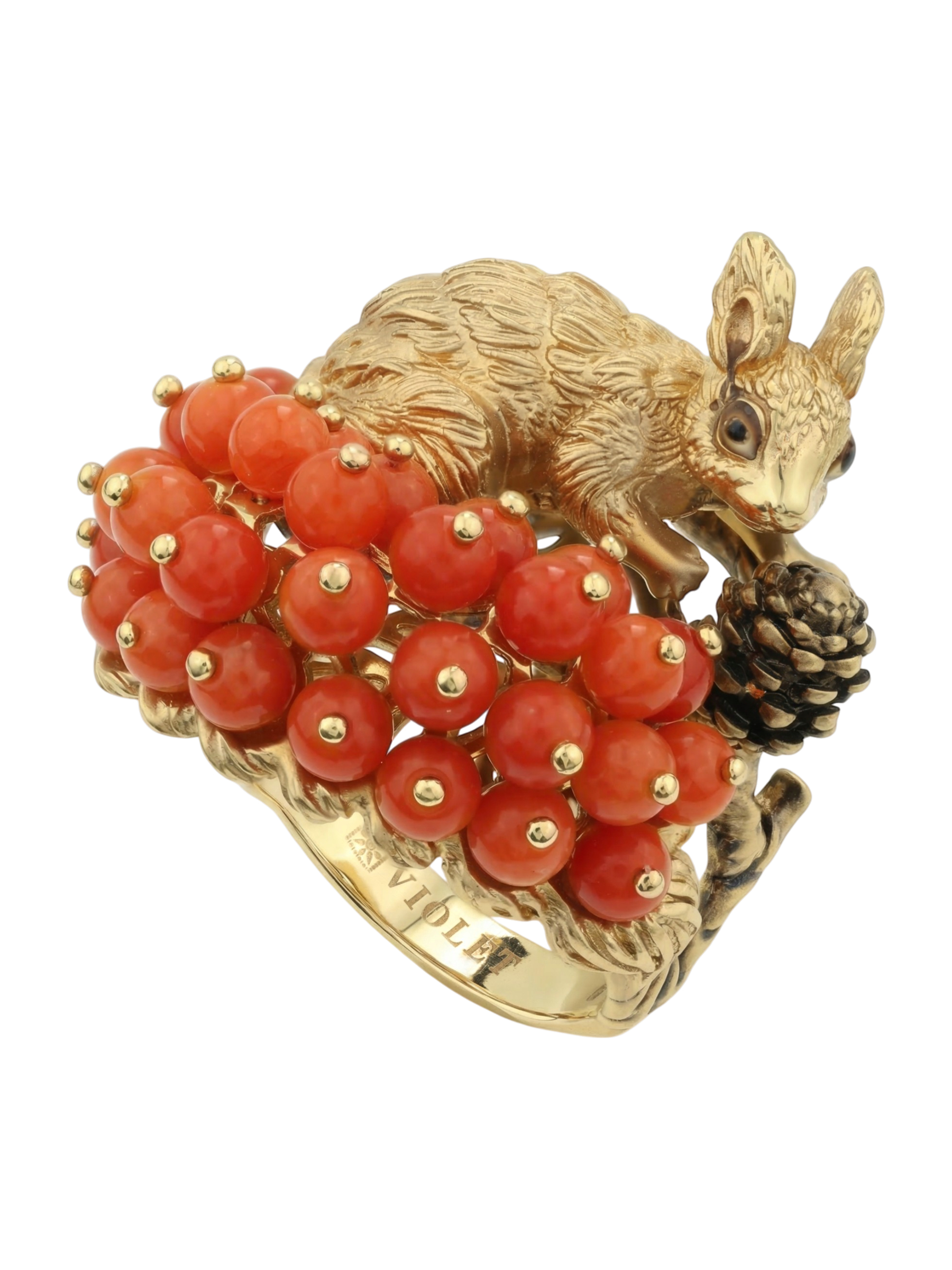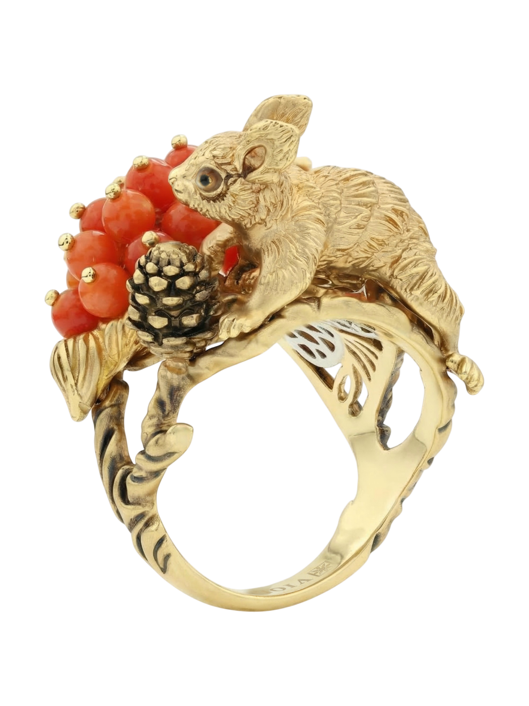 Особую выразительность изделию придает сочетание благородного лимонного золота и насыщенных вставок. Декор украшен тридцатью вставками из натурального коралла, имеющими форму изящных бусин красного цвета. Аккуратные элементы из разноцветной эмали гармонично дополняют композицию, создавая глубокий и многогранный визуальный эффект. Каждая деталь проработана с максимальной тщательностью, что делает данное кольцо по-настоящему статусным аксессуаром.