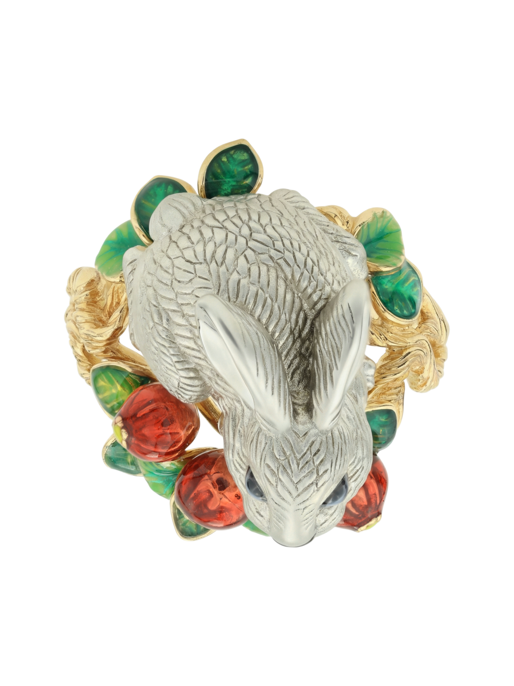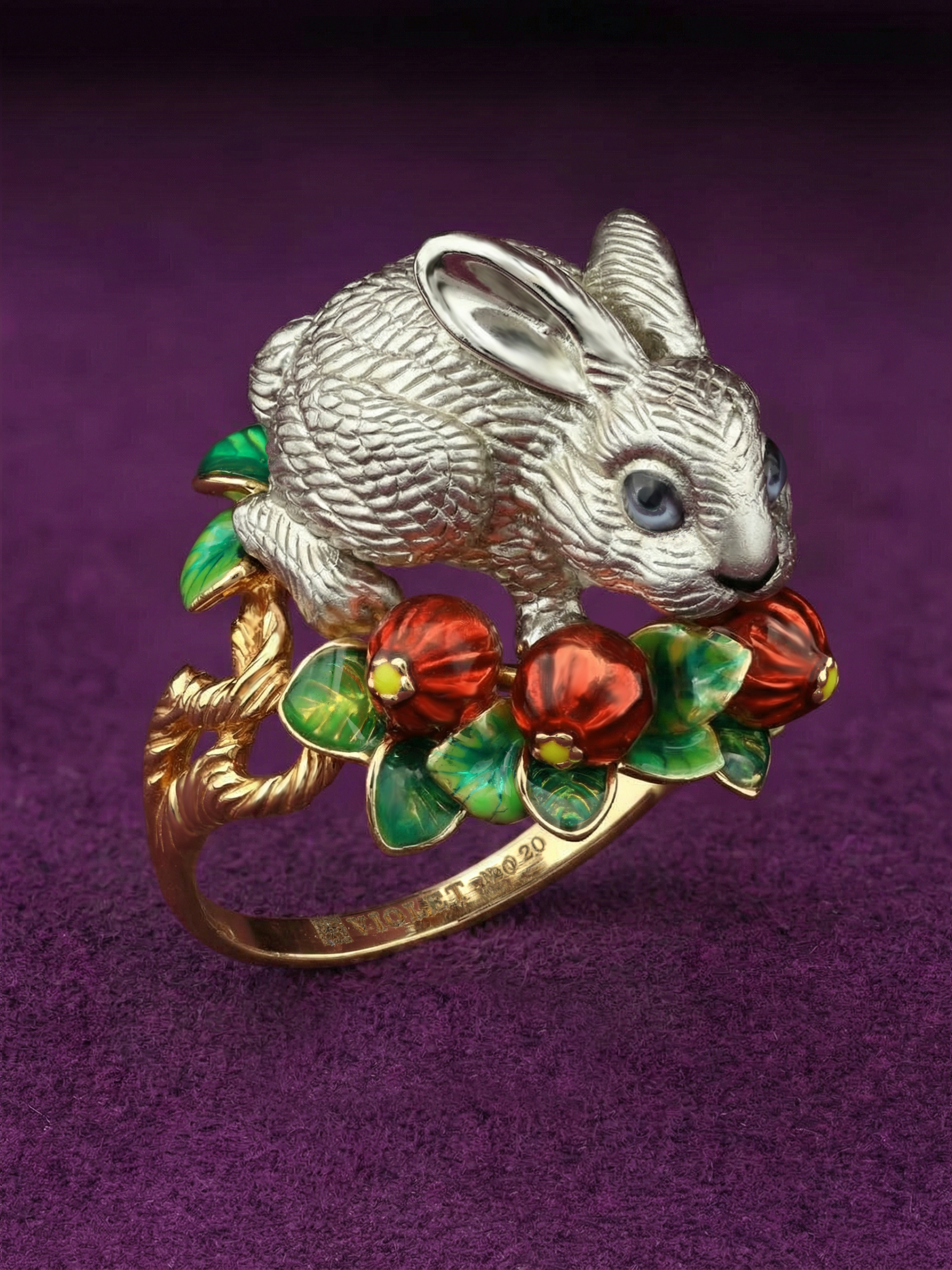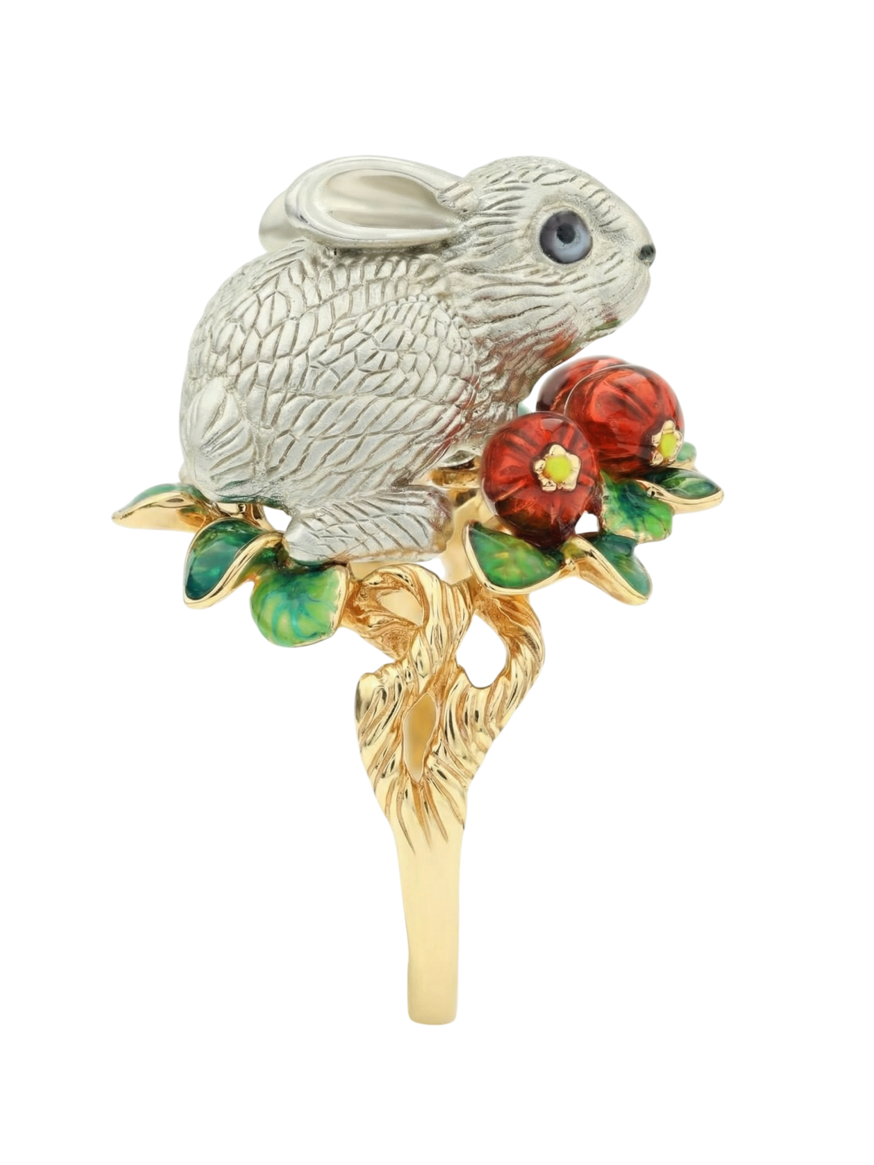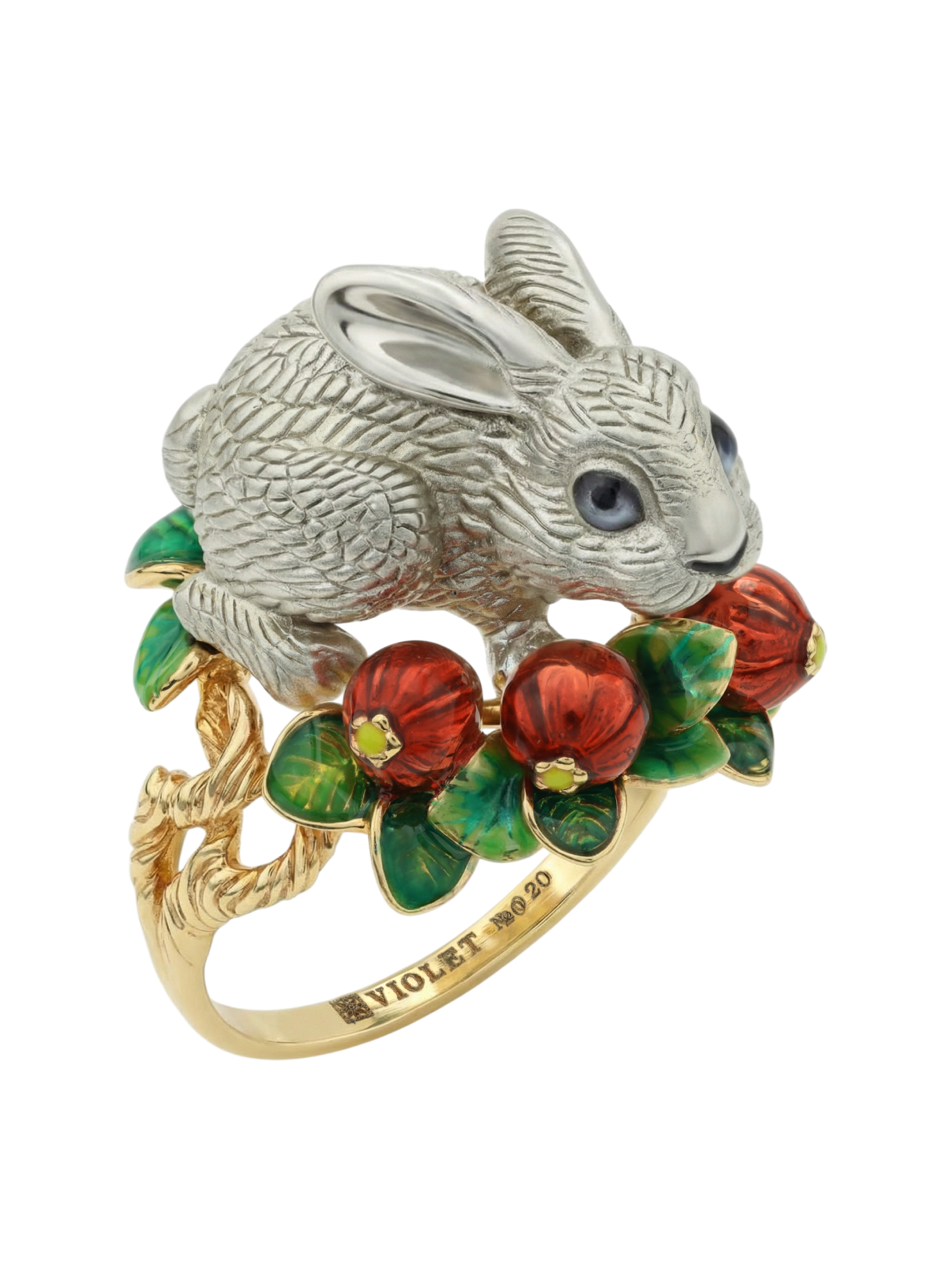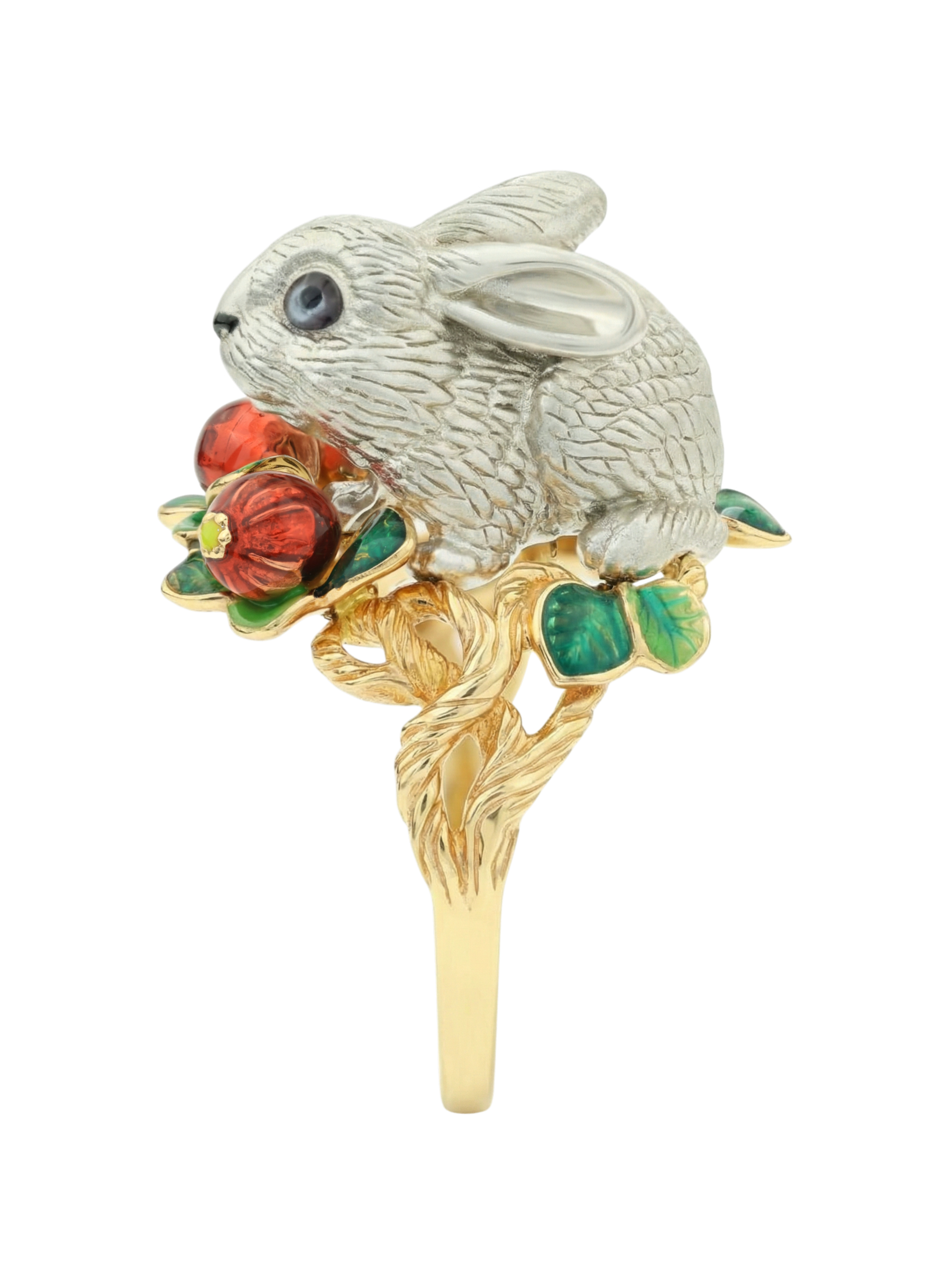 Изысканное кольцо из лимонного золота 585 пробы из коллекции De luxe Premium — Кролик станет ярким акцентом в вашем образе. Дизайн украшения воплощает сказочную эстетику: центральным элементом композиции является искусная фигурка зайца, дополненная деталями с разноцветной эмалью, которые придают изделию живой и выразительный вид. Сочетание благородного лимонного золота и сочных оттенков эмали создает гармоничную игру цвета, подчеркивающую ювелирное мастерство.