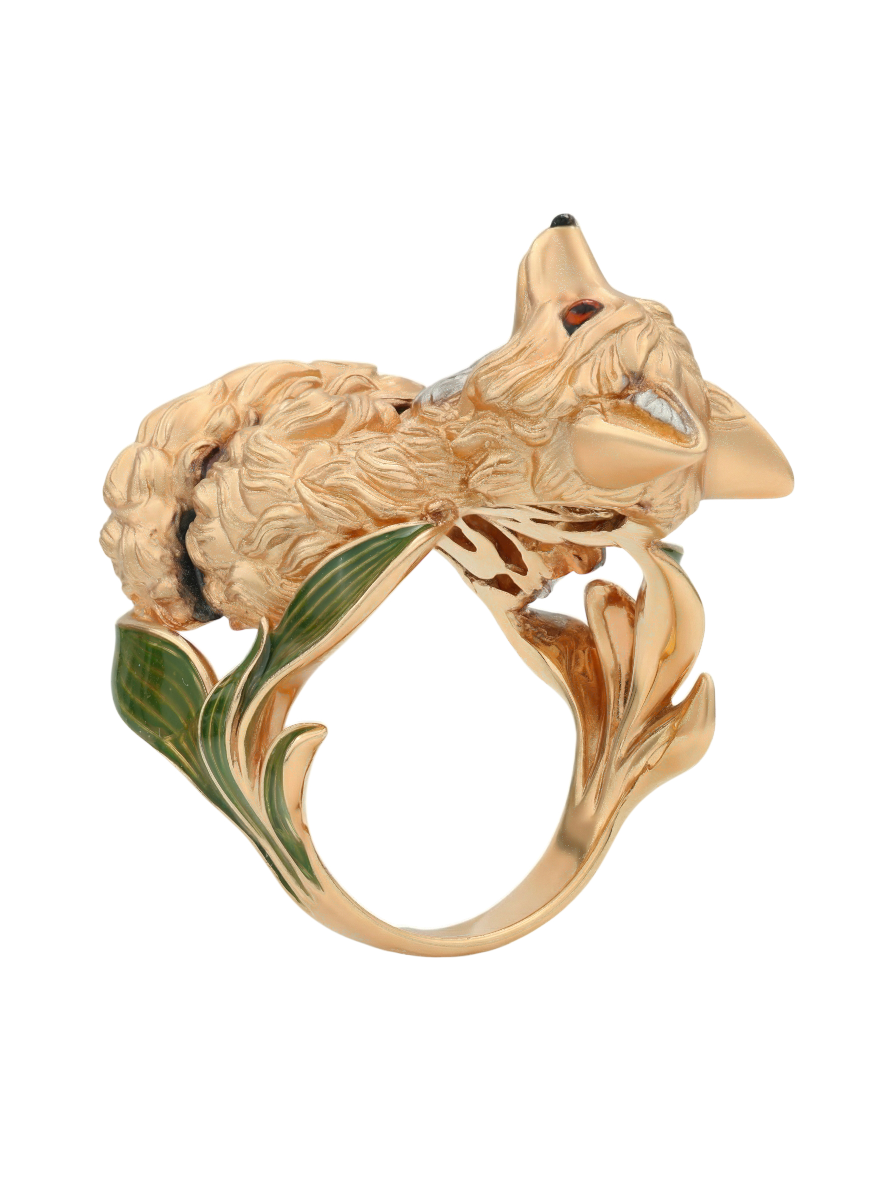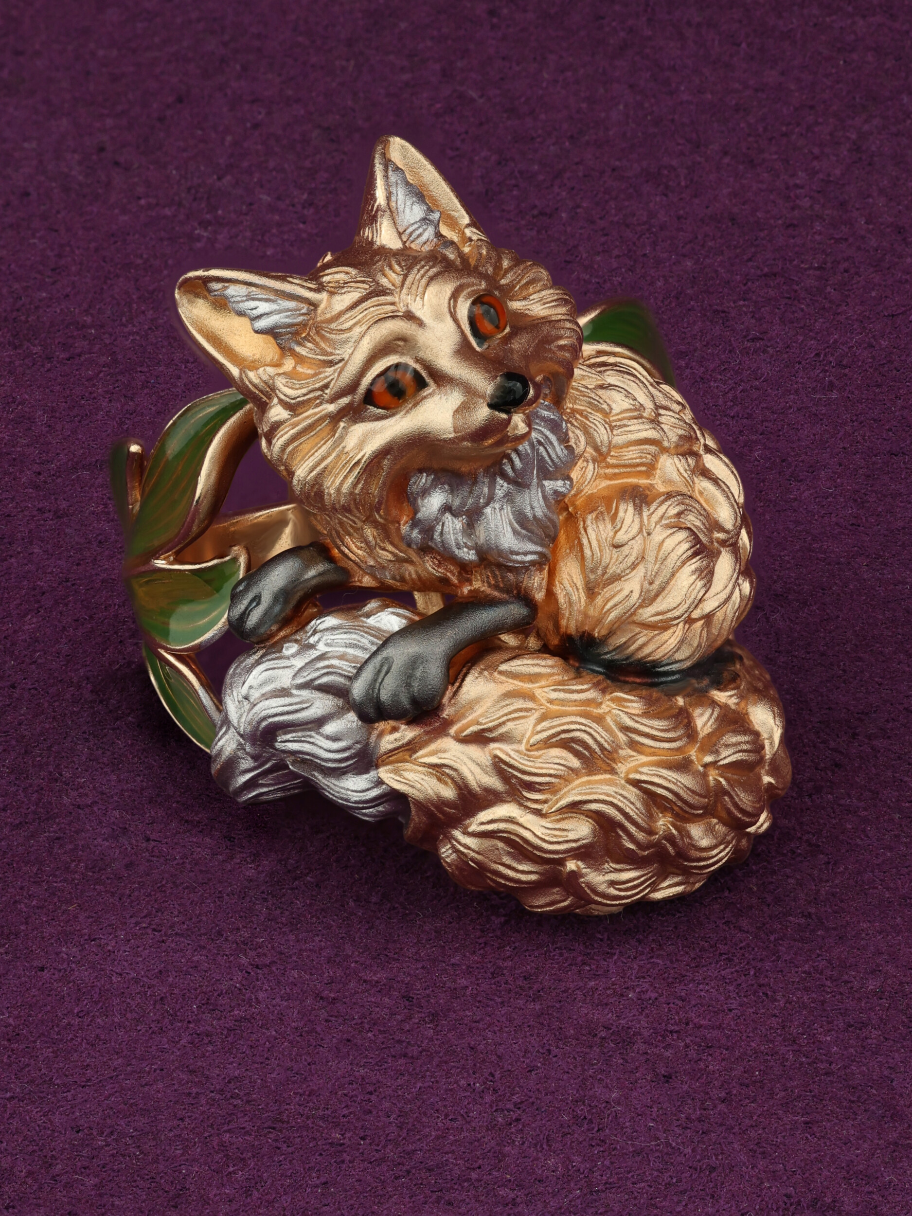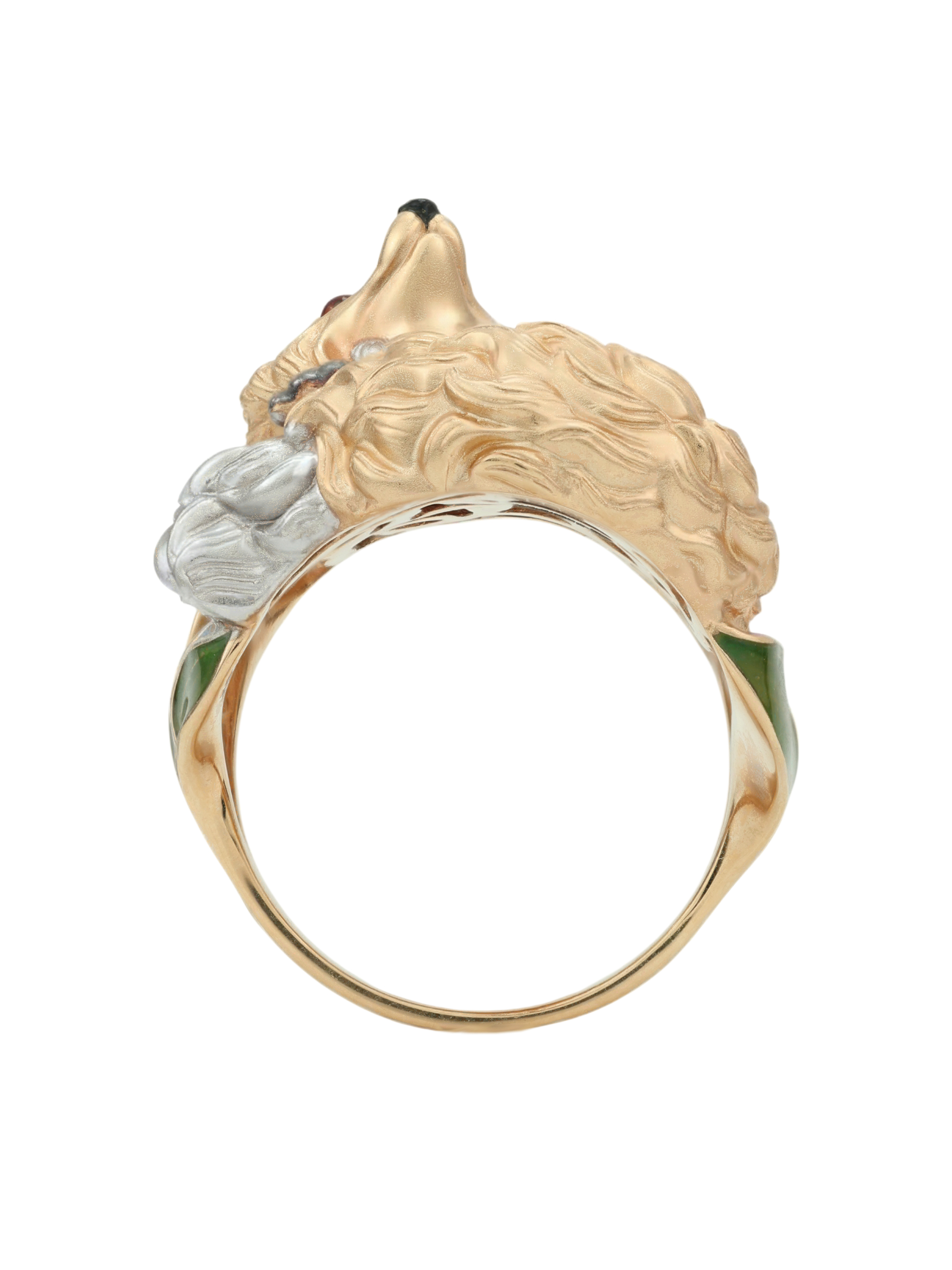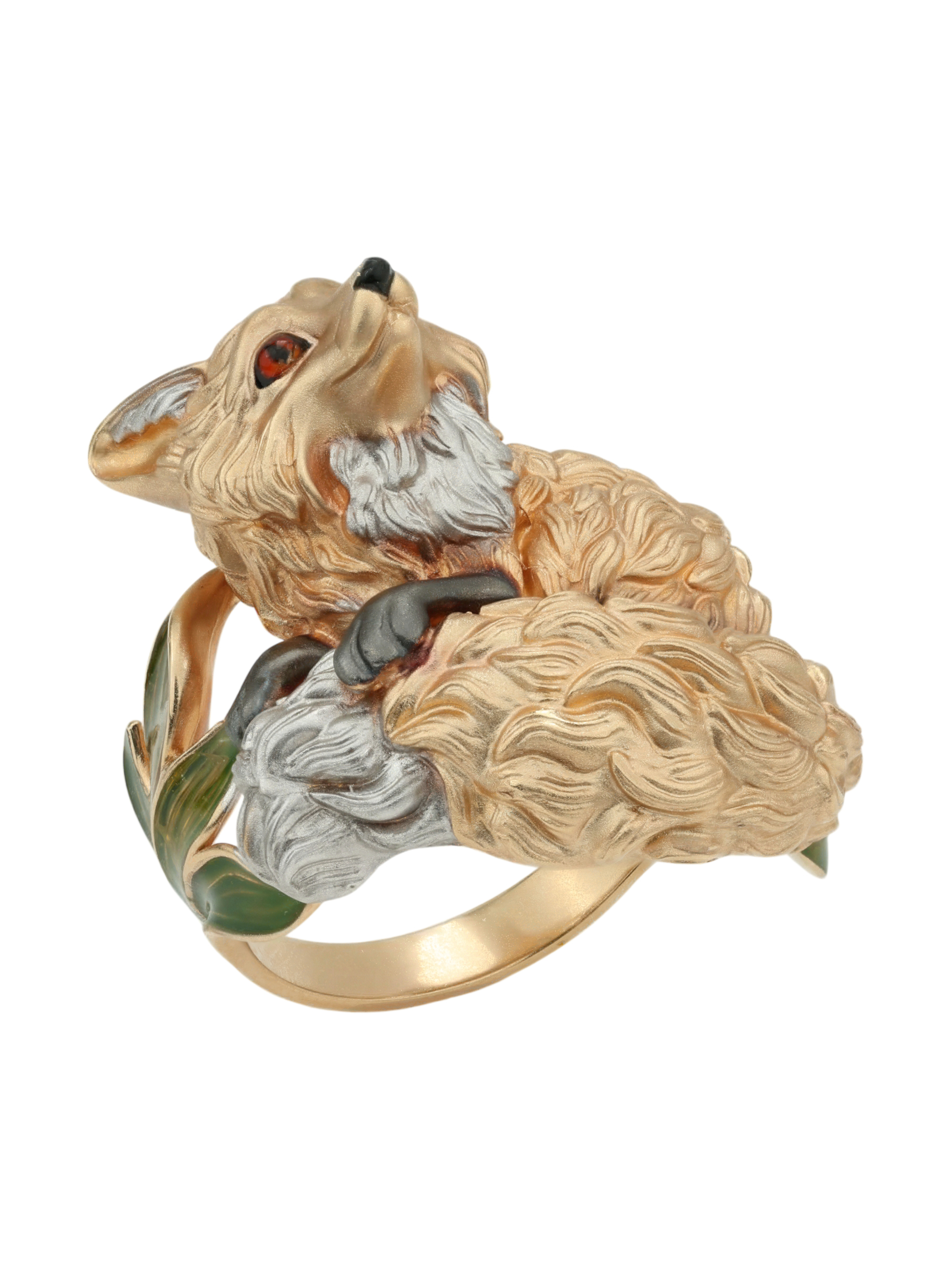 Ярким акцентом изделия выступает цветная эмаль, которая придает украшению глубину и выразительность, делая его вид по-настоящему уникальным. Разноцветные вставки гармонично сочетаются с теплым оттенком драгоценного металла, создавая притягательный визуальный эффект. Это кольцо-лиса станет эффектным дополнением вашего образа и удачно впишется в комплект с другими украшениями.