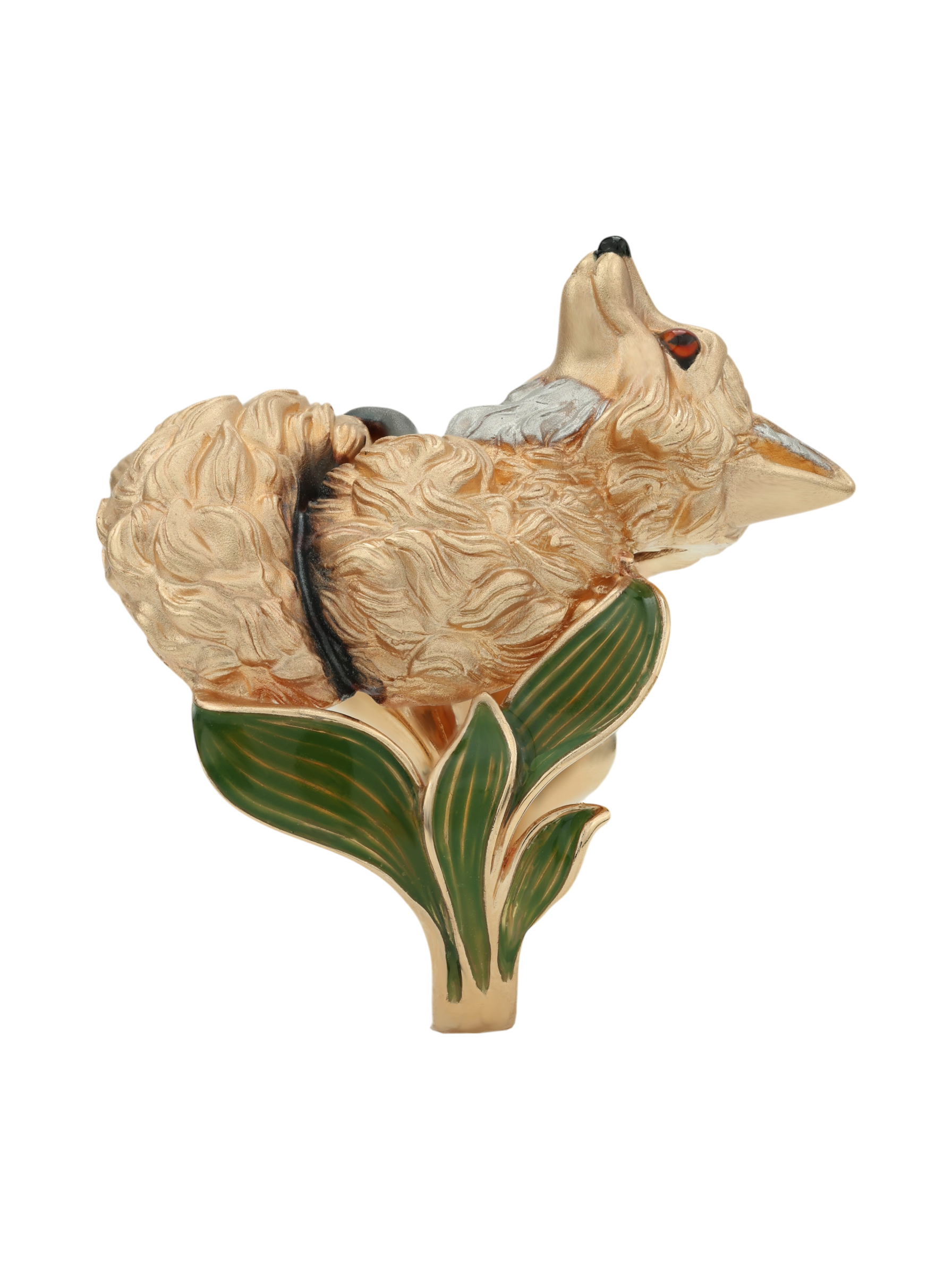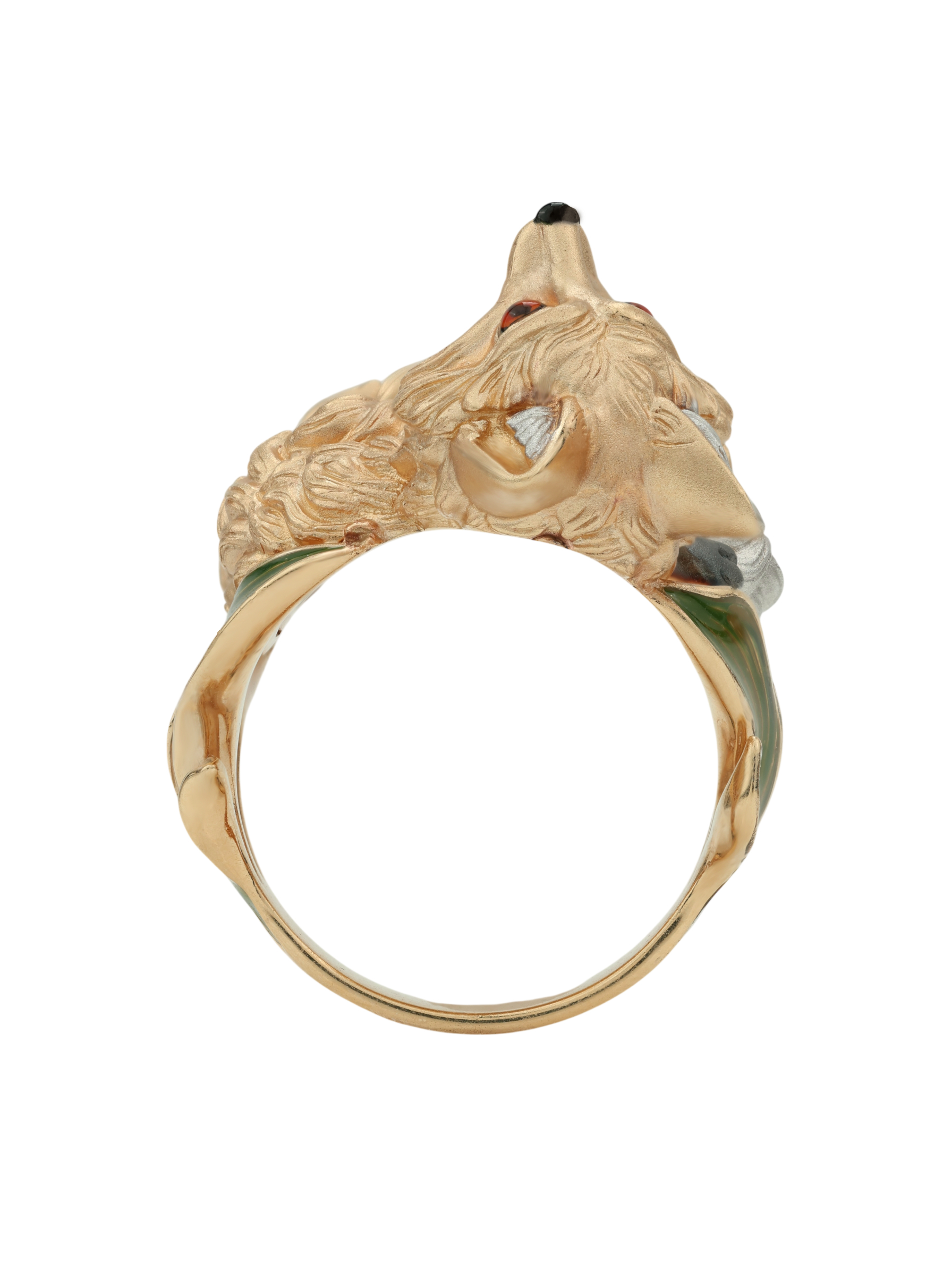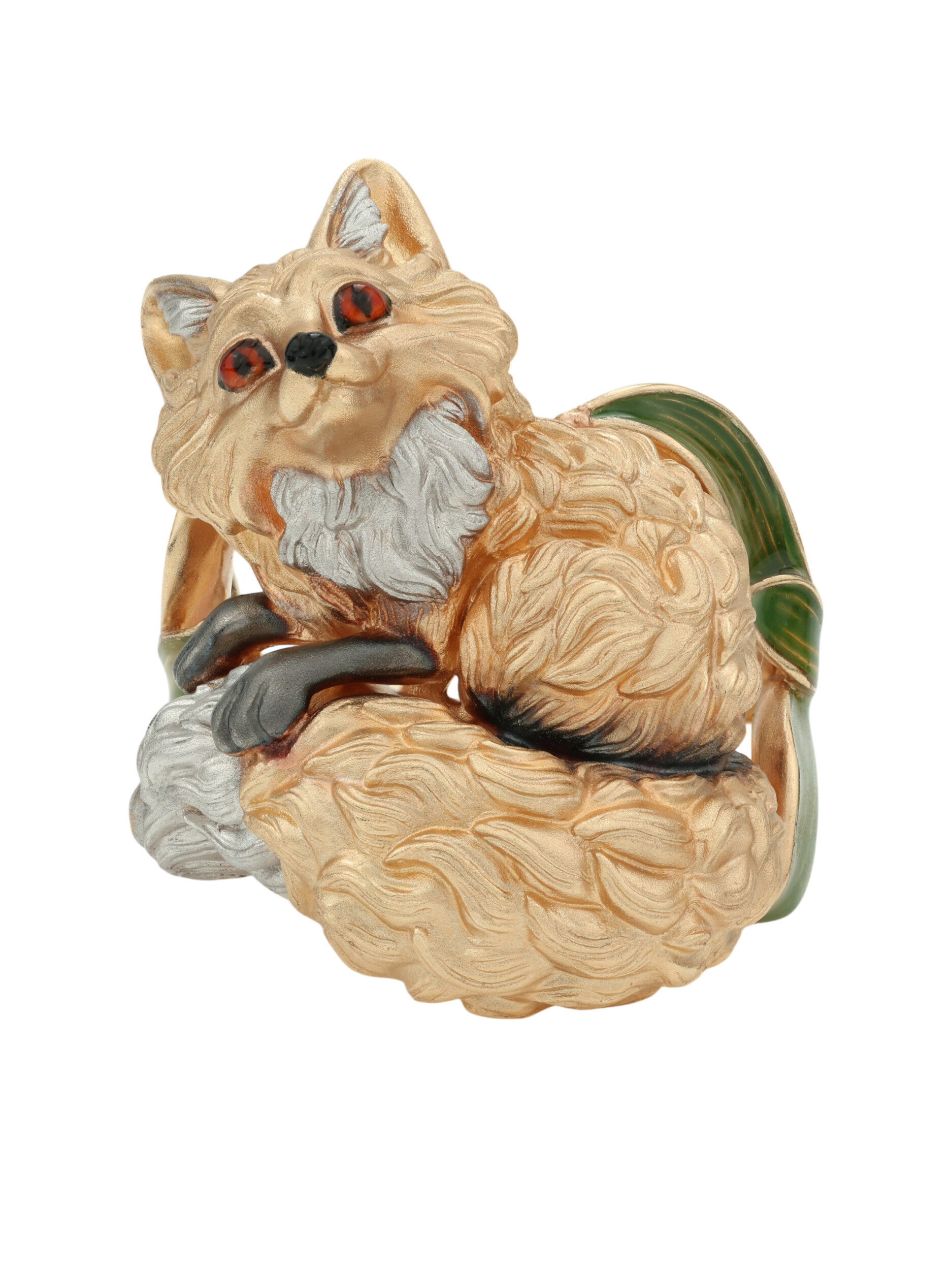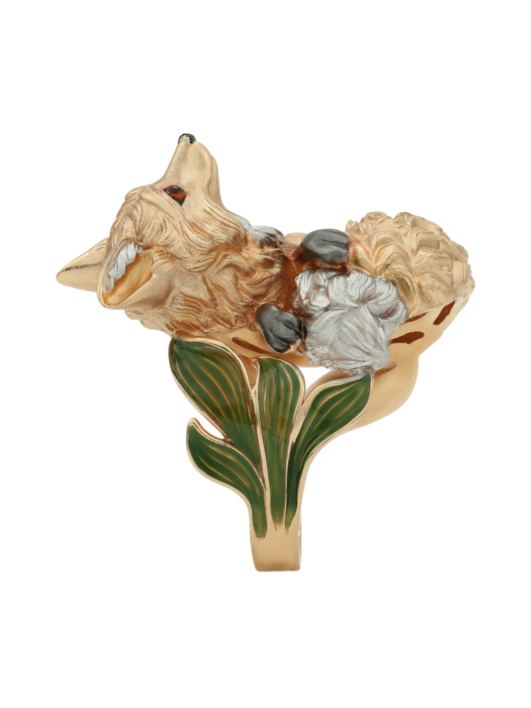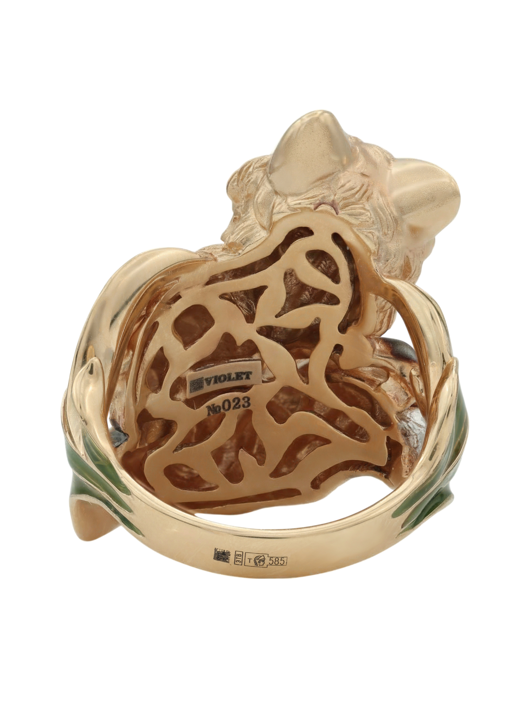 Ярким акцентом изделия выступает цветная эмаль, которая придает украшению глубину и выразительность, делая его вид по-настоящему уникальным. Разноцветные вставки гармонично сочетаются с теплым оттенком драгоценного металла, создавая притягательный визуальный эффект. Это кольцо-лиса станет эффектным дополнением вашего образа и удачно впишется в комплект с другими украшениями.