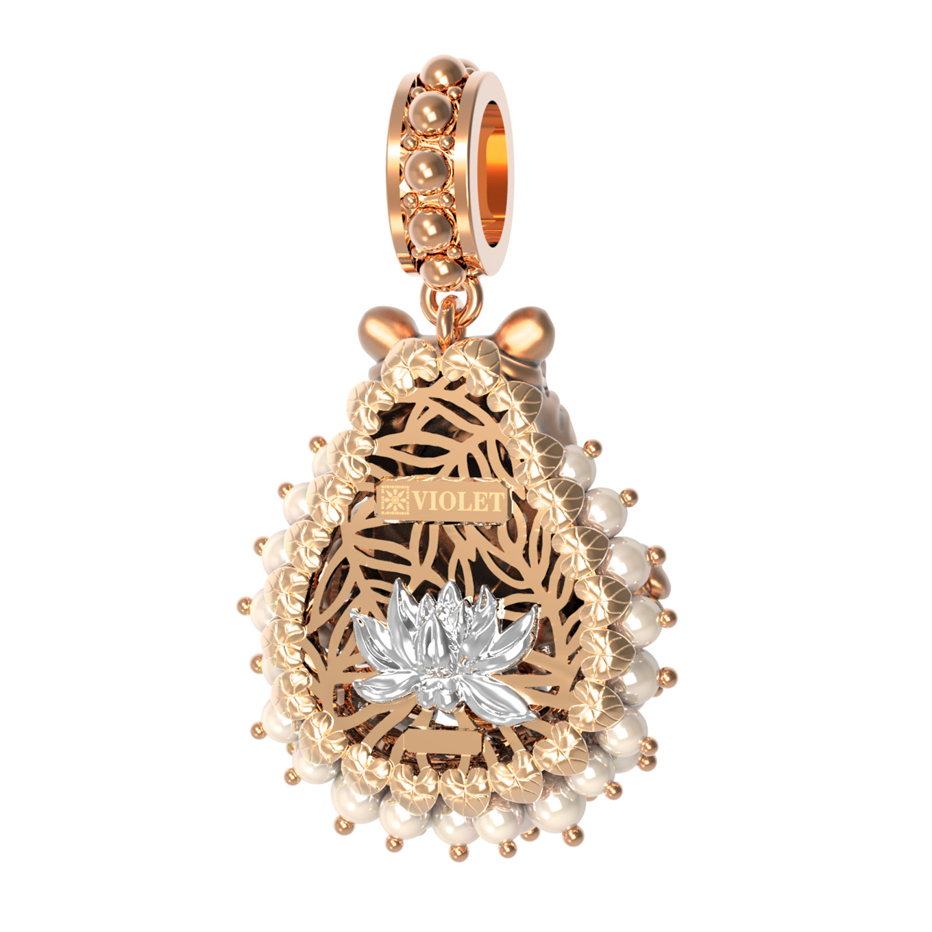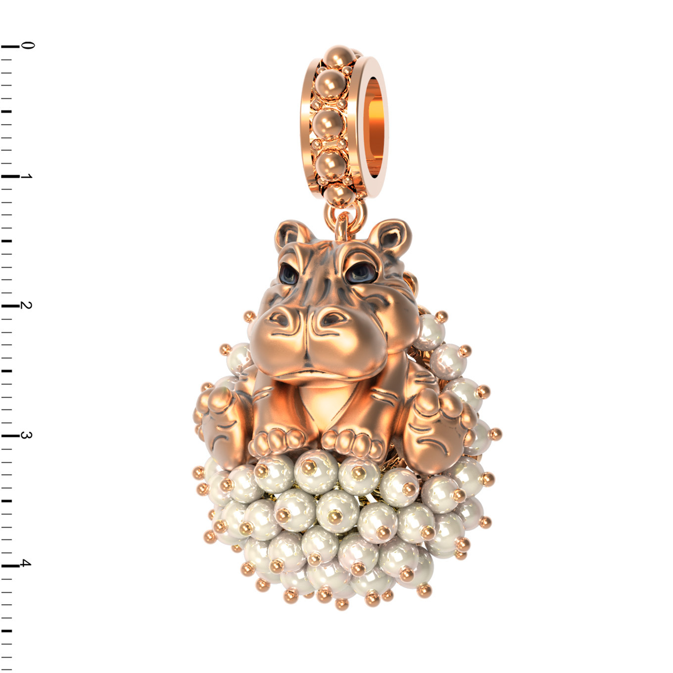 Центральный элемент дизайна — очаровательный бегемотик, выполненный с использованием тонкой эмали. Фигурка животного уютно расположилась в окружении 42 вставок из жемчуга белого цвета. Круглая форма вставок гармонично дополняет композицию, создавая изысканный визуальный эффект.