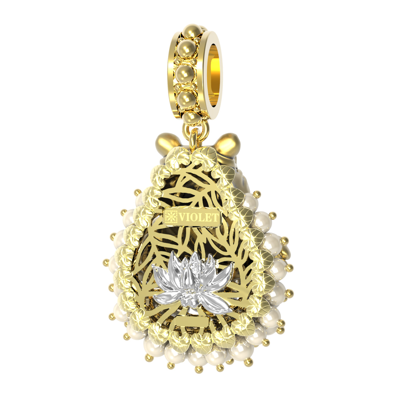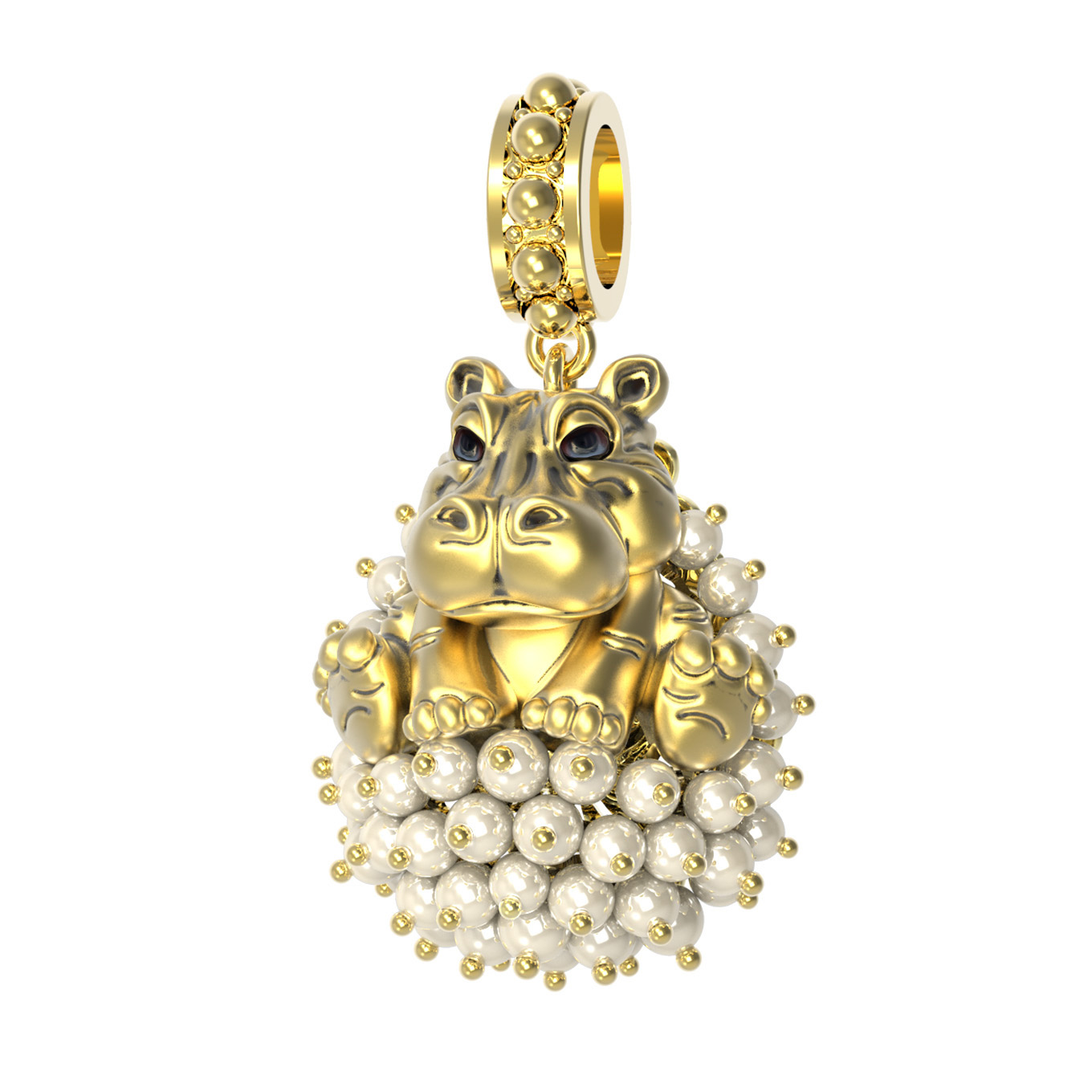 Центральный элемент дизайна — детально проработанная фигурка бегемотика, которая расположилась на изящном основании. Особую выразительность композиции придают 42 вставки: сочетание жемчуга и эмали создает гармоничный контраст. Круглая форма вставок белого и разноцветного цвета добавляет изделию фактурности и объема, превращая его в настоящий арт-объект. Такая подвеска универсальна: она одинаково эффектно будет смотреться как в женских, так и в мужских образах, становясь предметом обсуждения и восхищения.