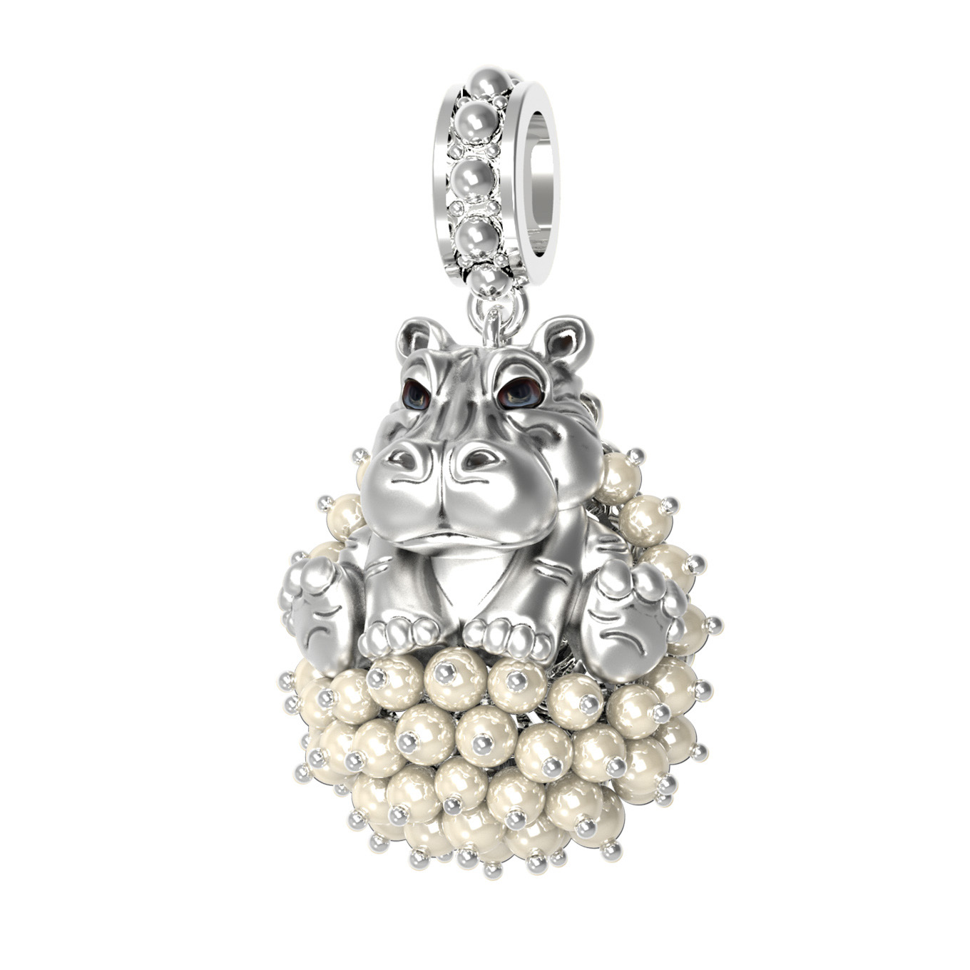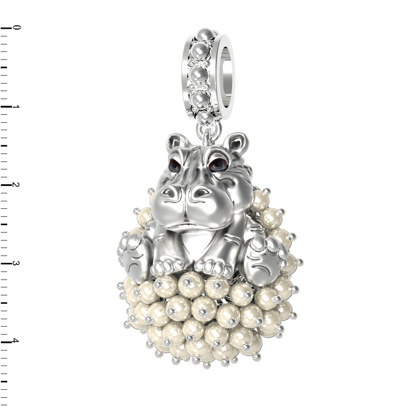 Центральный элемент изделия гармонично сочетается с россыпью из 42 вставок. Белый цвет материала подчеркивает блеск жемчуга и красоту вставок, выполненных в белом и разноцветном тонах. Использование эмали придает фигурке бегемотика особую выразительность, делая украшение по-настоящему живым и привлекательным. Белое золото в сочетании с изящными вставками создает утонченную композицию, которая будет уместно смотреться как в повседневном стиле, так и в более формальных нарядах.