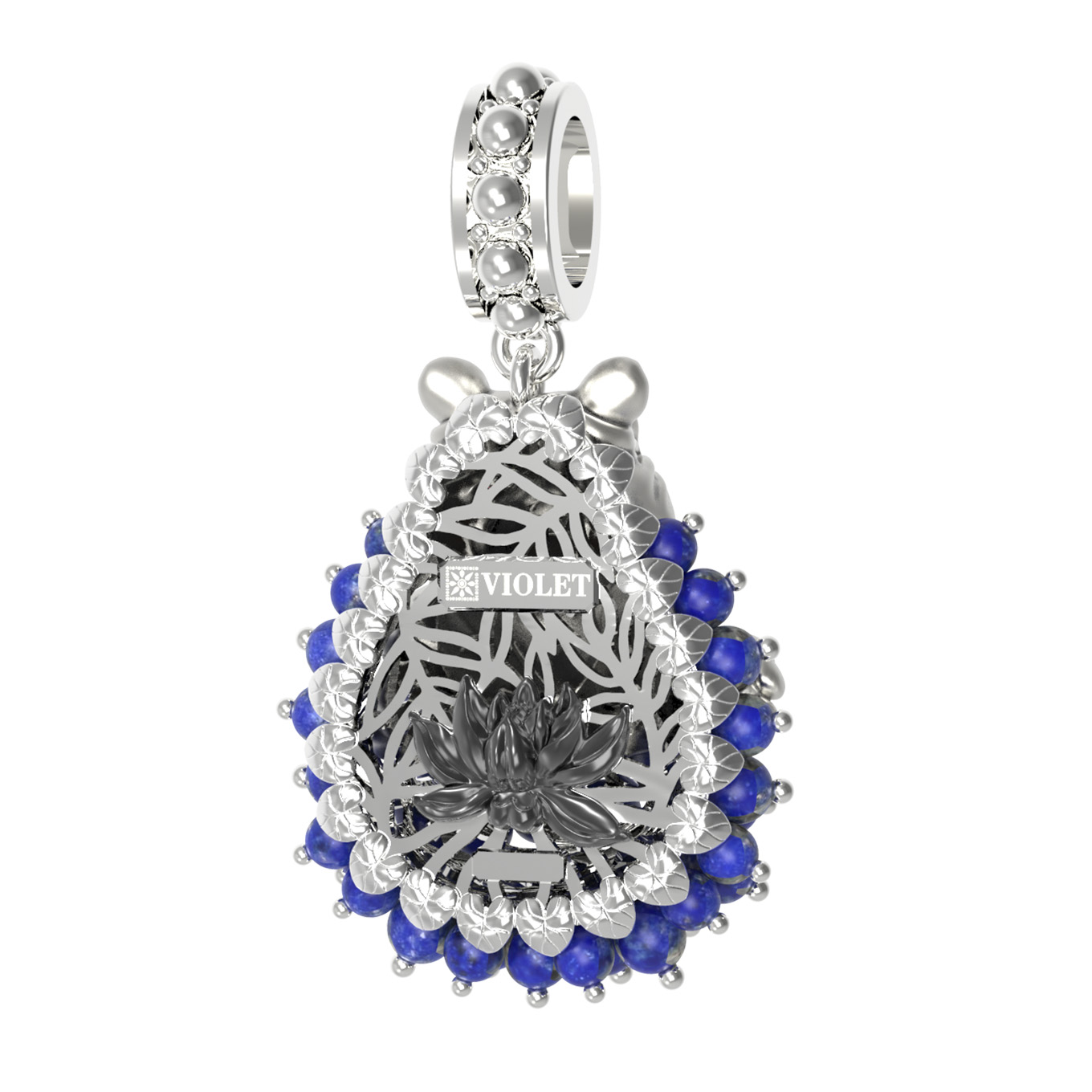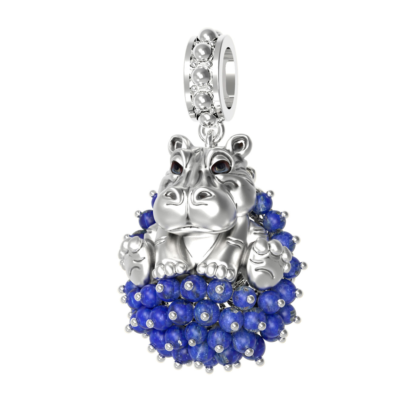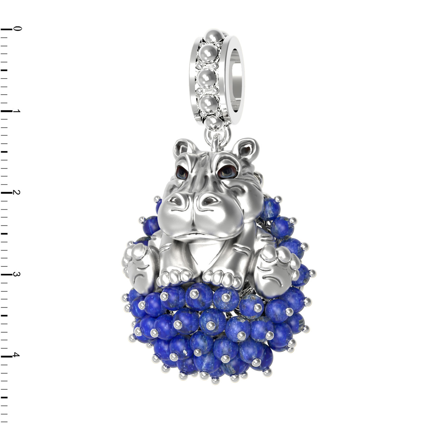 Оригинальная подвеска из белого золота 585 пробы станет ярким акцентом вашего образа. Дизайн украшения, выполненный в анималистической тематике, воплощает в себе мастерство ювелиров и необычный взгляд на классические ювелирные формы. Центром композиции является фигурка бегемотика, которая гармонично сочетается с насыщенными вставками из натурального лазурита. Глубокий синий цвет камней придает изделию благородство и глубину, выделяя его на фоне холодного блеска белого металла.