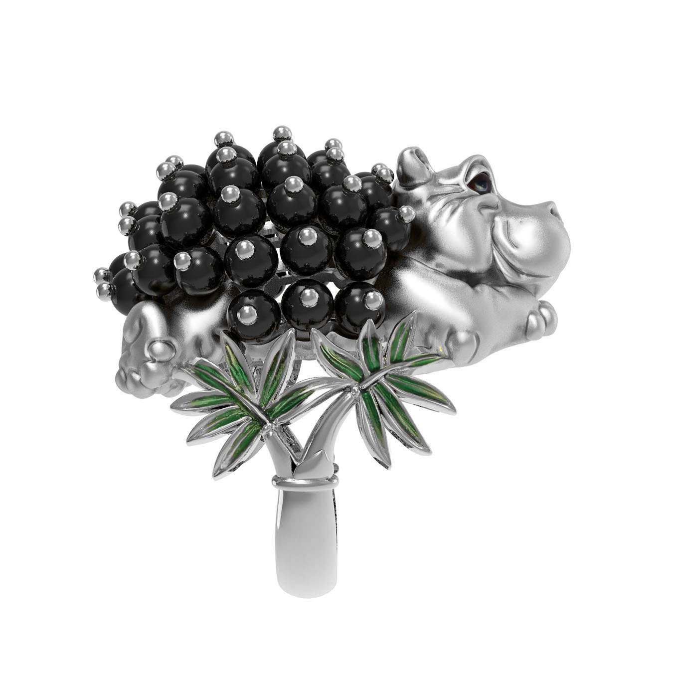 Особую художественную ценность украшению придают 49 вставок из черного оникса, имеющих форму аккуратных бусин, которые создают эффектный объемный декор. Контраст черного камня и сияющего металла дополняется изящными вставками из разноцветной эмали, которые добавляют в композицию свежие нотки и живость. Такое сочетание материалов и фактур делает аксессуар уникальным произведением ювелирного искусства.