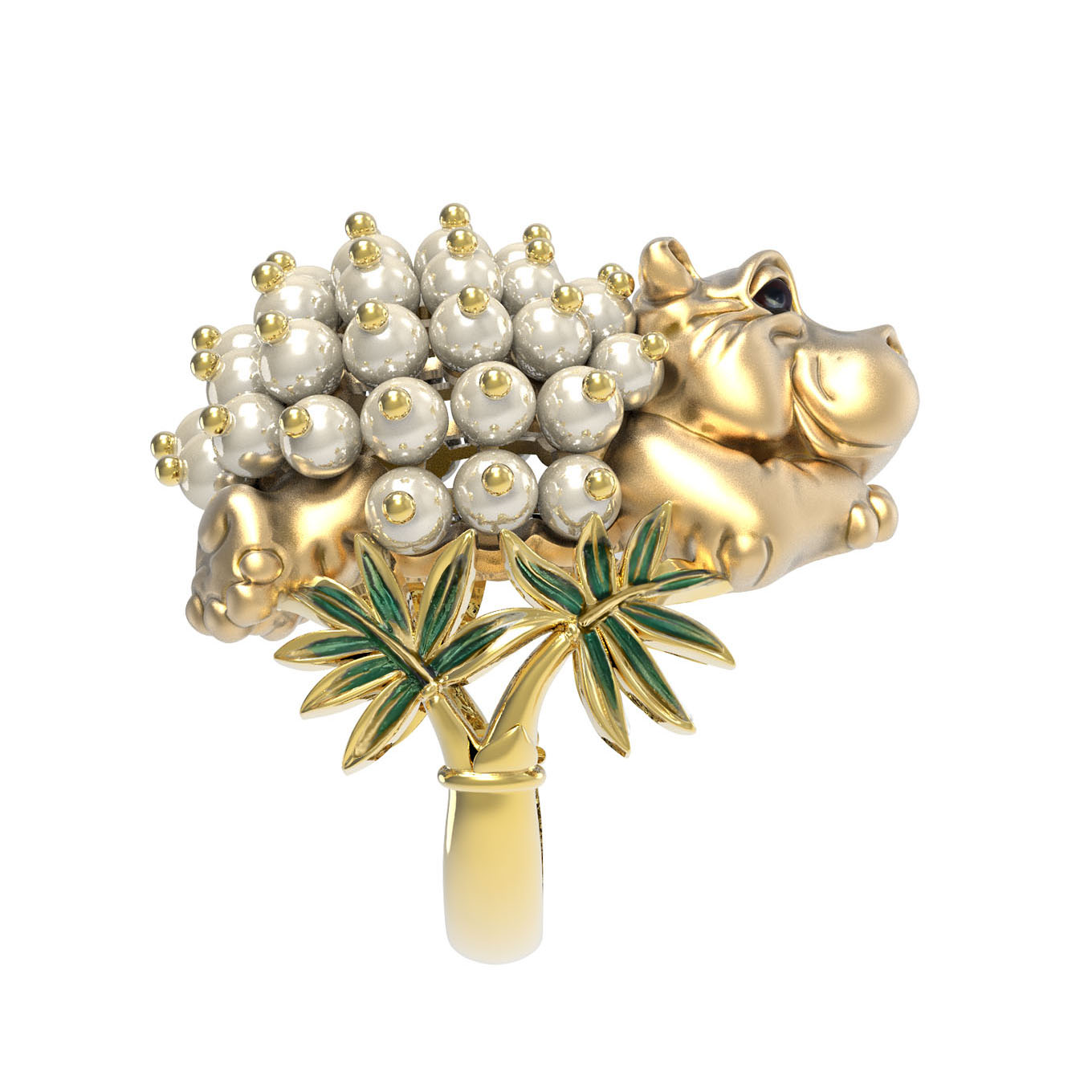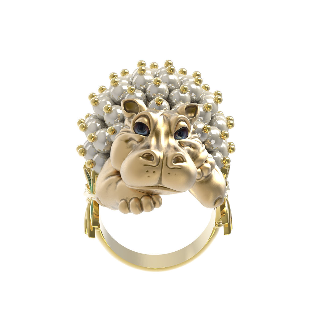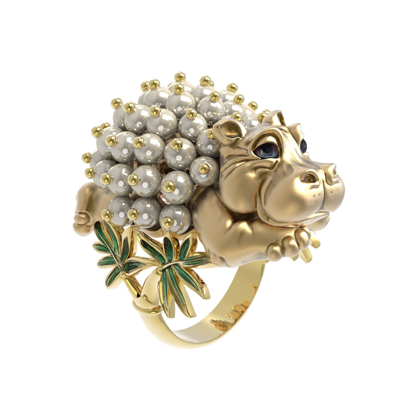 Центральной частью композиции стала фигурка бегемотика, спина которого инкрустирована 49 вставками жемчуга круглой формы с характерным белым сиянием. Детальная проработка форм и сочетание драгоценного металла с натуральными вставками делают это кольцо настоящим произведением искусства. Ювелирное изделие станет центральным акцентом вашего образа или прекрасным дополнением к другим украшениям из аналогичного комплекта.