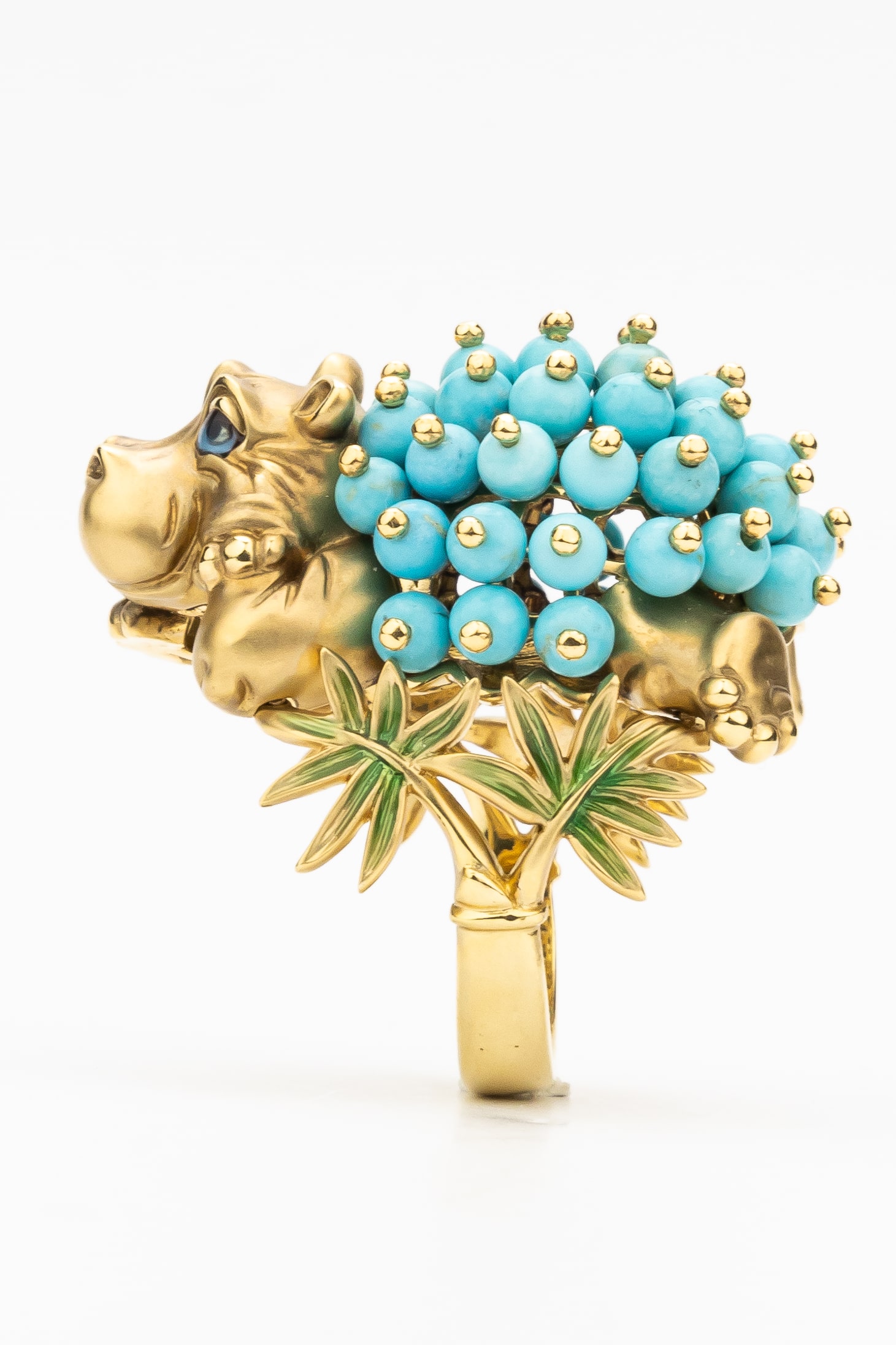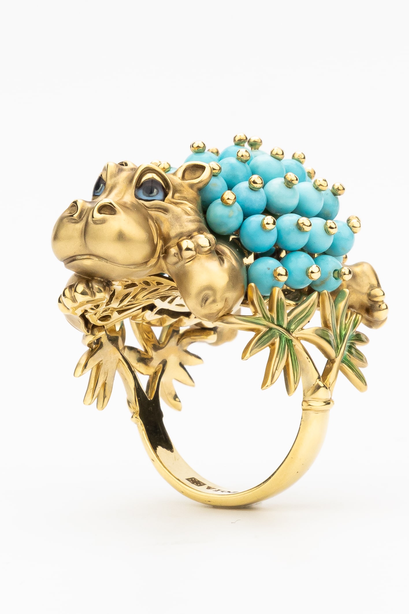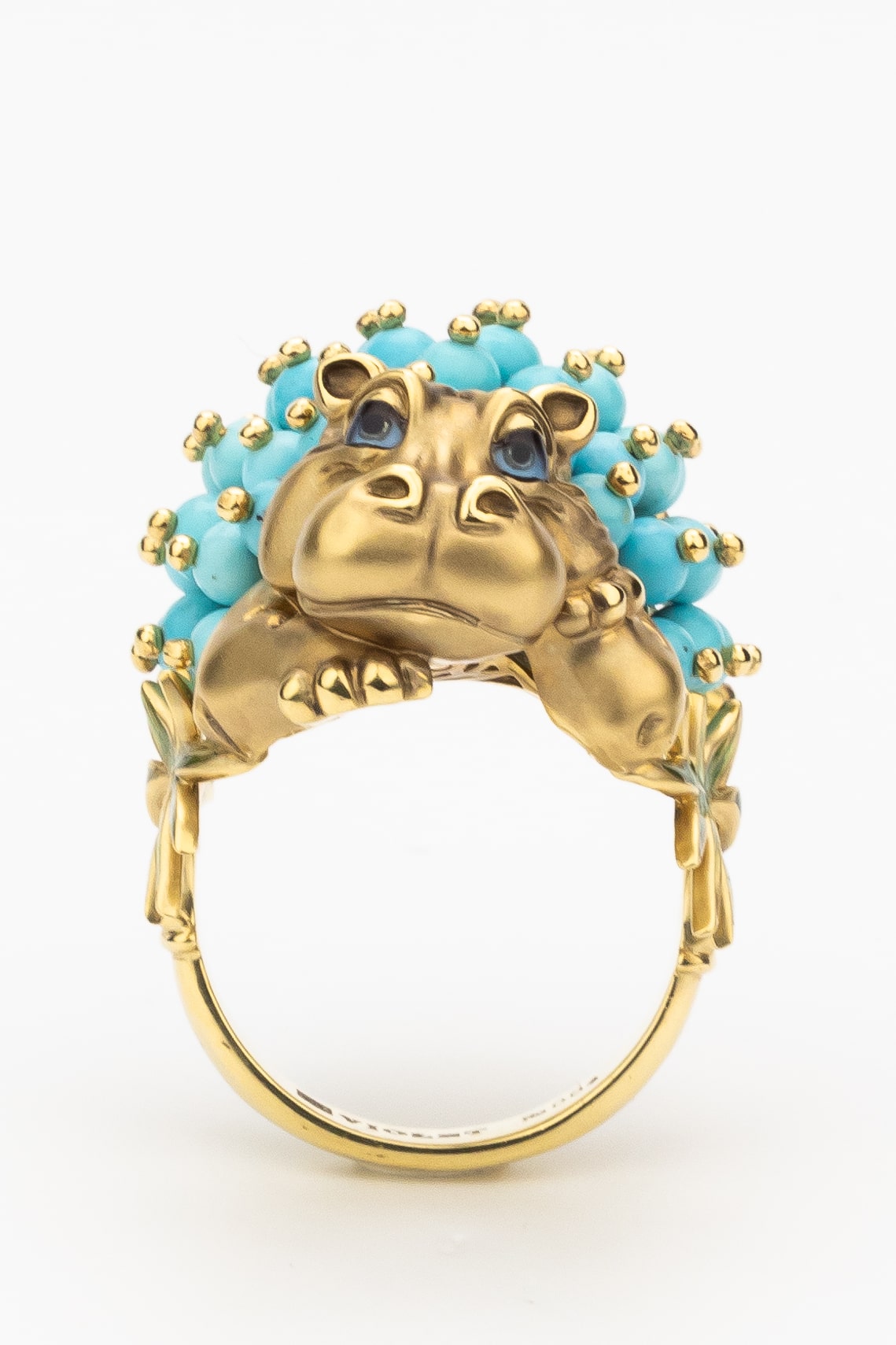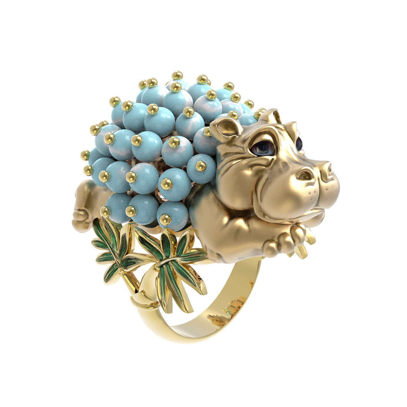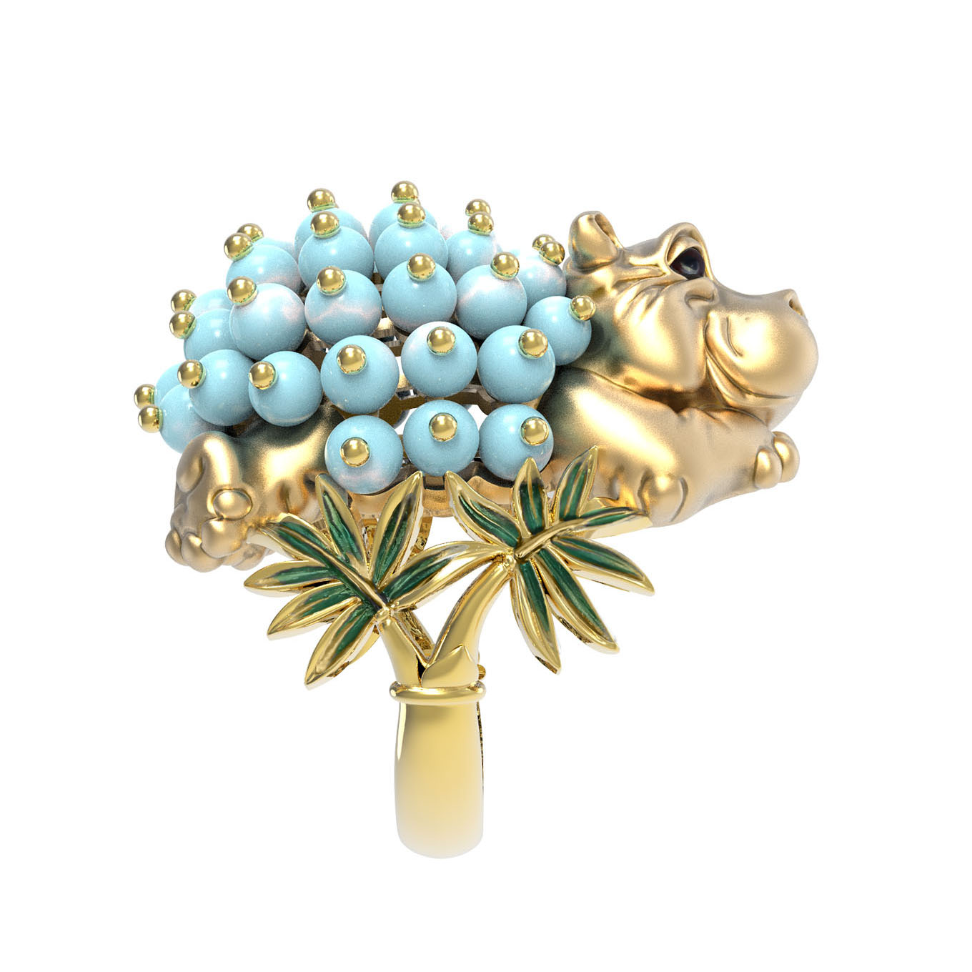 Представляем вашему вниманию оригинальное кольцо из лимонного золота 585 пробы, которое станет ярким акцентом в вашей коллекции украшений. Это изысканное изделие из коллекции De luxe Premium — Бегемотик выполнено в необычном дизайне с анималистичными мотивами и представляет собой искусную фигурку бегемотика. Ювелиры уделили особое внимание деталям: тело животного украшают 49 вставок из бирюзы в форме гладких бусин бирюзового цвета, создающих эффектный контраст с благородным металлом. Декоративные элементы в виде пальмовых листьев дополнены качественной разноцветной эмалью, что придает кольцу особый шарм и глубину.