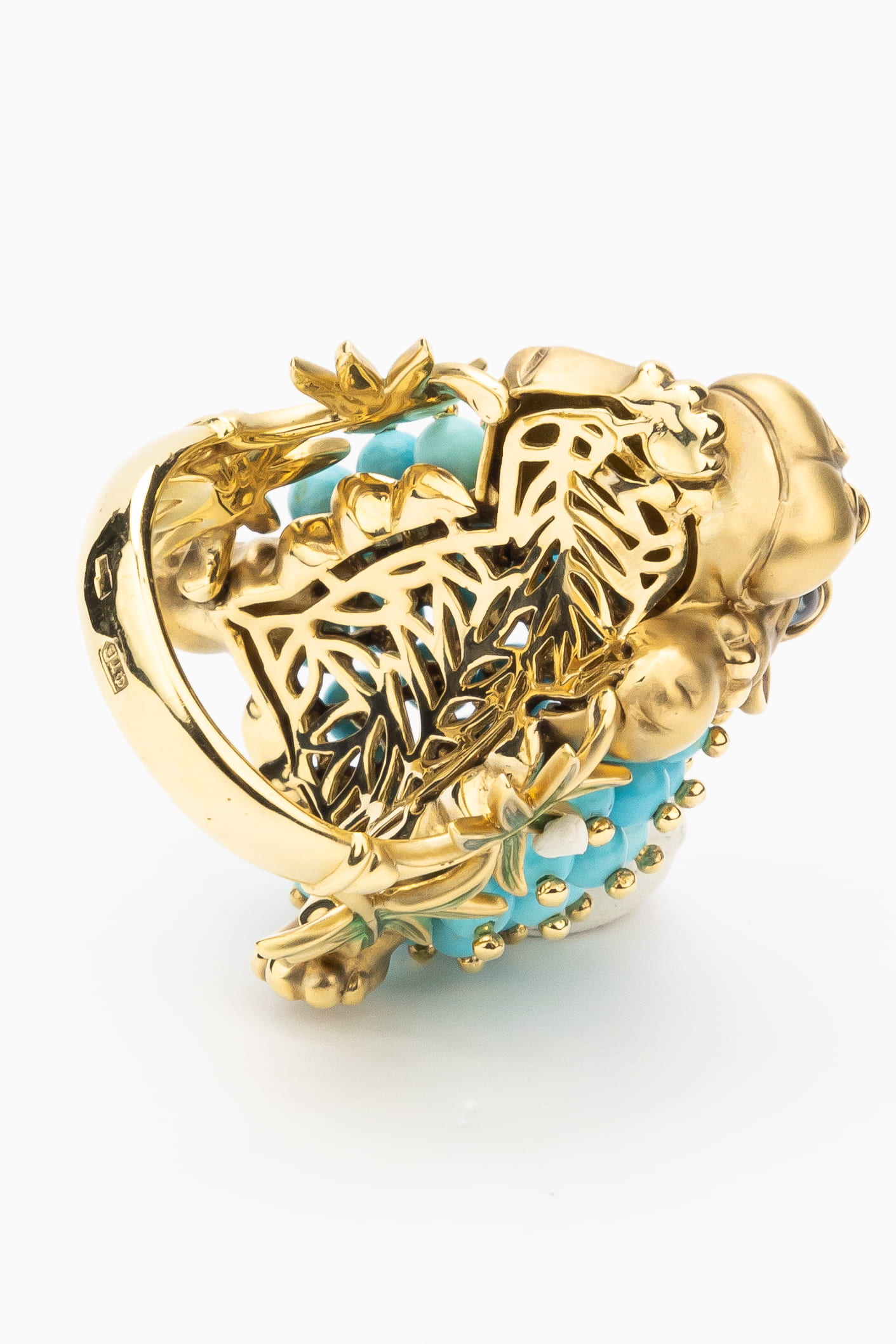 Это украшение создано для тех, кто ценит креативный подход и высокое ювелирное мастерство. Кольцо с бирюзой и эмалью подходит как для женщин, так и для мужчин, желающих подчеркнуть свою индивидуальность. Благодаря своей уникальной форме, оно идеально дополнит тематические комплекты ювелирных изделий. Мы предлагаем широкую размерную сетку от 15 до 23 размера, включая промежуточные варианты, чтобы украшение комфортно сидело на пальце любой полноты. Выбирая это кольцо из лимонного золота, вы приобретаете не просто аксессуар, а маленькое произведение искусства, способное поднять настроение и приковать восхищенные взгляды окружающих.