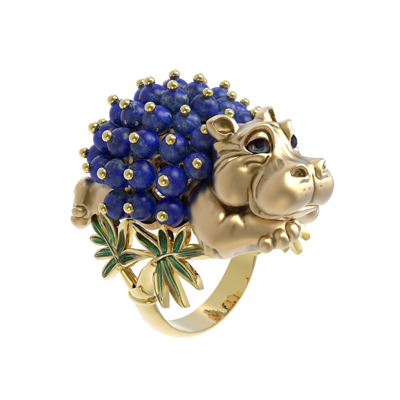 Особую художественную выразительность кольцу придает сочетание материалов. Основным акцентом дизайна стали 49 вставок из лазурита, которые имеют форму бусин и создают насыщенный синий цвет. Гармоничным дополнением выступает яркая эмаль, добавляющая разноцветные оттенки в композицию изделия. Декор в виде тропических растений с эмалевым покрытием придает украшению завершенность и живость.