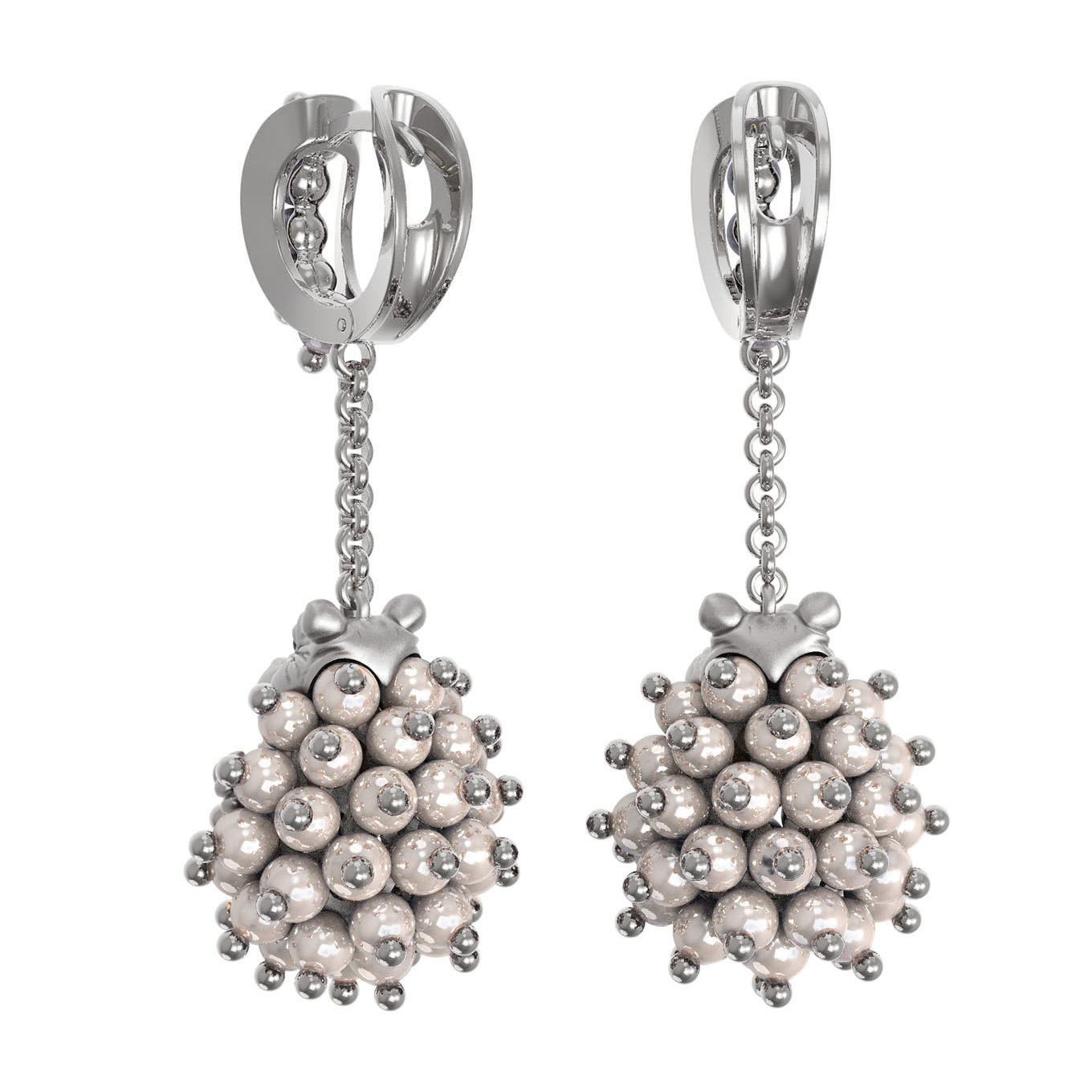 Серьги богато украшены вставками из жемчуга и эмали. Белый цвет жемчужин и разноцветные акценты эмали создают гармоничный контраст, подчеркивая благородство белого золота. Форма вставок — классический круг, что придает изделию особое очарование. Всего в украшении использовано 88 вставок, создающих объемную и фактурную композицию. Надежный замок обеспечивает комфортную носку в течение всего дня.