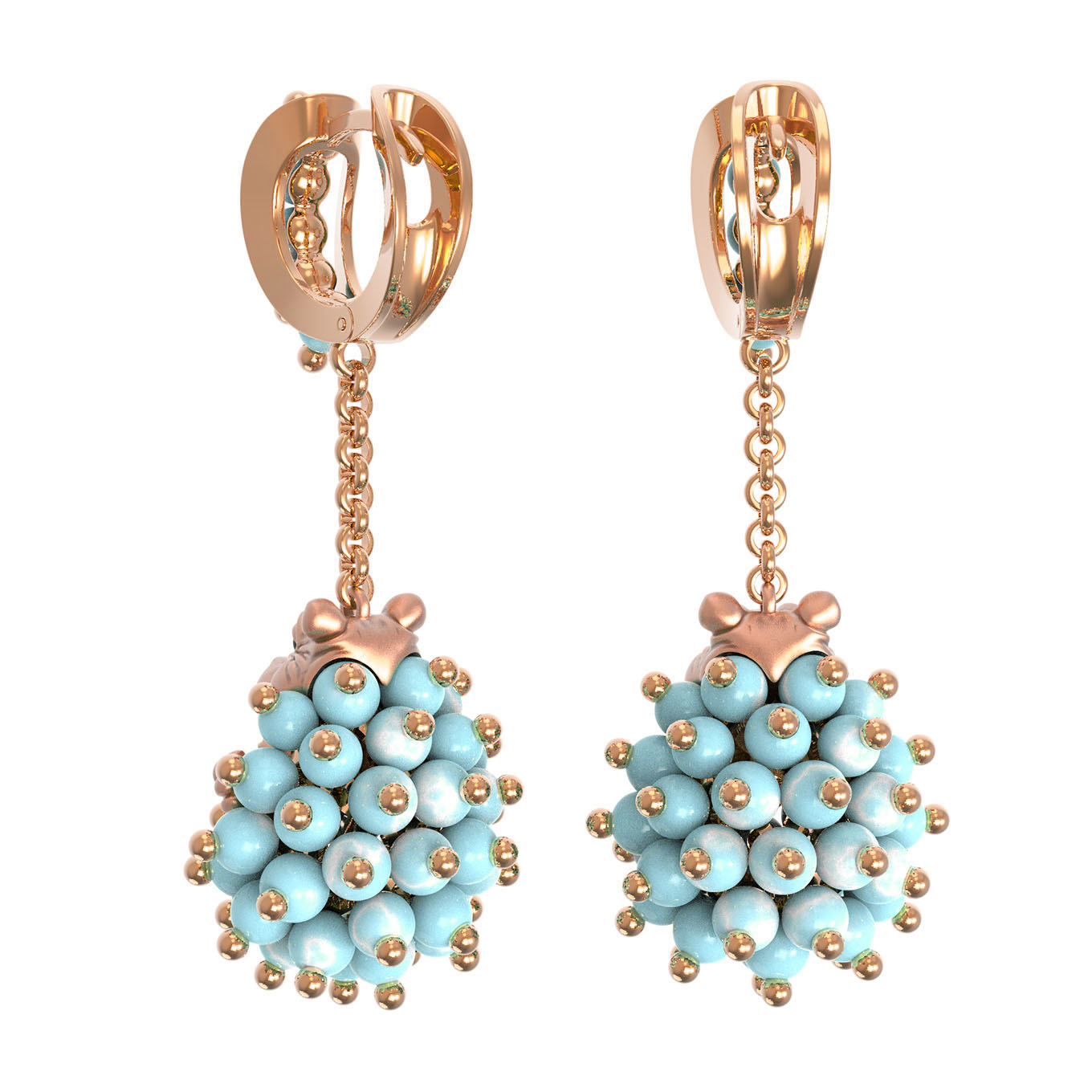 Центральным элементом композиции является искусная фигурка бегемотика, выполненная в анималистическом стиле и дополненная ювелирной эмалью. В оформлении использовано 120 вставок бирюзы в форме бусин бирюзового и разноцветного оттенков, которые создают эффектный объемный декор. Дизайн серег продуман до мелочей: подвесная часть с цепочкой придает украшению динамику и легкость.