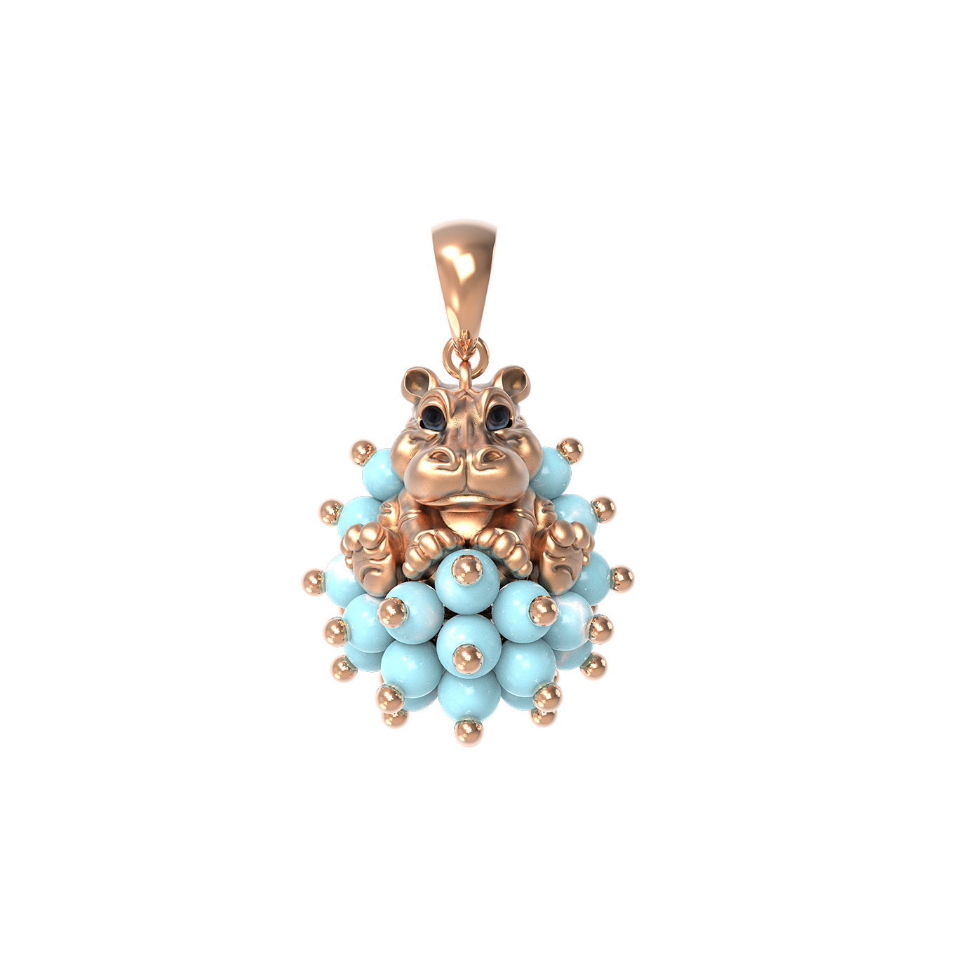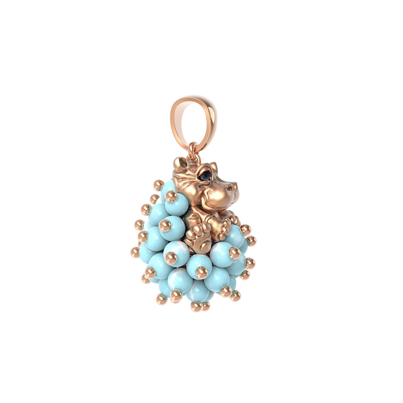 Особую выразительность подвеске придает мастерское сочетание материалов. Основная композиция дополнена вставками из натуральной бирюзы — это 55 бусин бирюзового цвета, которые создают эффектный контраст с золотой поверхностью. Детали образа подчеркнуты использованием разноцветной эмали, придающей изделию живость и художественную глубину.
