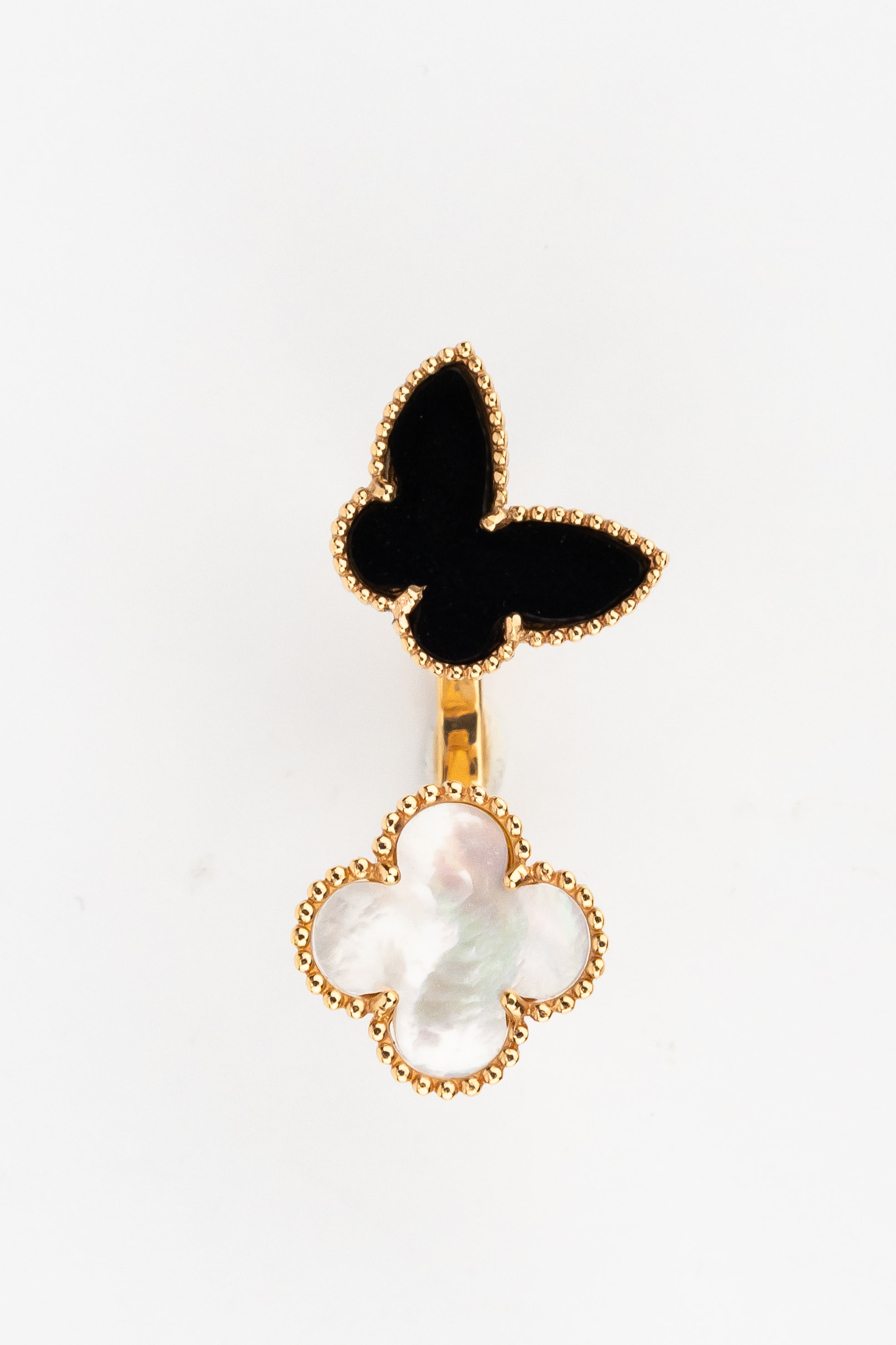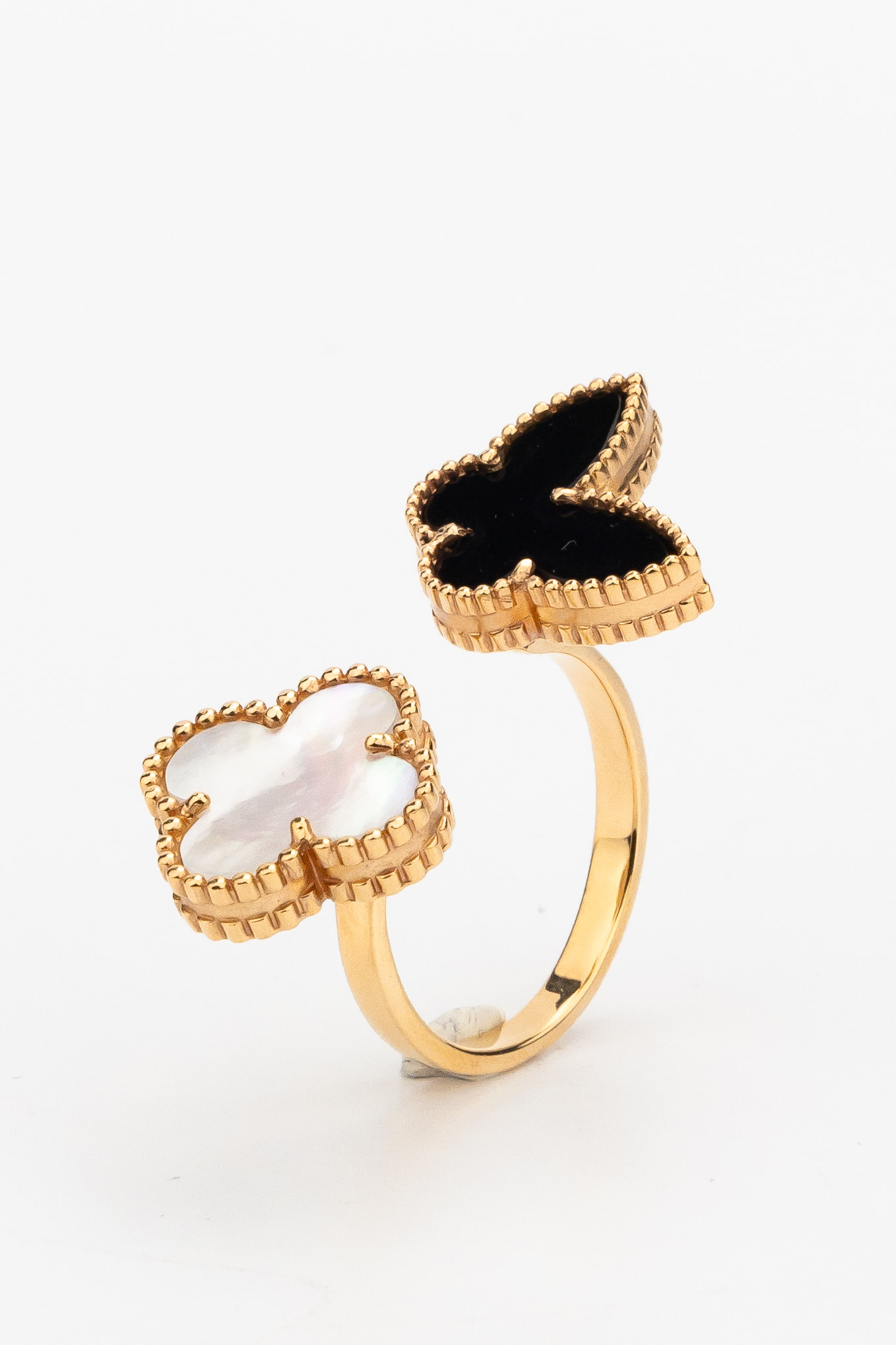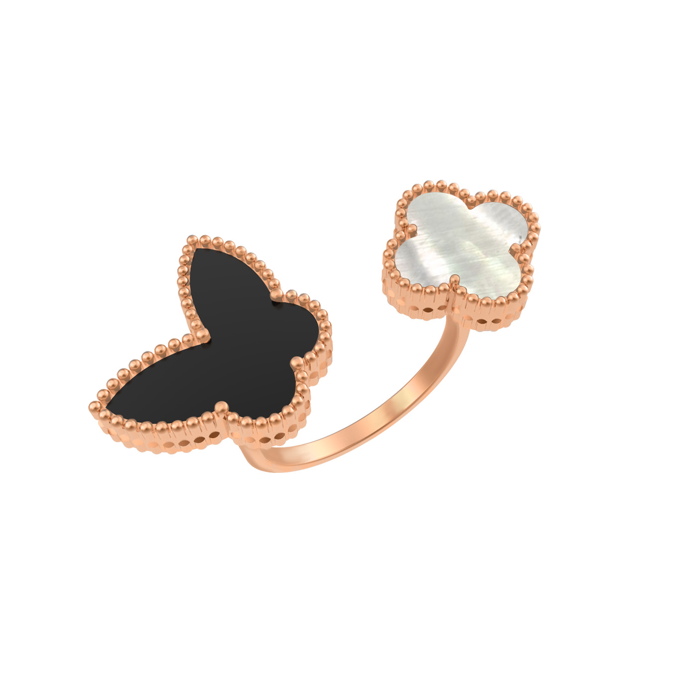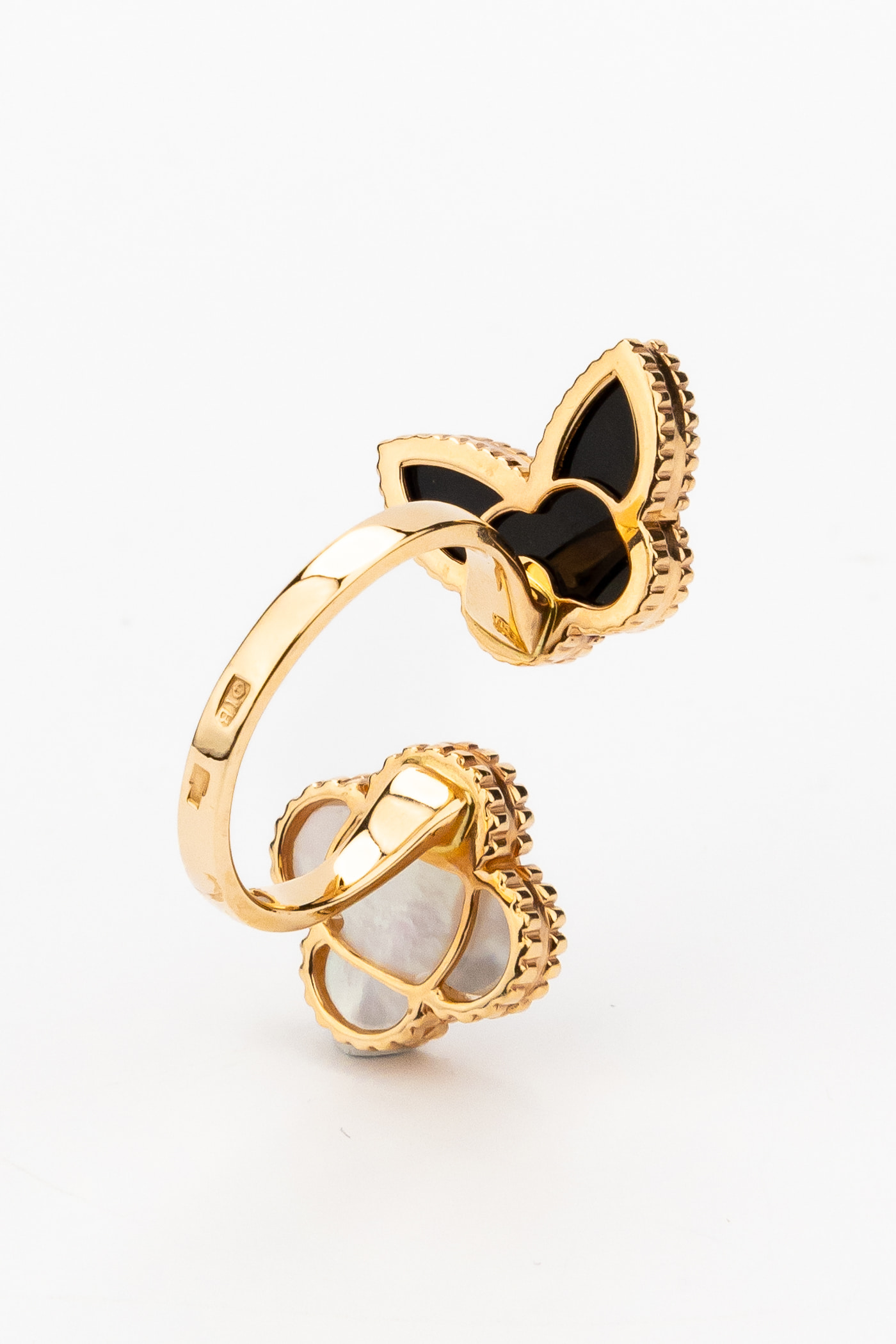 В центре композиции гармонично сочетаются благородные вставки: глубокий черный оникс и нежный переливающийся перламутр. Контраст черного и белого цветов придает ювелирному изделию особую выразительность и глубину. Оформление края каждой вставки выполнено с филигранной точностью, что добавляет изделию фактурности и дополнительного блеска. Это кольцо входит в коллекцию De Luxe — Бабочки, что позволяет легко дополнить его другими аксессуарами для создания стильного комплекта.