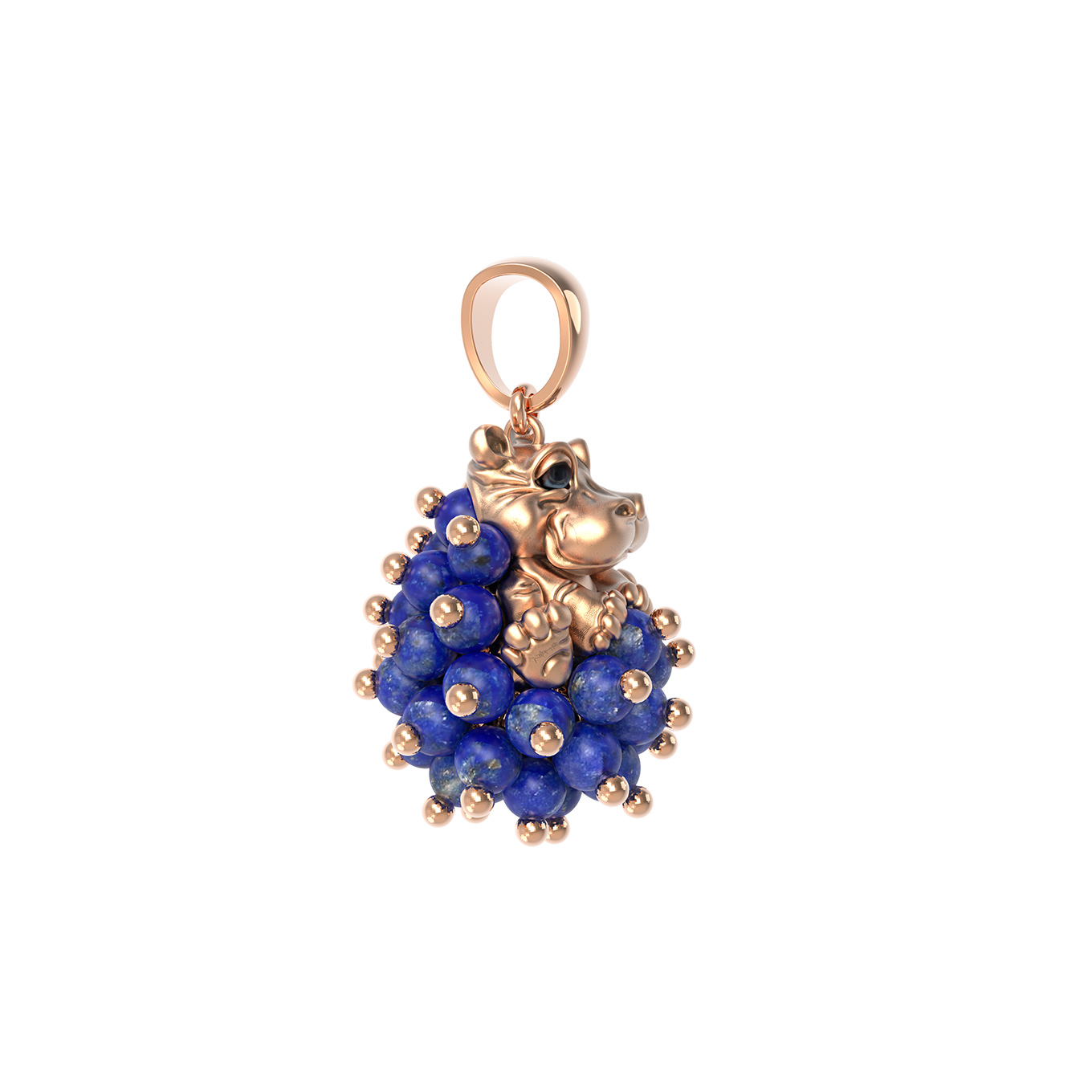 Особую художественную ценность подвеске придает инкрустация 55 вставками из лазурита. Натуральные камни имеют форму аккуратной бусины и создают эффектный контраст с золотой основой, формируя роскошный объемный силуэт. Разноцветные акценты вставок добавляют украшению динамики и делают его заметным аксессуаром.