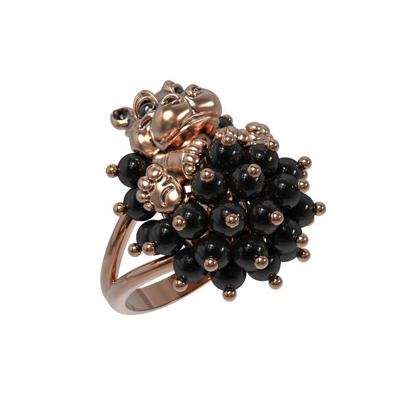 Особый шарм изделию придает богатая инкрустация: композиция включает 26 вставок из оникса черного цвета, выполненных в форме бусин. Глубокий блеск камня эффектно контрастирует с теплым оттенком красного золота. В оформлении также использована ювелирная эмаль, добавляющая разноцветные акценты и глубину общему художественному образу кольца.