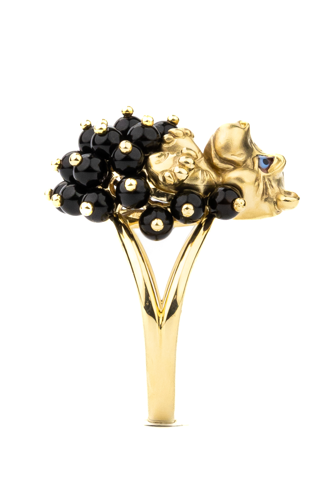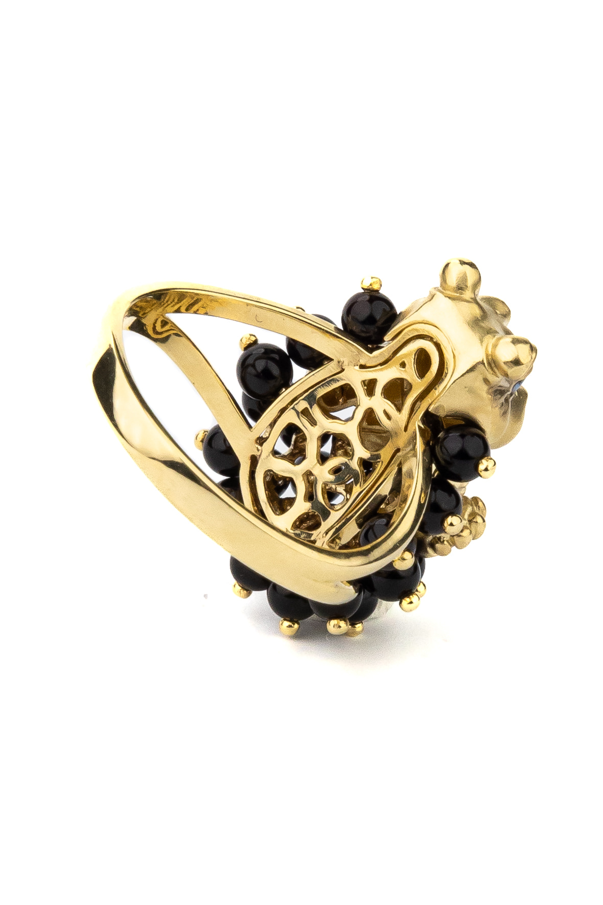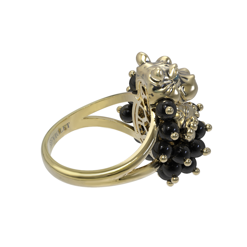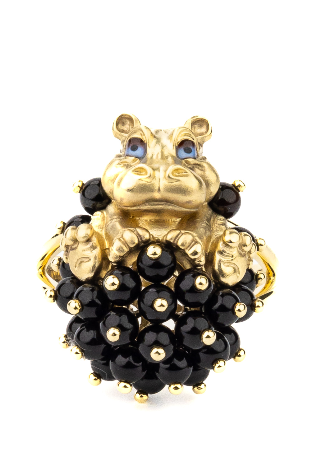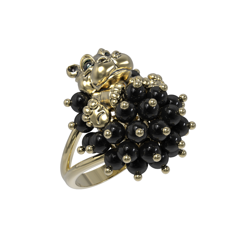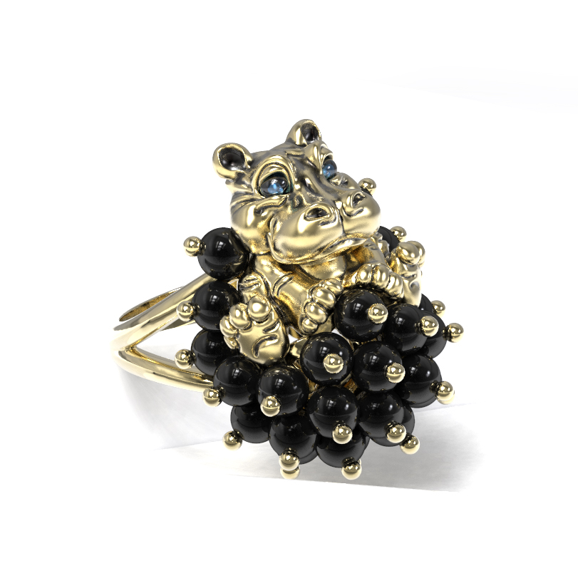 Кольцо из лимонного золота 585 пробы из коллекции De luxe Premium — Бегемотик — это ювелирное воплощение смелого дизайна, вдохновленного анималистичными мотивами. Главный акцент украшения — искусное изображение милого бегемотика, выполненное с использованием эмали и дополненное россыпью драгоценных вставок. Очаровательный зверек словно окружен пышным облаком из 26 черных ониксов в форме бусин, создающих эффектный контраст с благородным блеском металла.